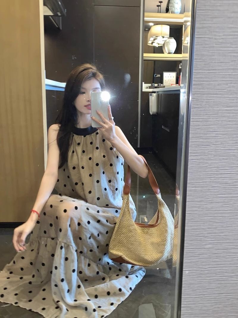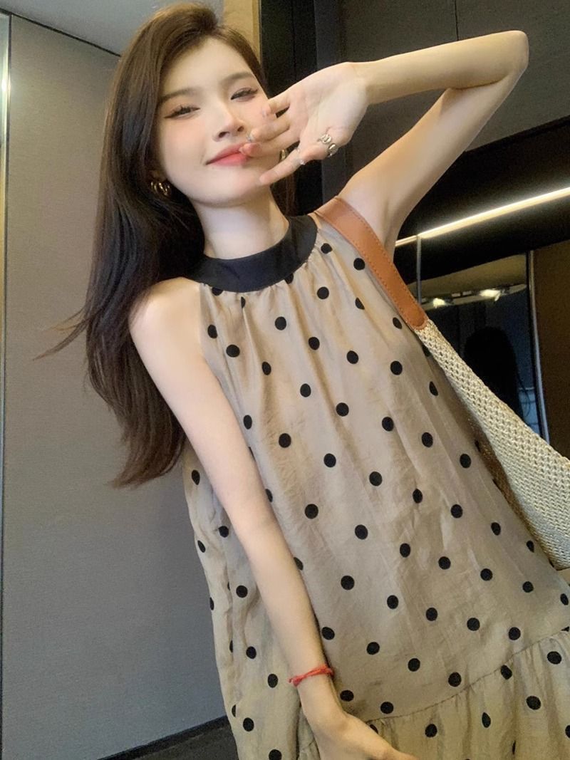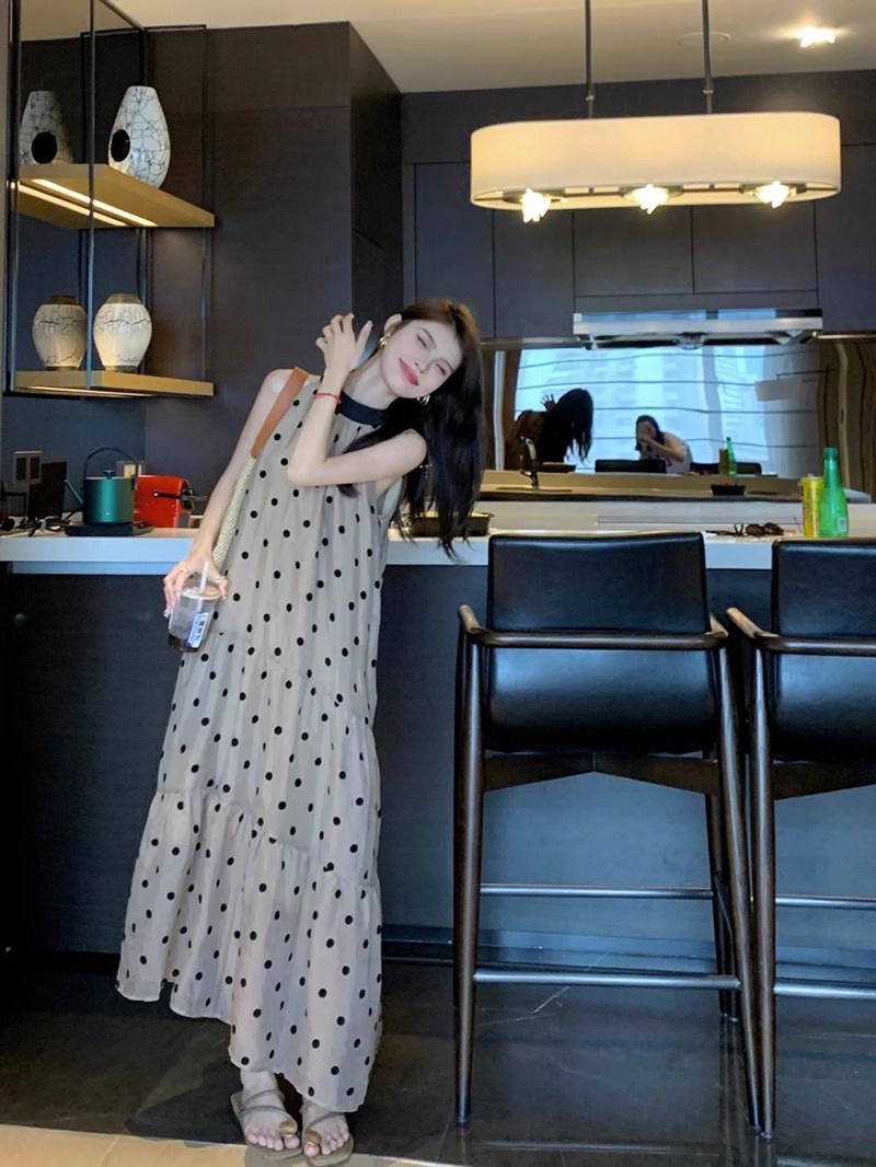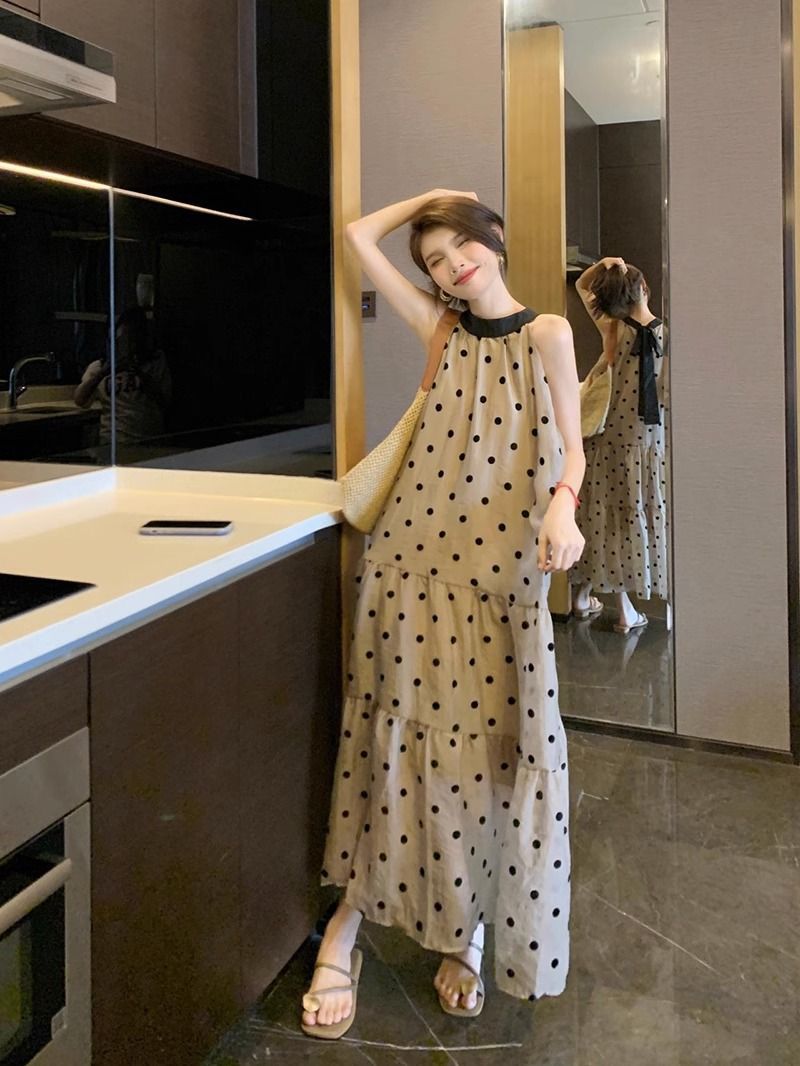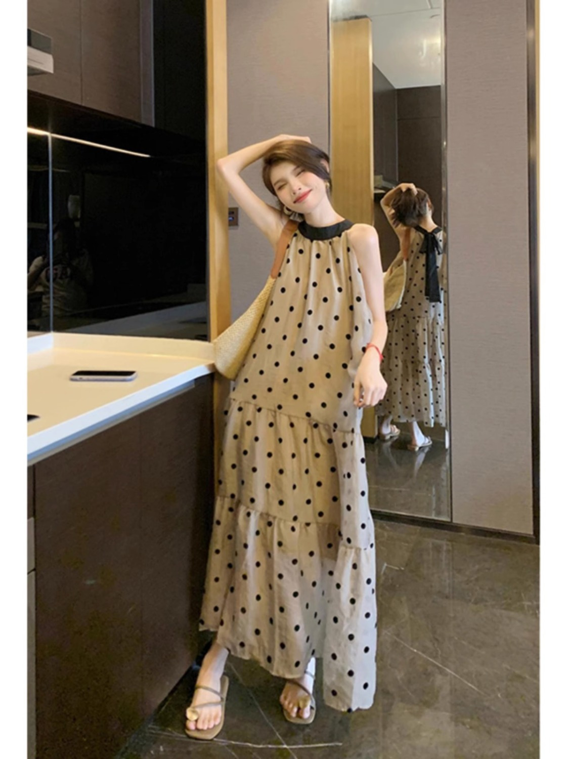 프랑스 스타일 민소매 점 슬링 원피스 여성 여름 새로운 해변 휴가 작은 우아한 긴 원피스