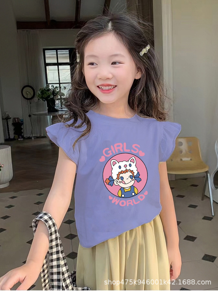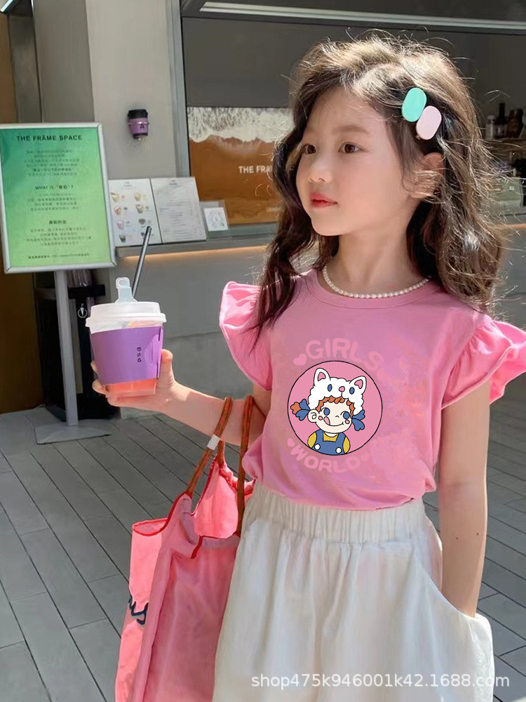 국경 간 새우 스킨 동남아 소녀 작은 비행 소매 한국식 만화 티셔츠 여름면 서양식 반팔 어린이 탑