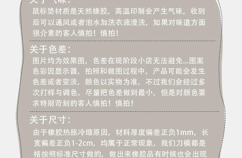 (3)橡胶味道问题:橡胶产品要没有味道就不是橡胶的了,我们工厂的鼠标垫都是无臭味的,橡胶本身的味道多少都是有点的。这属于正常味道,刚制作出来味道会浓一些, 因为是经过高温热转印,收到货品后放在通风处一段时间就好了,一般不贴近鼻子是闻不到的。