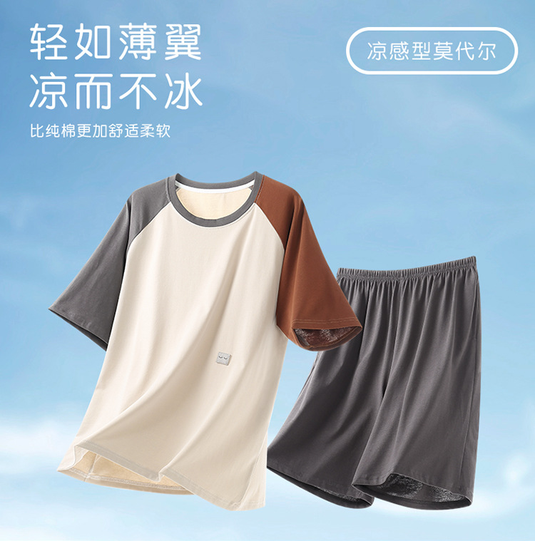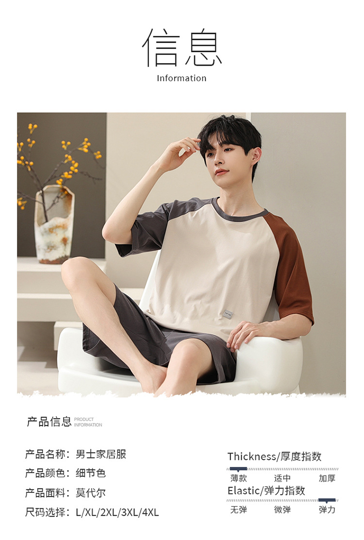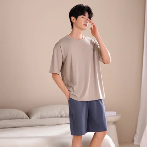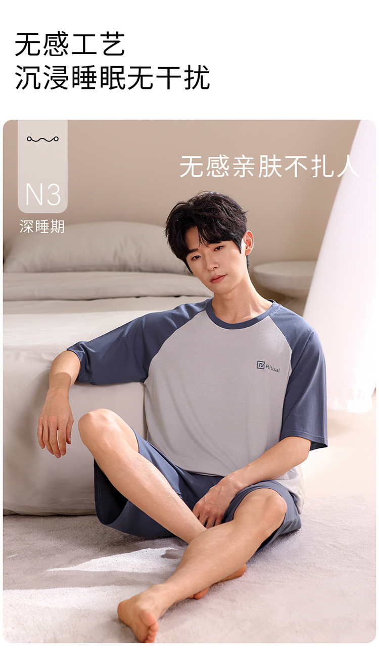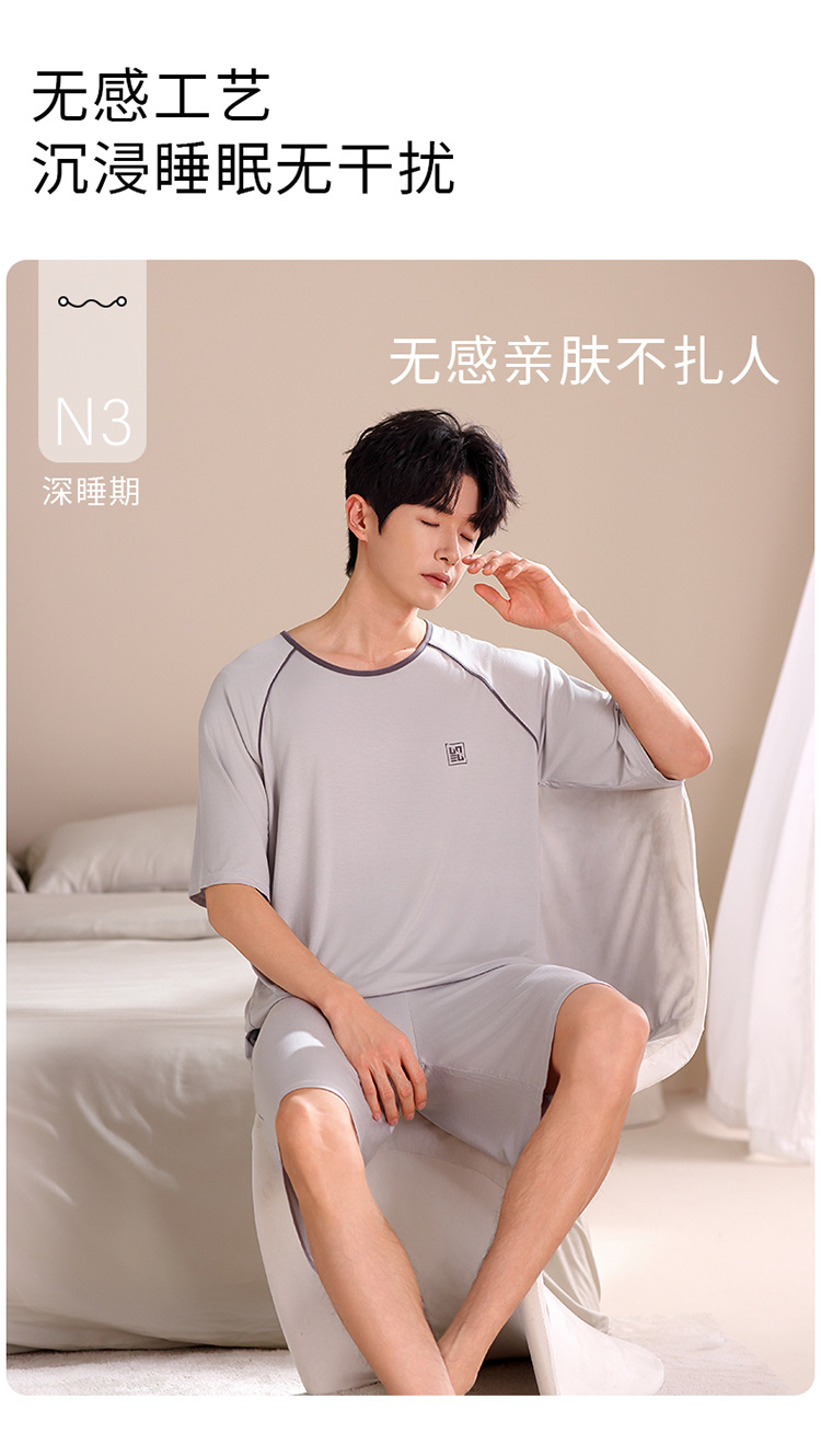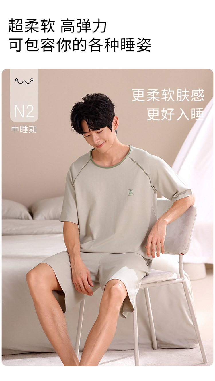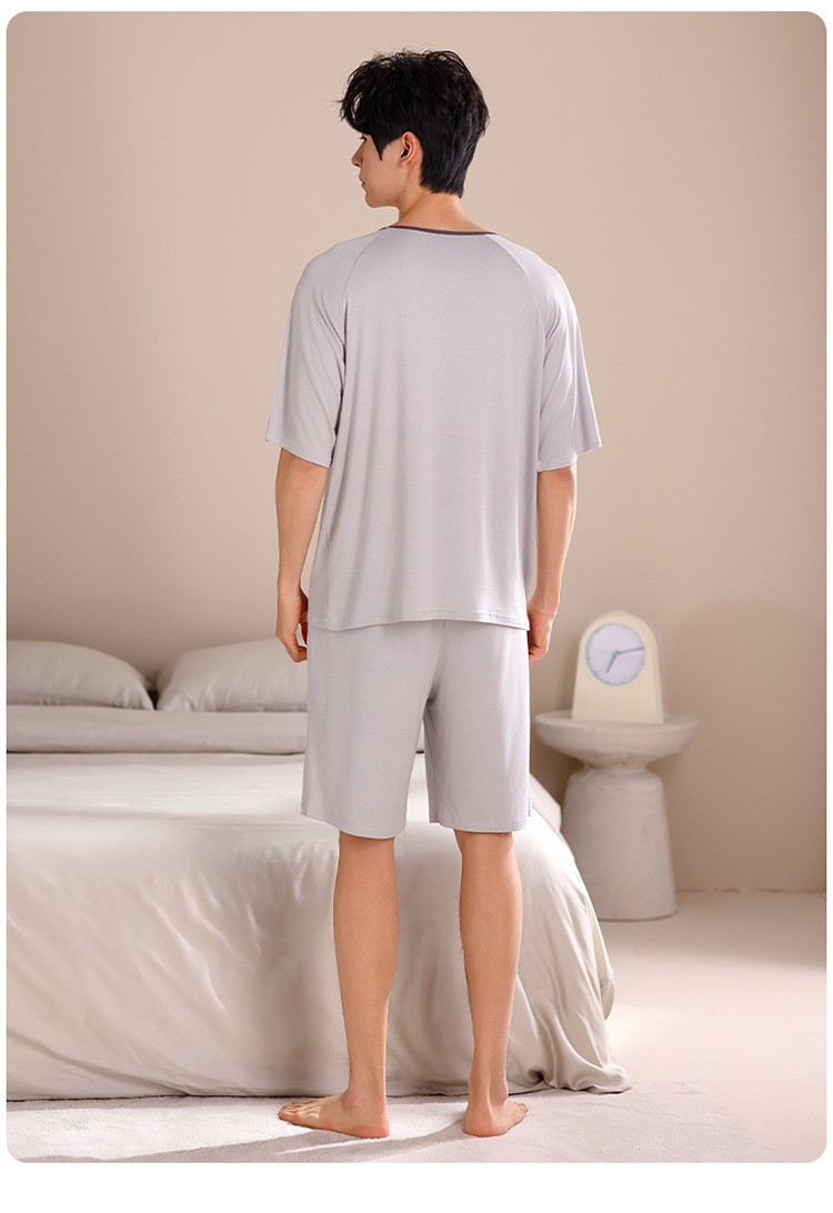 2024 새로운 모달 남성 잠옷 여름 얇은 반팔 반바지 둥근 목 단색 가정복 세트스토어 가기