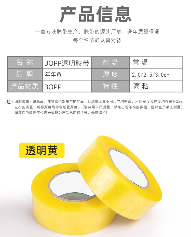 • 투명한 노란색; 폭 5.0x 두께 3.0x 길이 200 (전체 상자에 30 롤이 필요합니다)