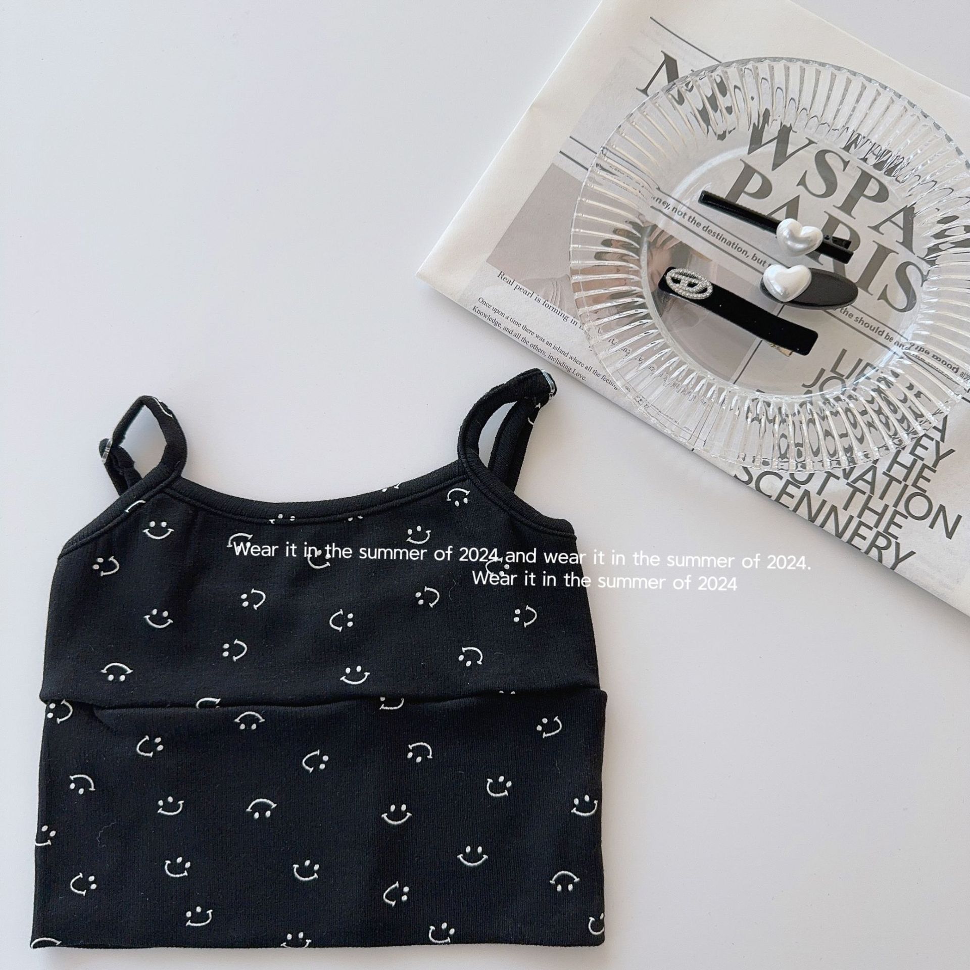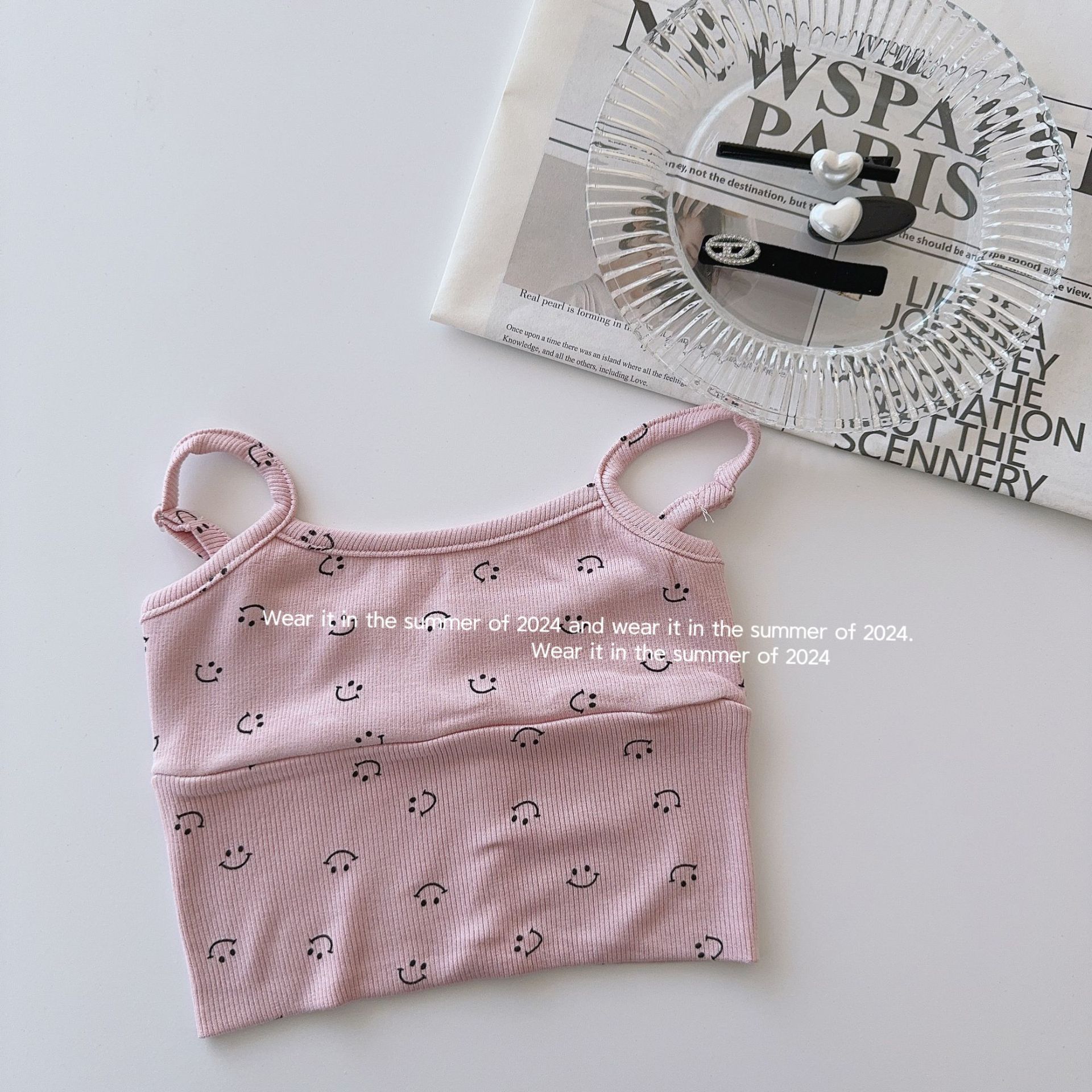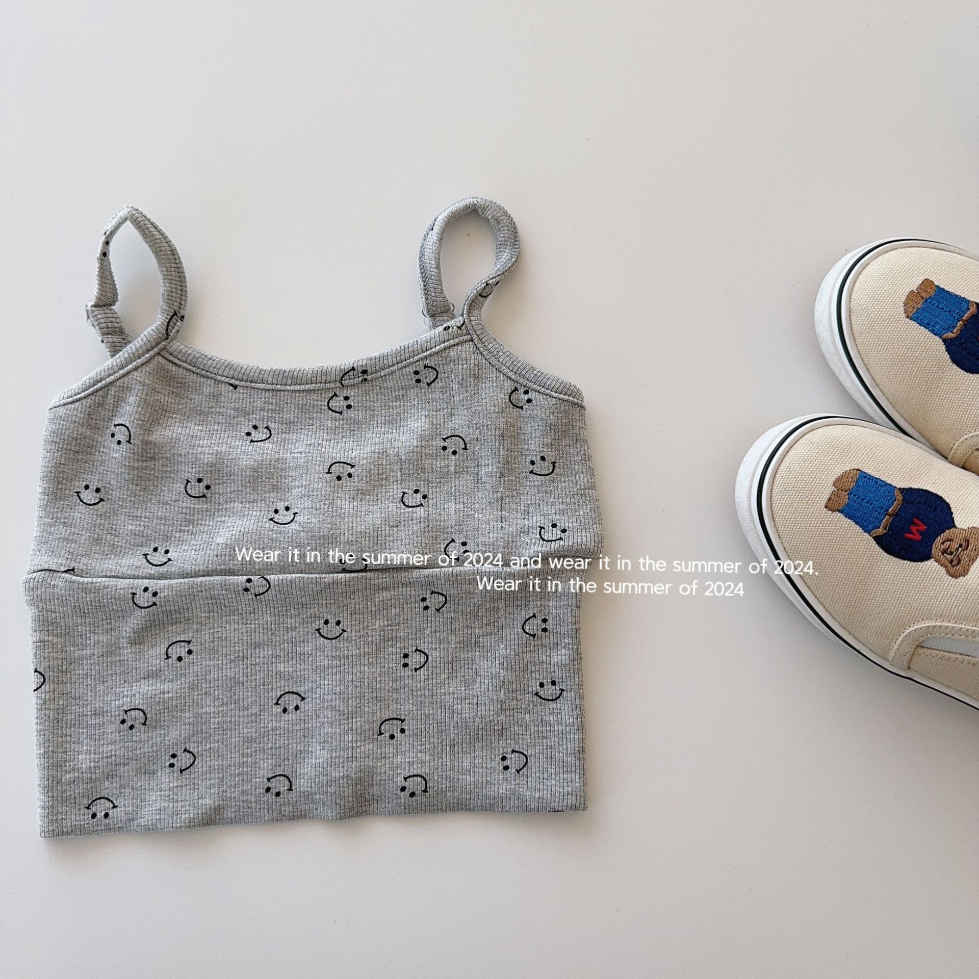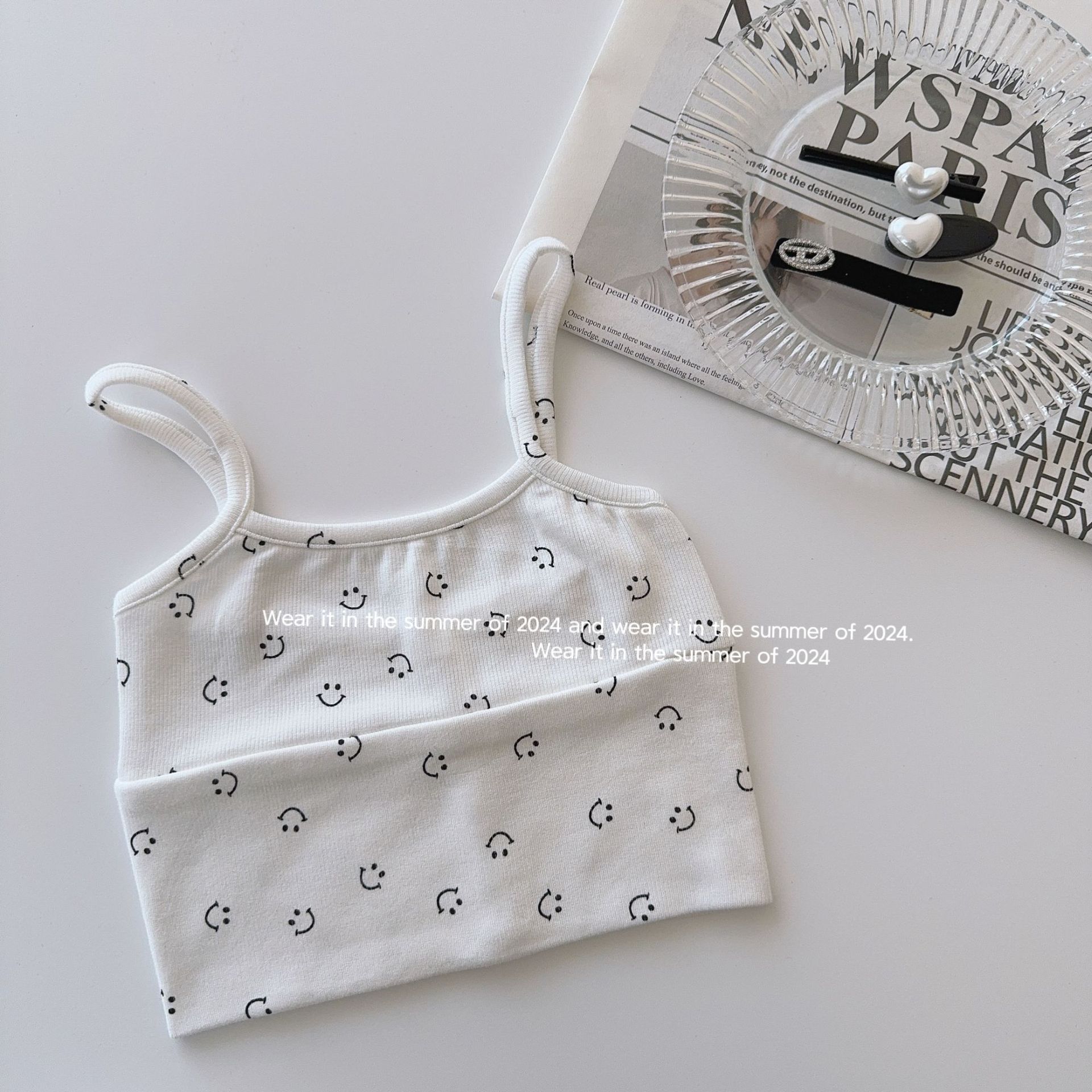 Taoqi 아동복 2024 어린이 상쾌한 컬러 스마일리 티셔츠 걸스 올 매치 스트라이프 작은 조끼 여름을위한 민소매 탑