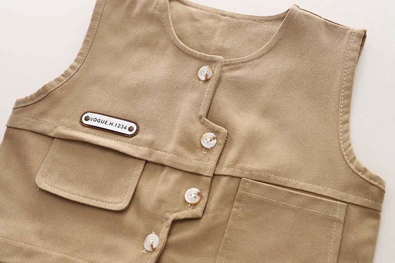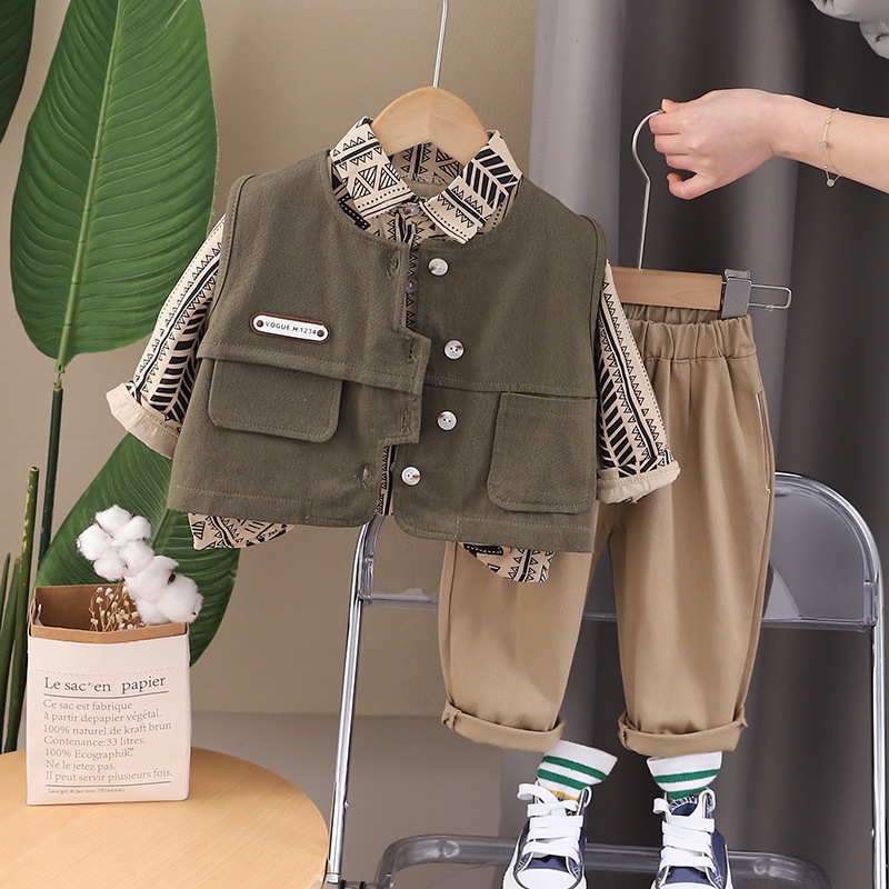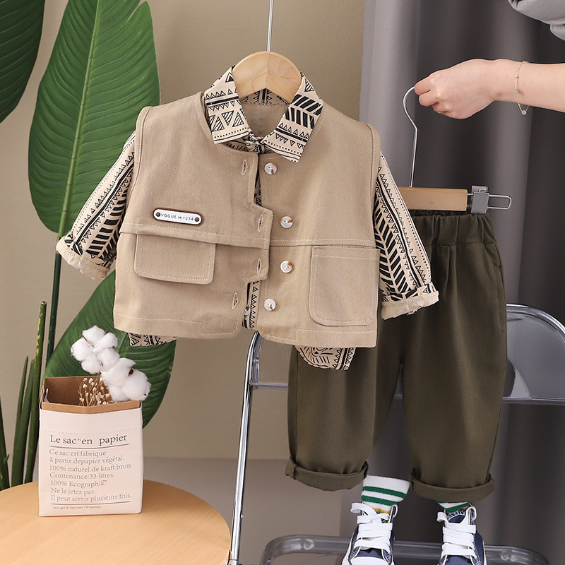 2024 봄 새 소년 마름모 스티칭 작업복 조끼 긴 소매 3 피스 소년 셔츠 캐주얼 바지 세트