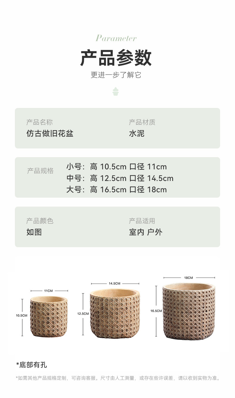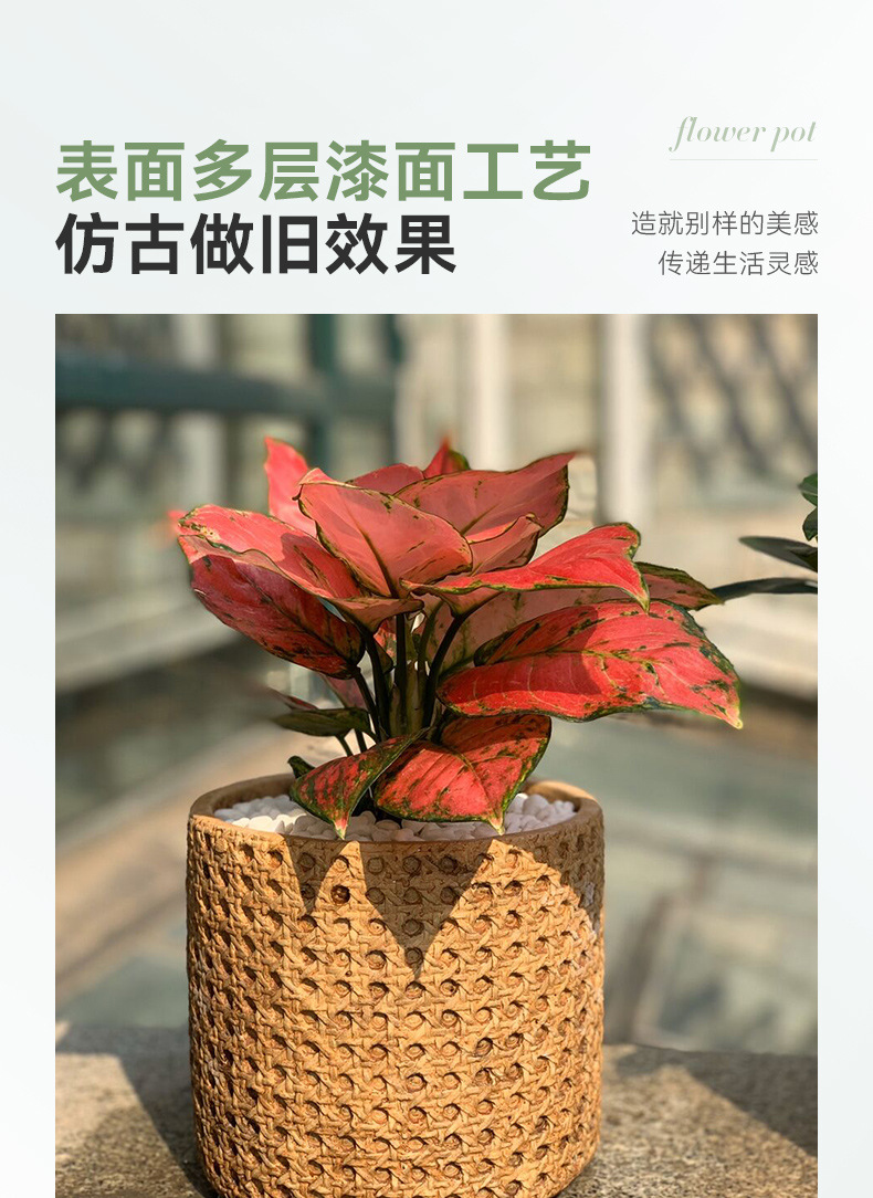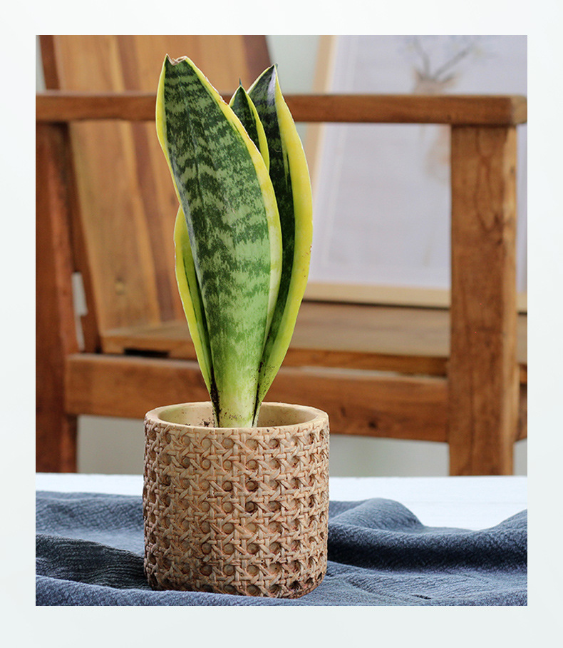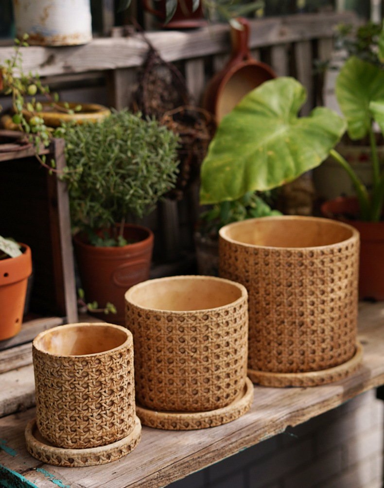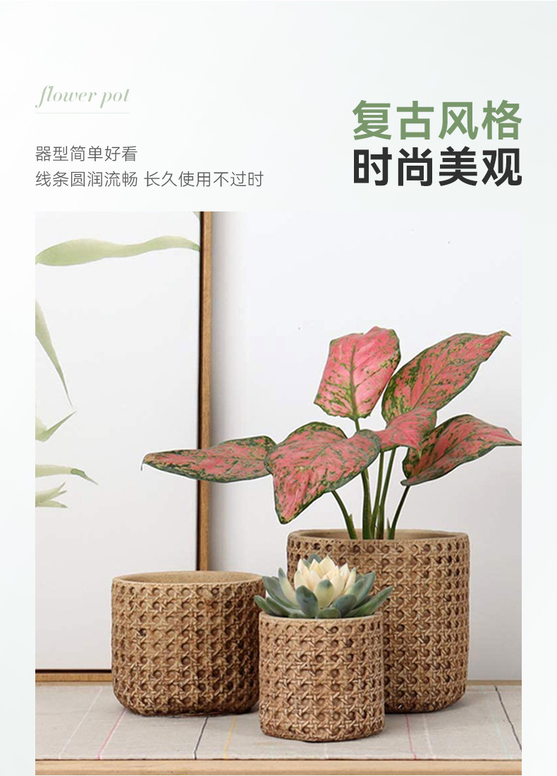 일본식 대나무 짠 등나무 짠 세라믹 냄비, 복고풍 시멘트 화분, 목재 스타일의 녹색 식물 냄비 세트
