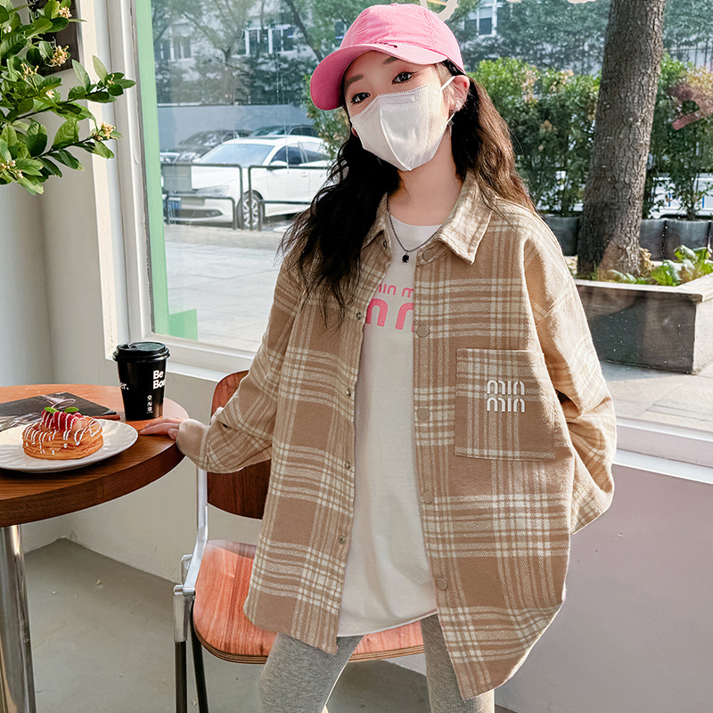 소녀 셔츠 봄 2024 새로운 어린이 봄과 가을 격자 무늬 카디건 미디어와 큰 아이들의 느슨한 세련된 셔츠 코트 패션