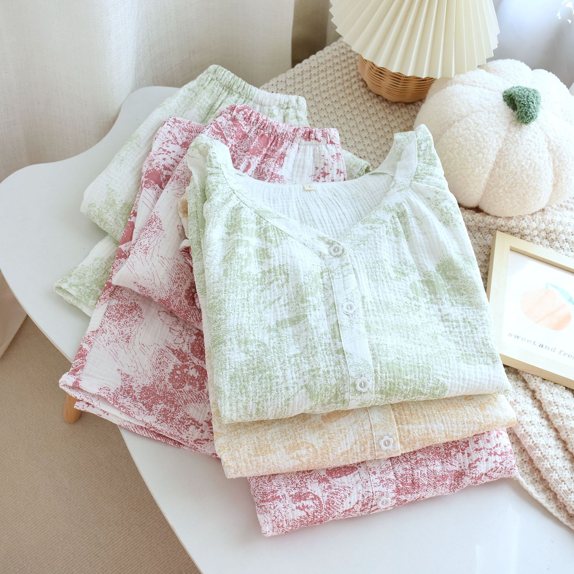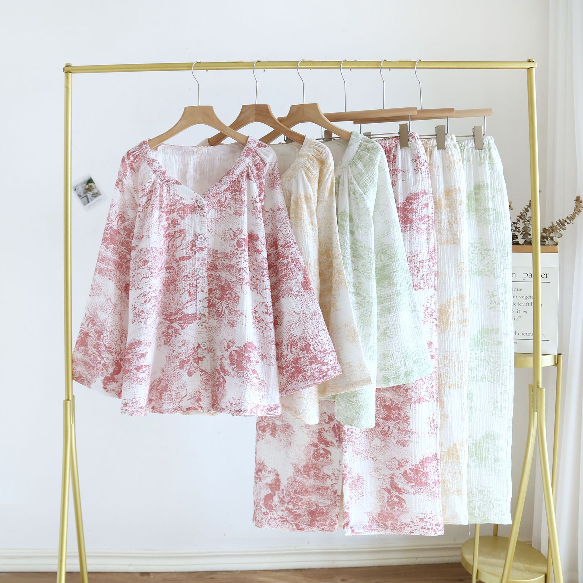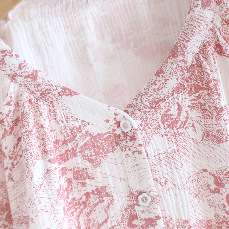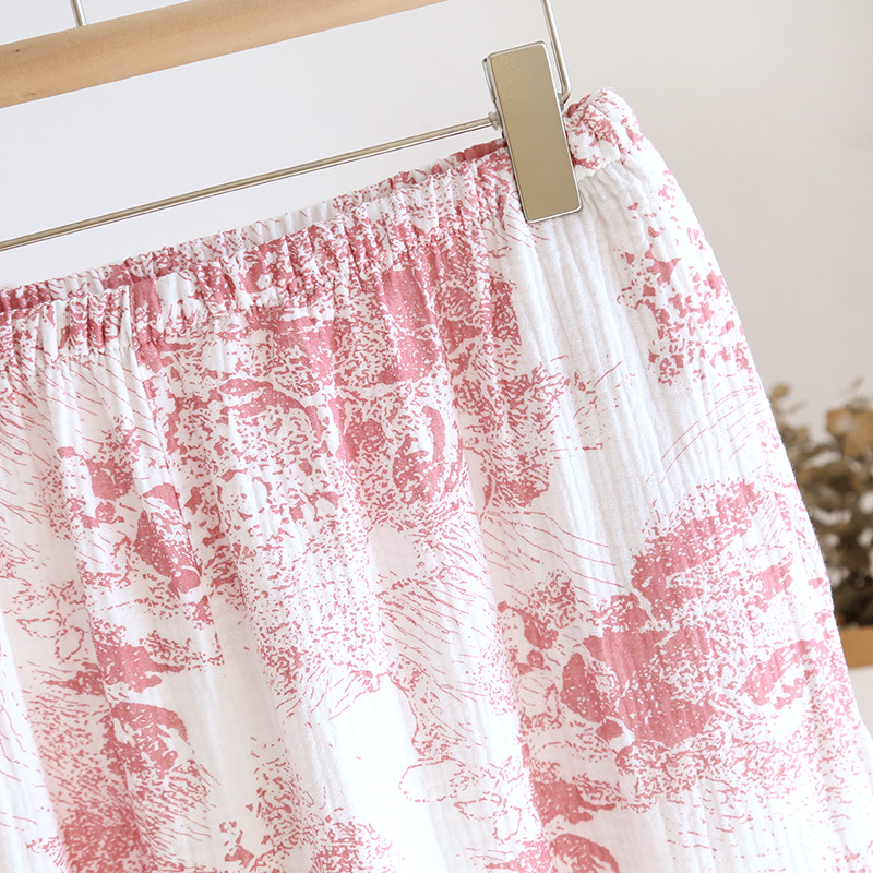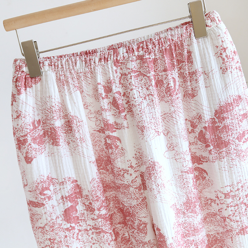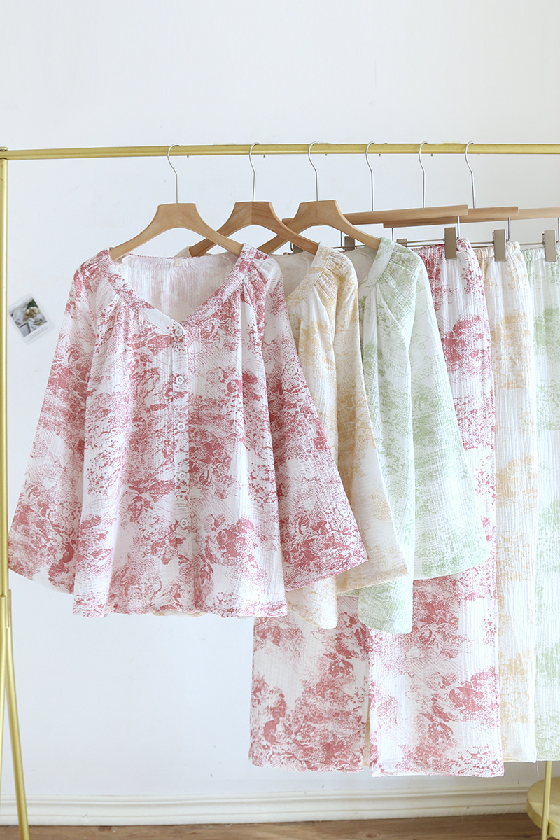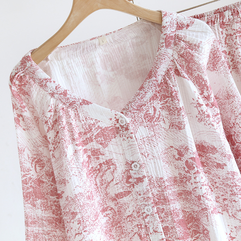 봄, 여름, 가을 사계절 새로운 순수 면화 여성의 긴팔 바지 파자마 더블 레이어 코튼 원사 캐주얼 간단한 가정복 세트스토어 가기