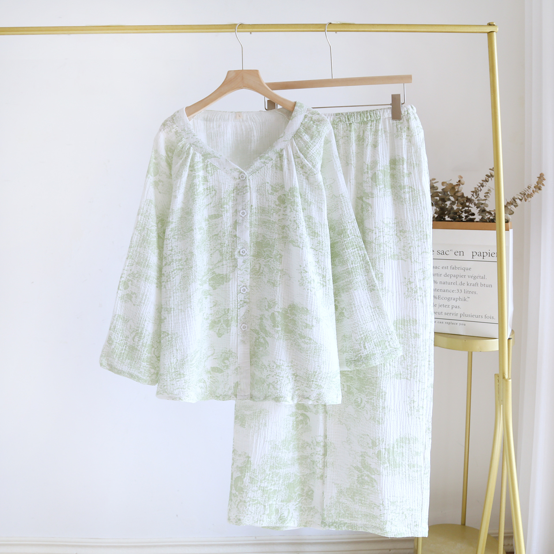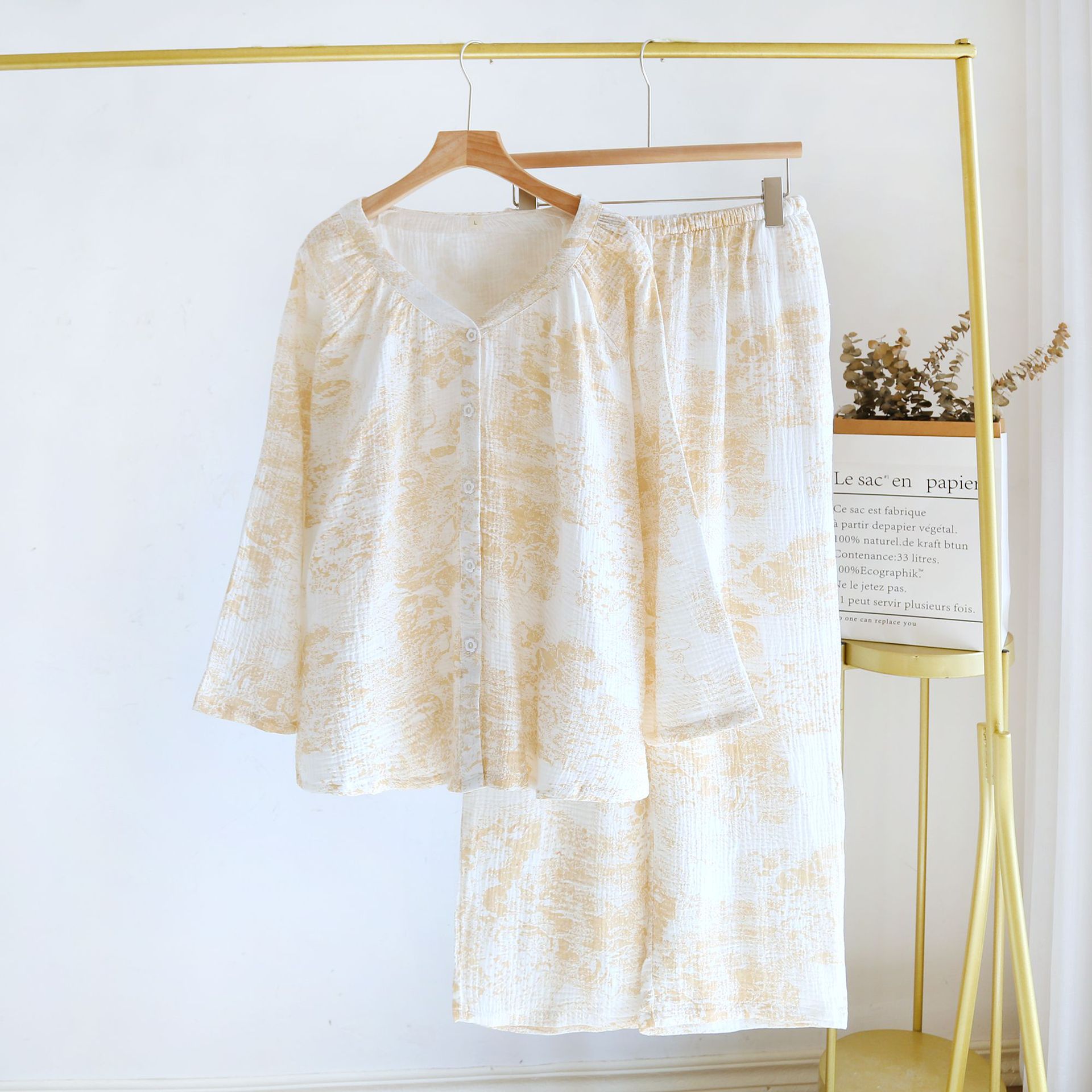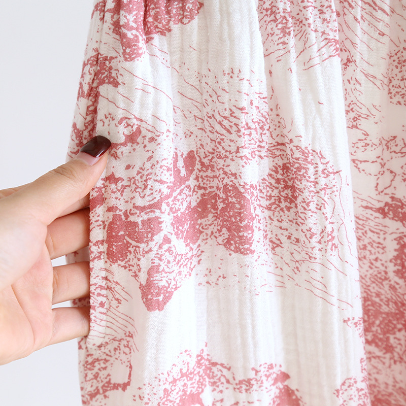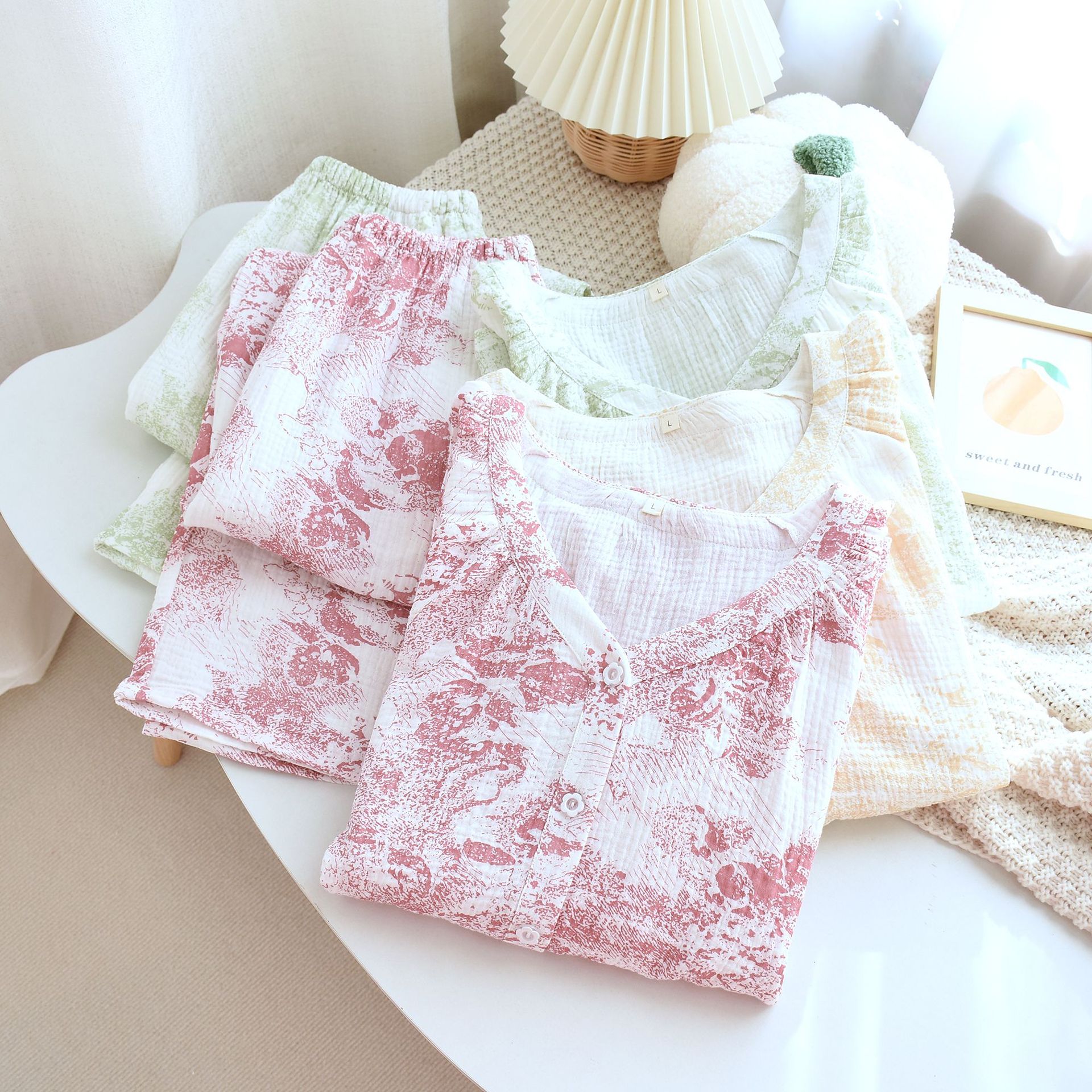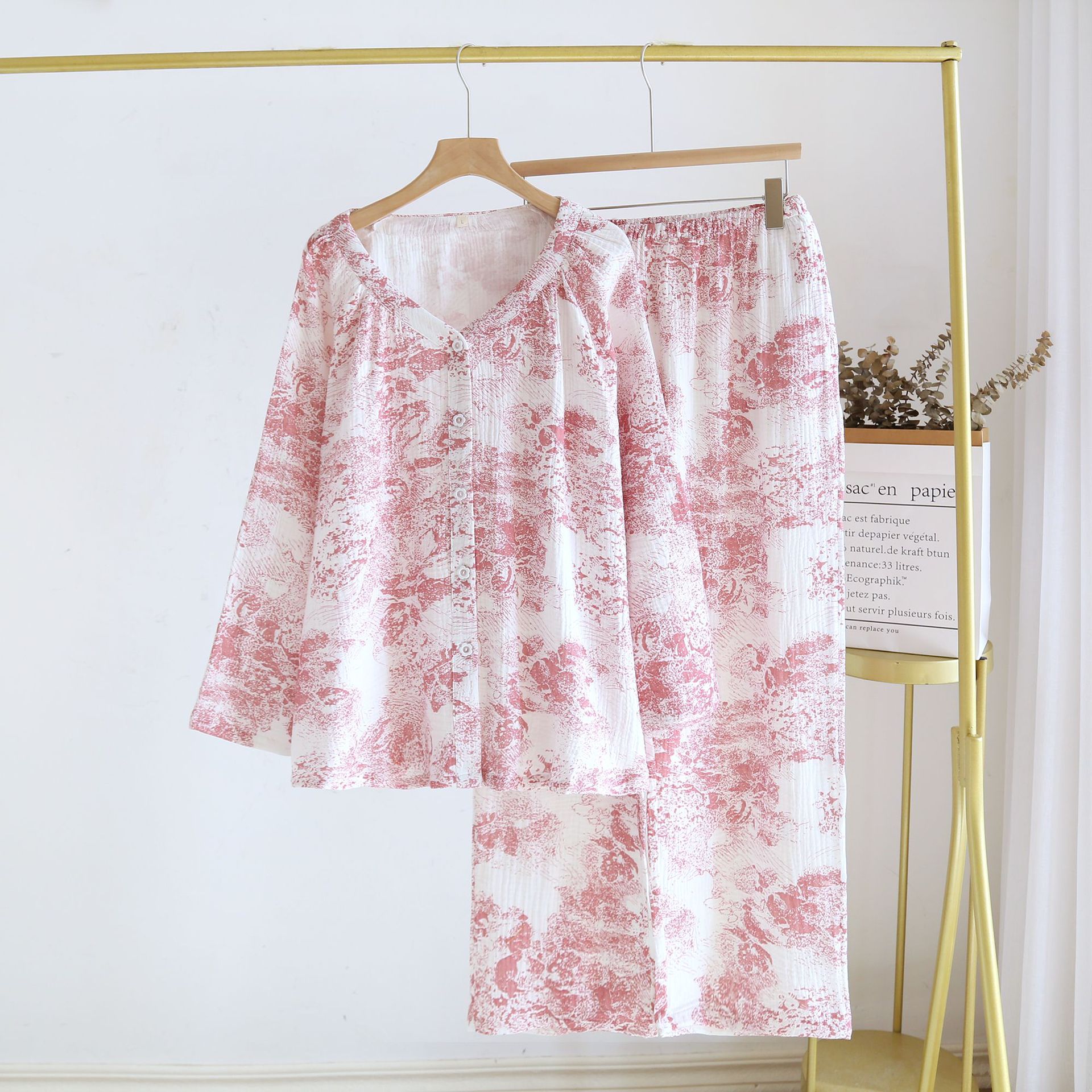 봄, 여름, 가을 사계절 새로운 순수 면화 여성의 긴팔 바지 파자마 더블 레이어 코튼 원사 캐주얼 간단한 가정복 세트스토어 가기