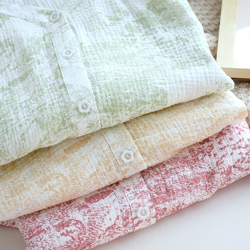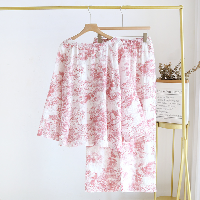 봄, 여름, 가을 사계절 새로운 순수 면화 여성의 긴팔 바지 파자마 더블 레이어 코튼 원사 캐주얼 간단한 가정복 세트