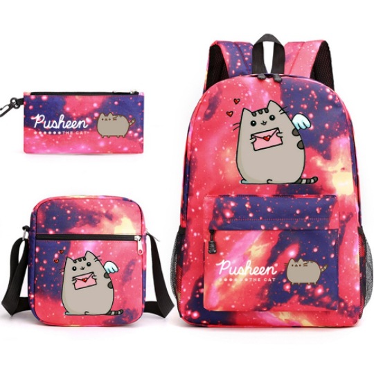 새로운 Pusheen 지방 Chihuahua 세 조각 학교 가방 한 어깨 연필 케이스 캐주얼 남성과 여성 학생 배낭 대용량스토어 가기