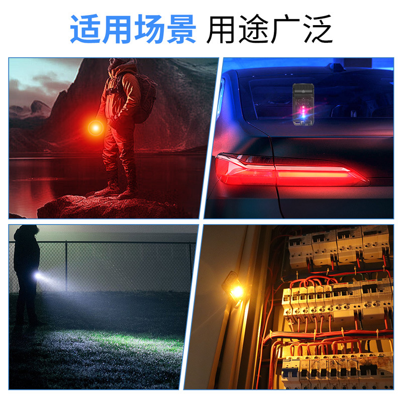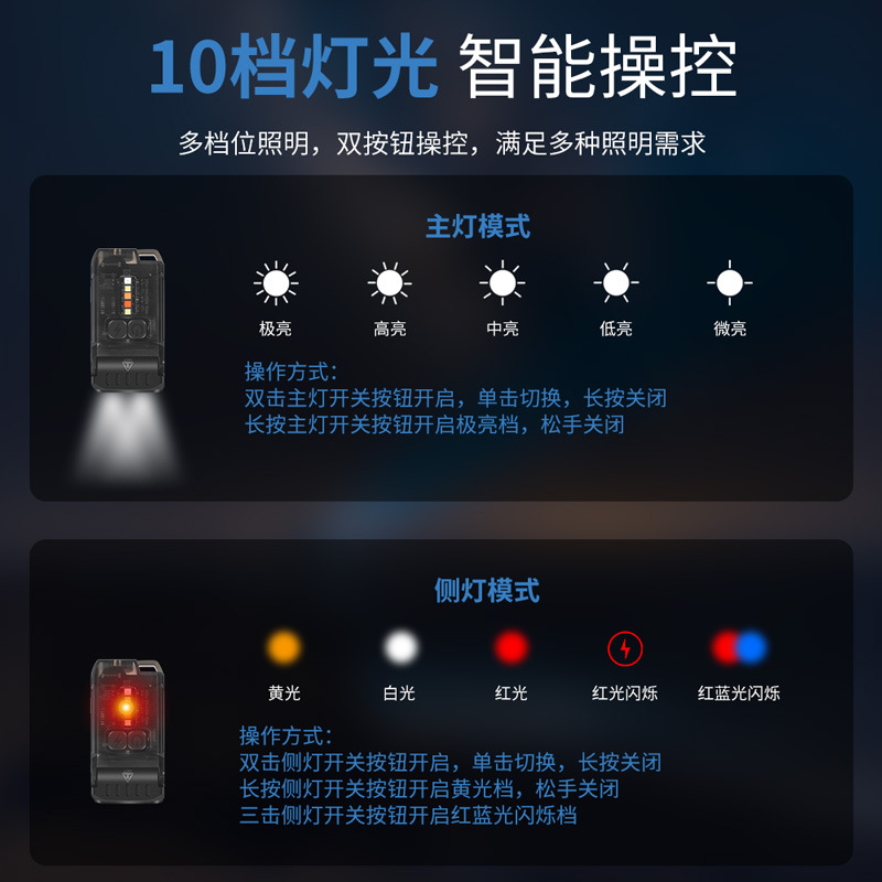 侧灯按键模式:双击开关:黄光-白光-红光-红光闪-红蓝闪循环。 长按关机。三击开启红蓝闪