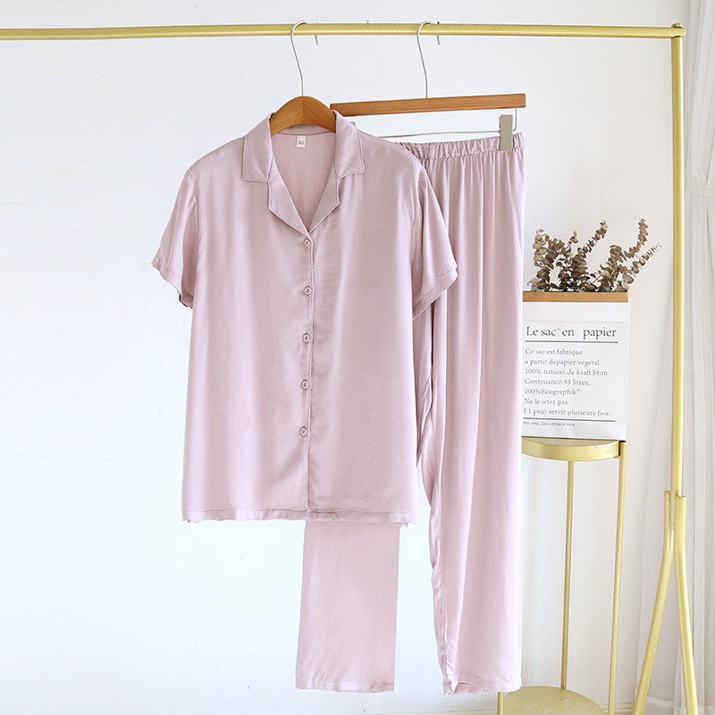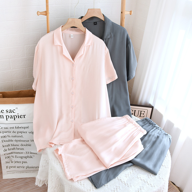 봄과 여름 얇은면 실크 파자마 새틴 반팔 바지 커플 세트 실키 남성용 고급 홈웨어 세트