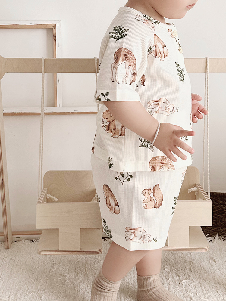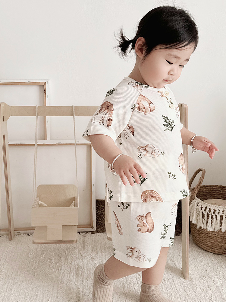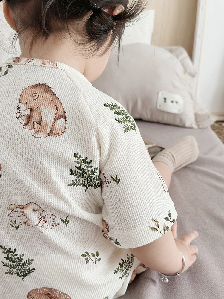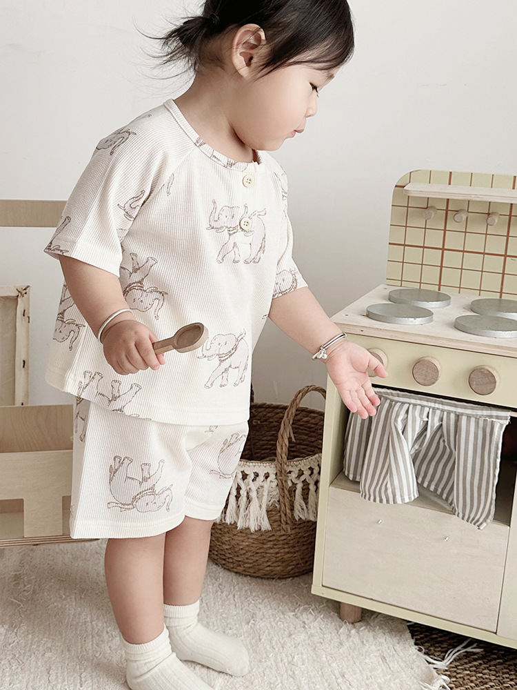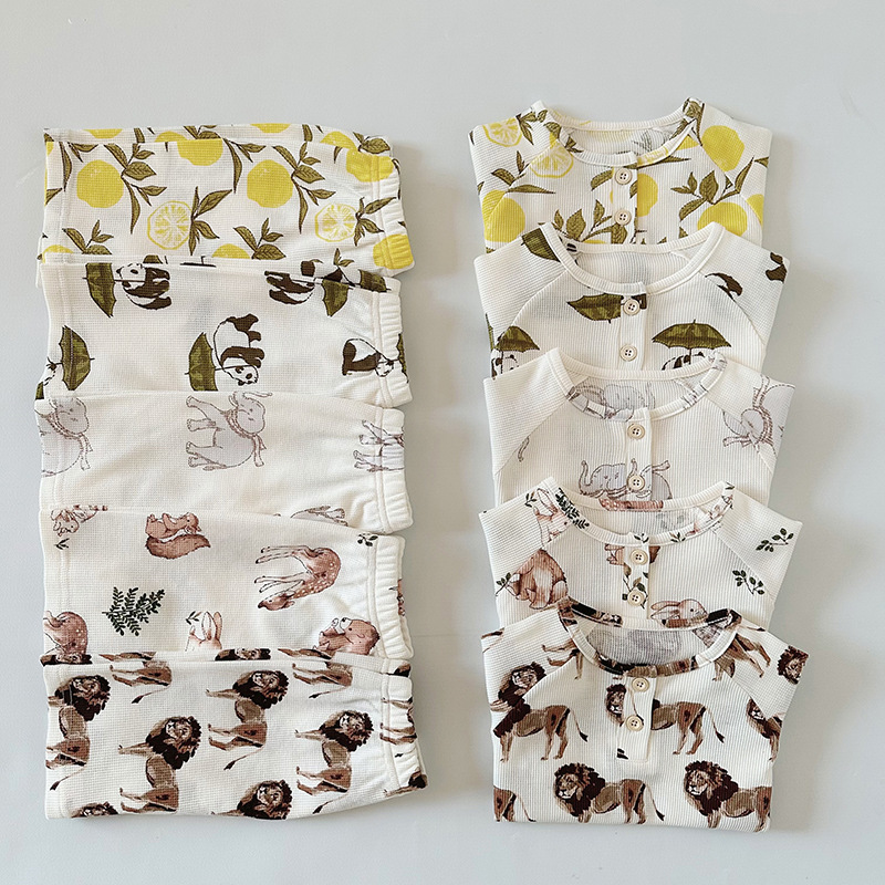 2024 여름 한국 어린이 잠옷 북유럽 스타일 어린이 홈 옷 아기 잠옷 세트 순수한 면 와플