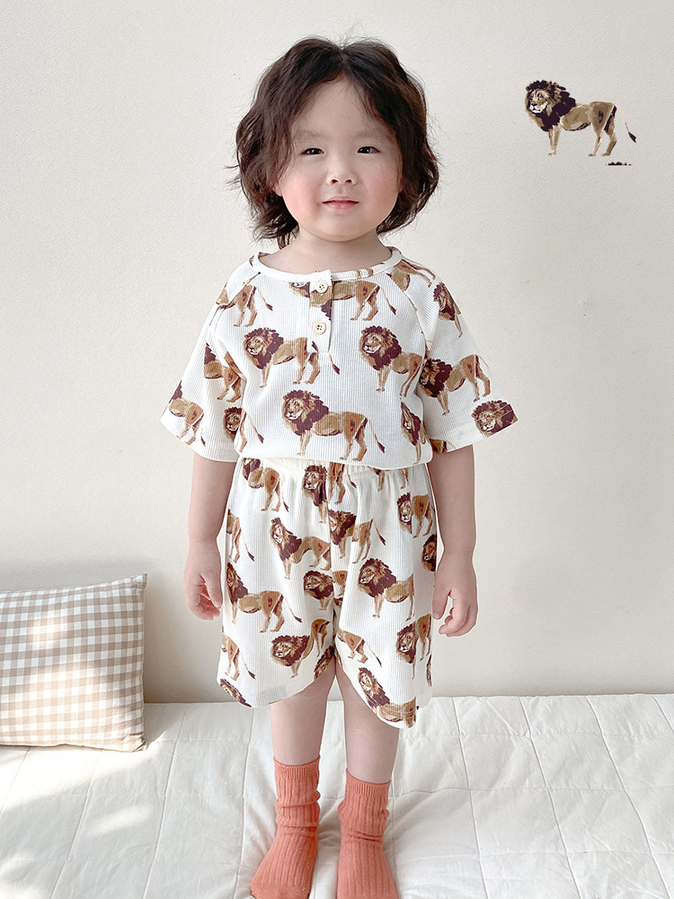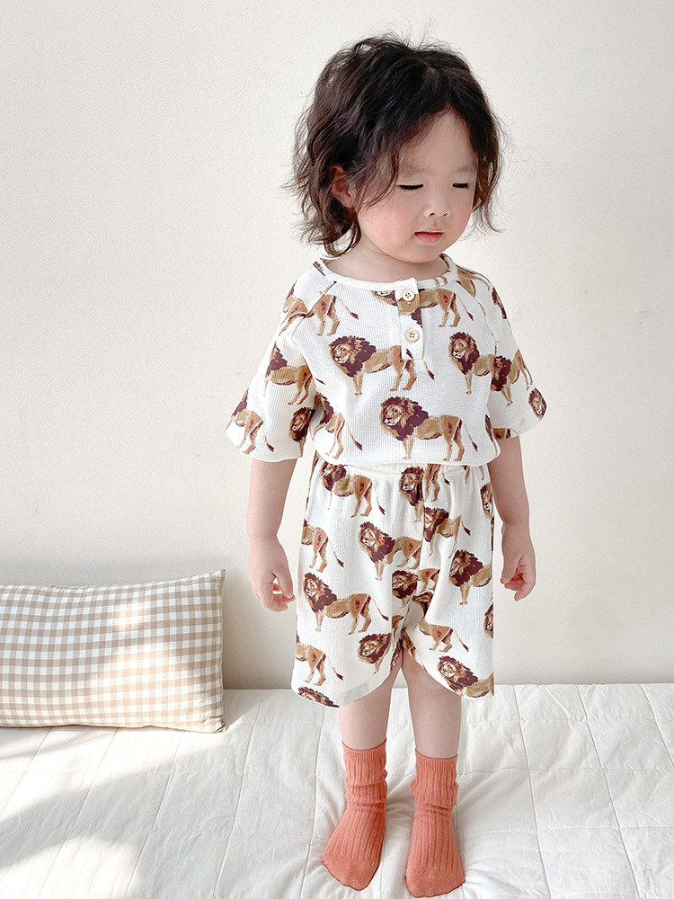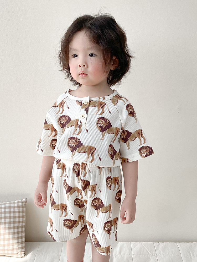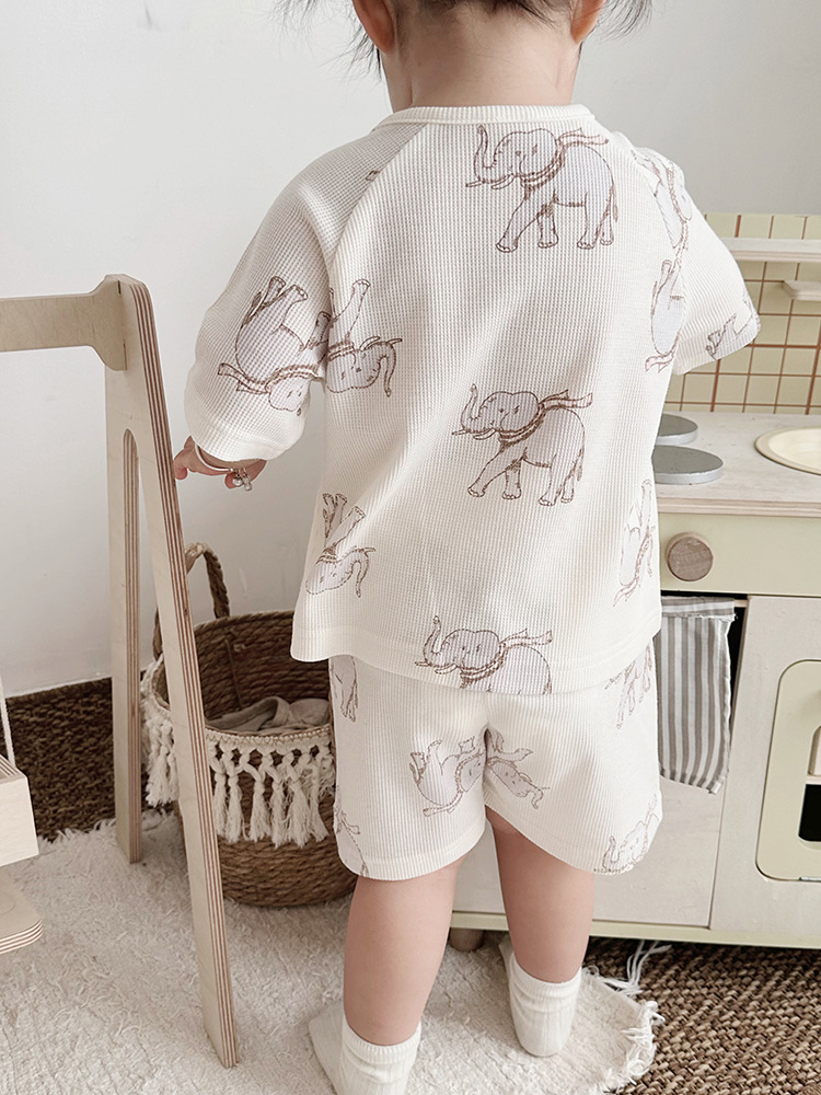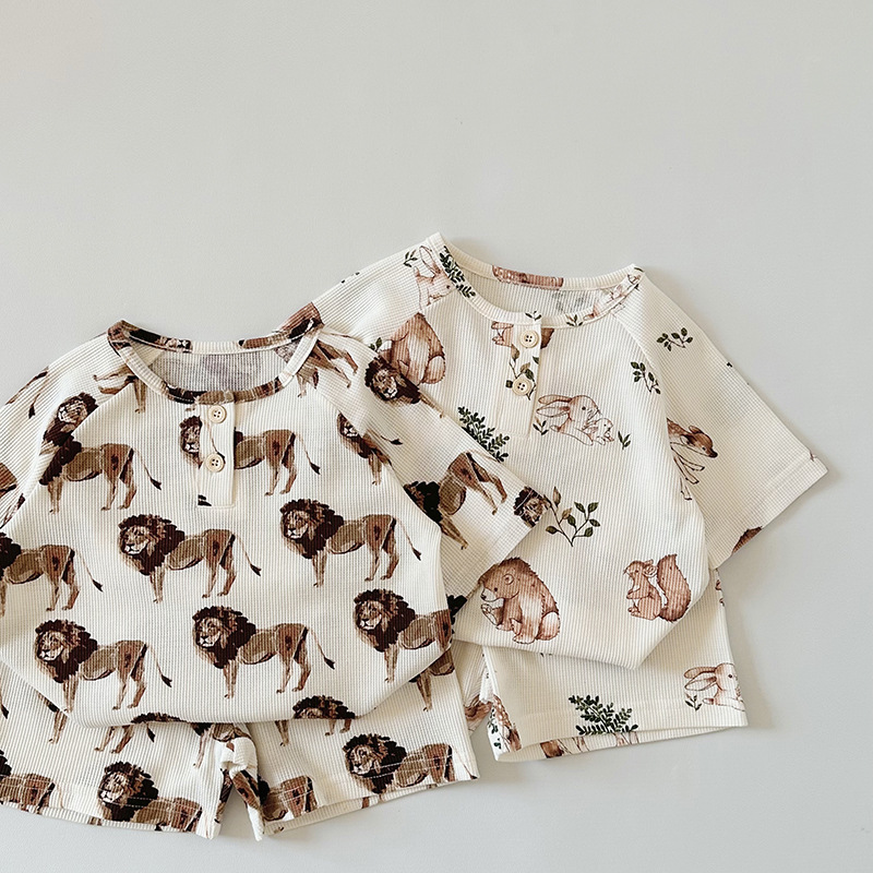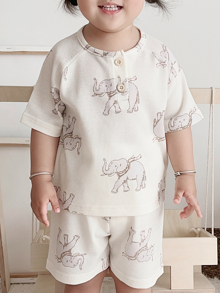 2024 여름 한국 어린이 잠옷 북유럽 스타일 어린이 홈 옷 아기 잠옷 세트 순수한 면 와플