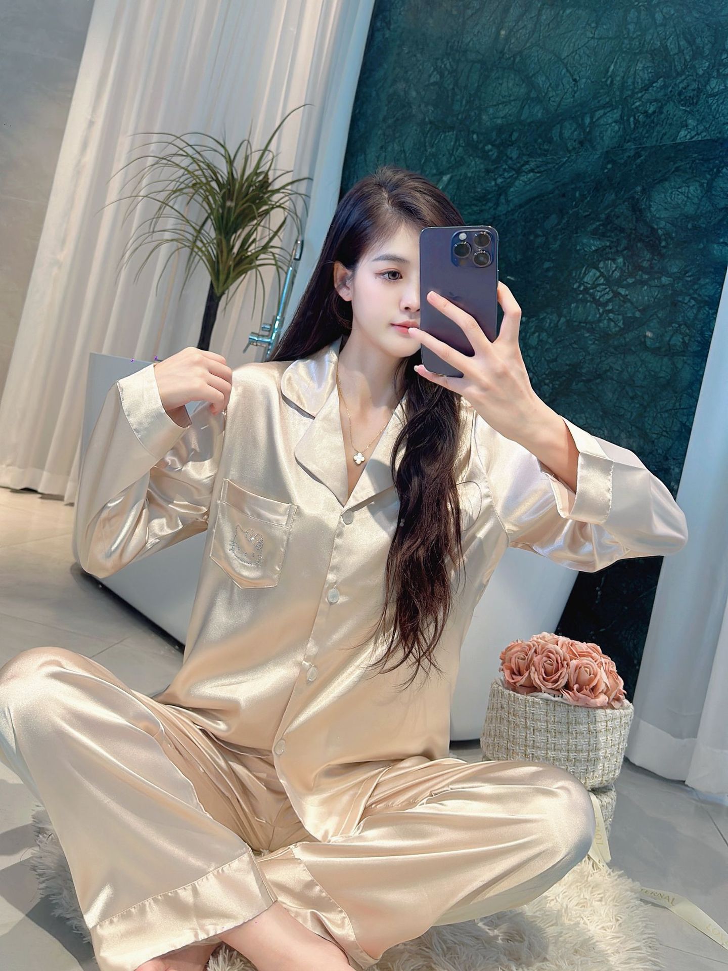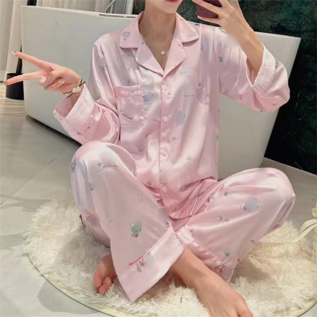 야옹 미 스타 같은 스타일 핫 드릴링 아이스 실크 파자마 여성 세트 달콤한 얇은 긴 소매 유행 느슨한 홈 의류 일본 스타일스토어 가기