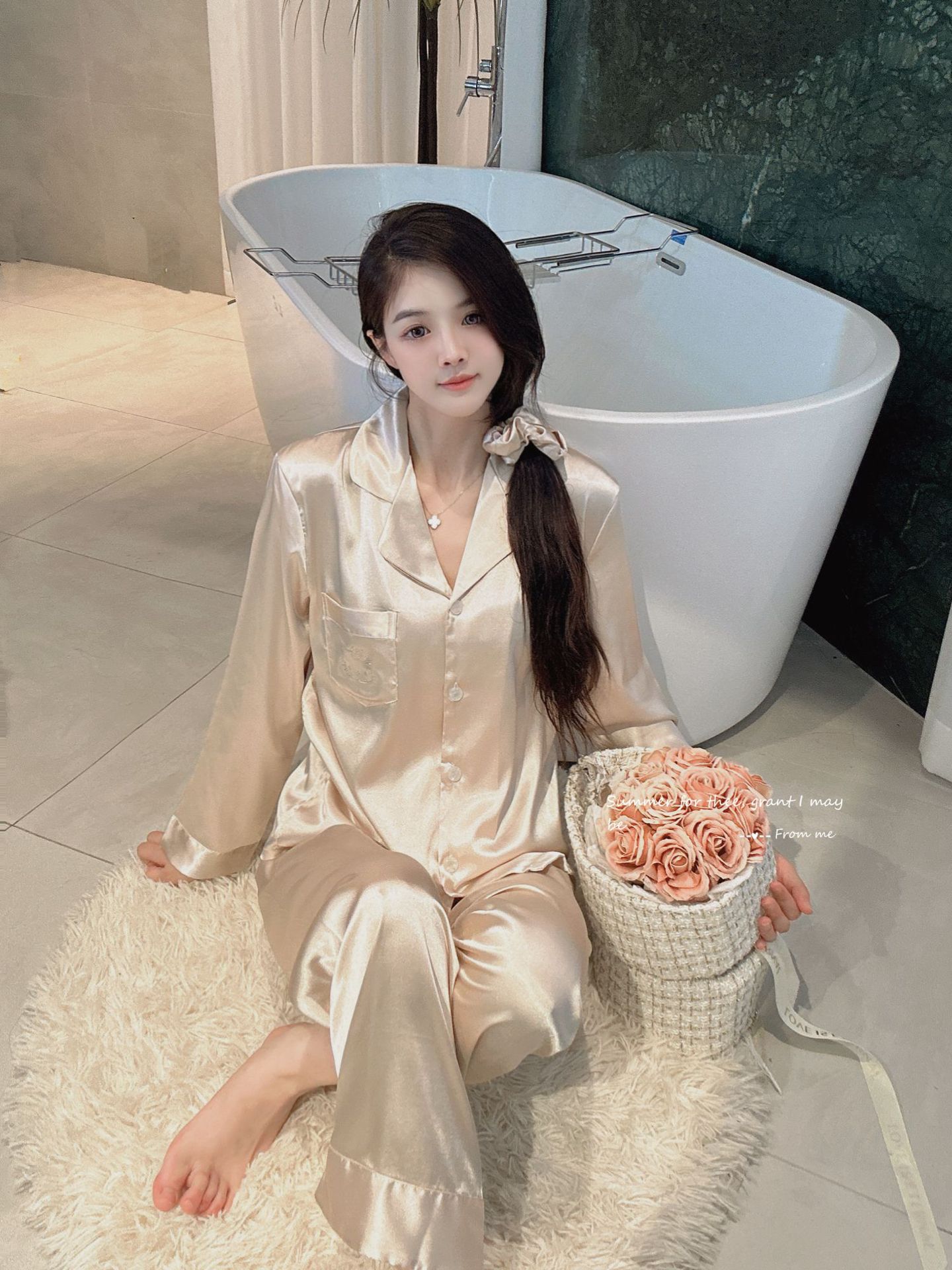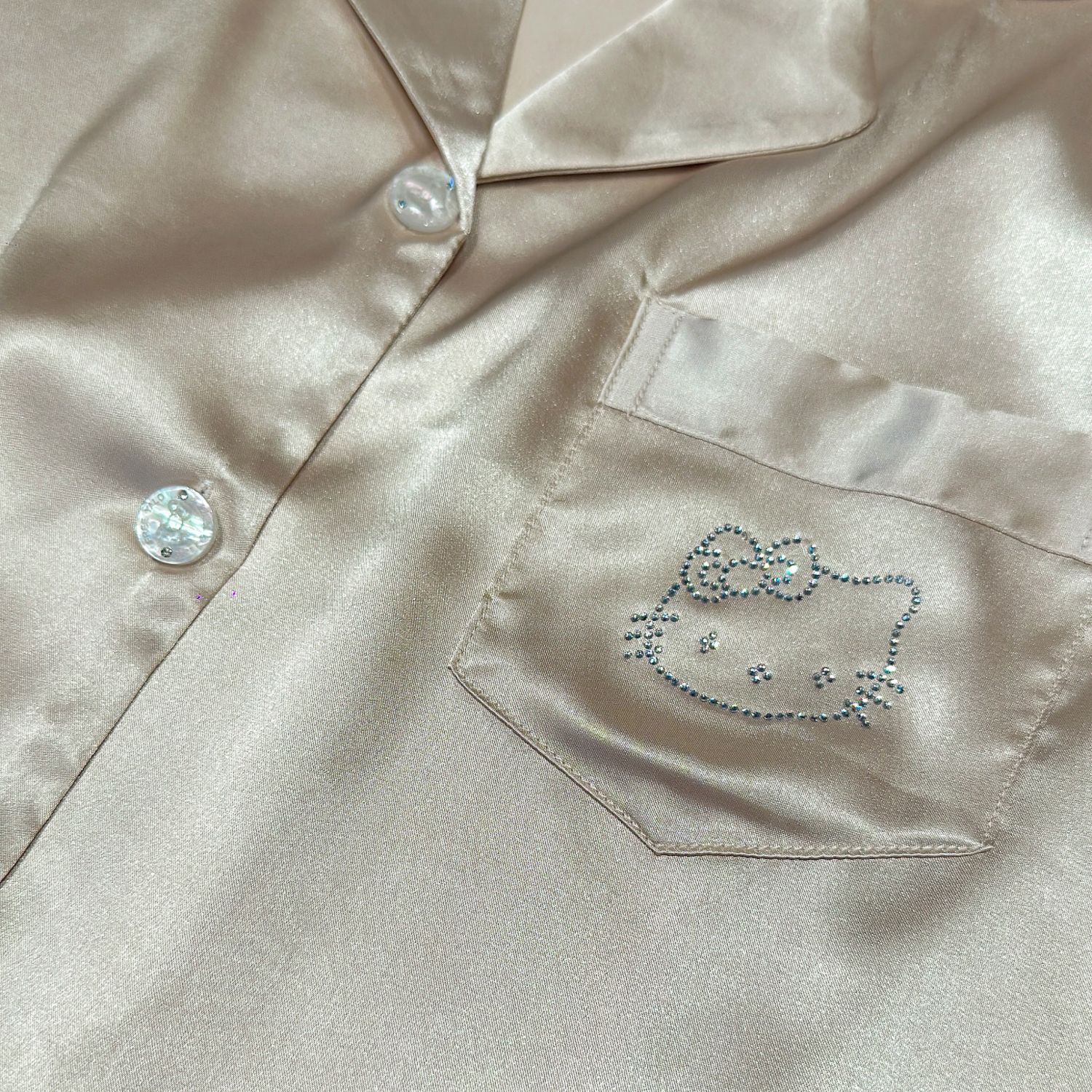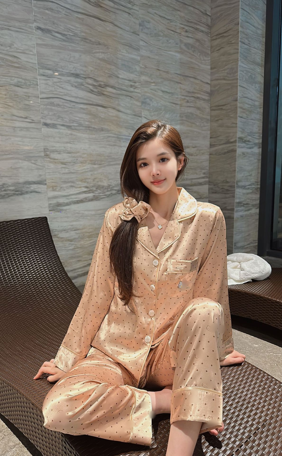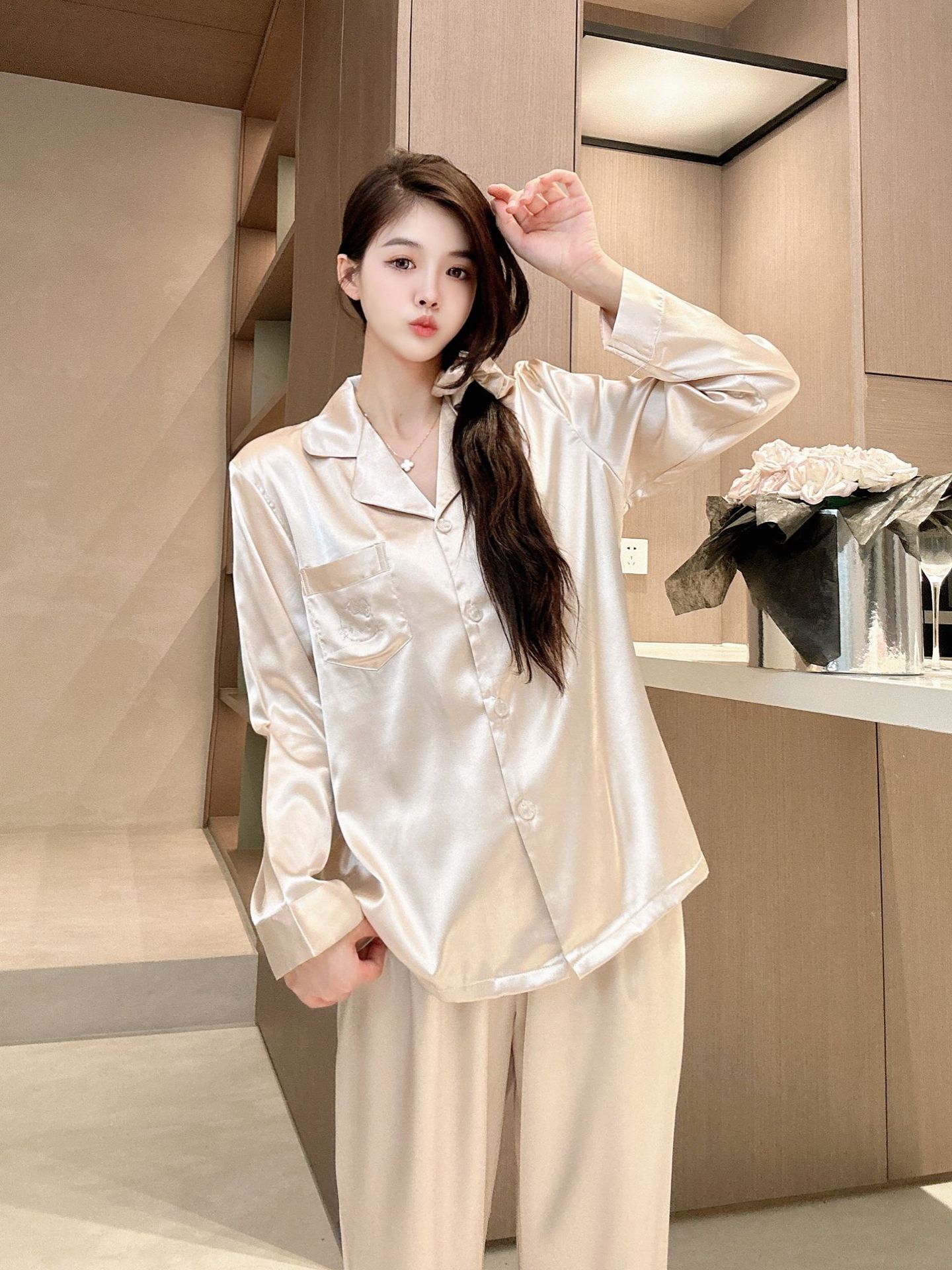 야옹 미 스타 같은 스타일 핫 드릴링 아이스 실크 파자마 여성 세트 달콤한 얇은 긴 소매 유행 느슨한 홈 의류 일본 스타일