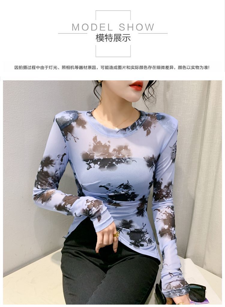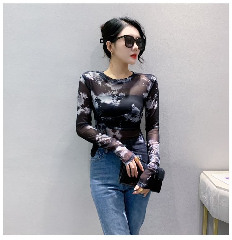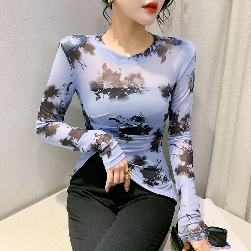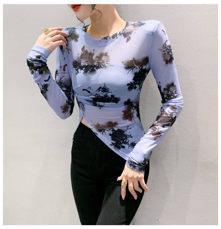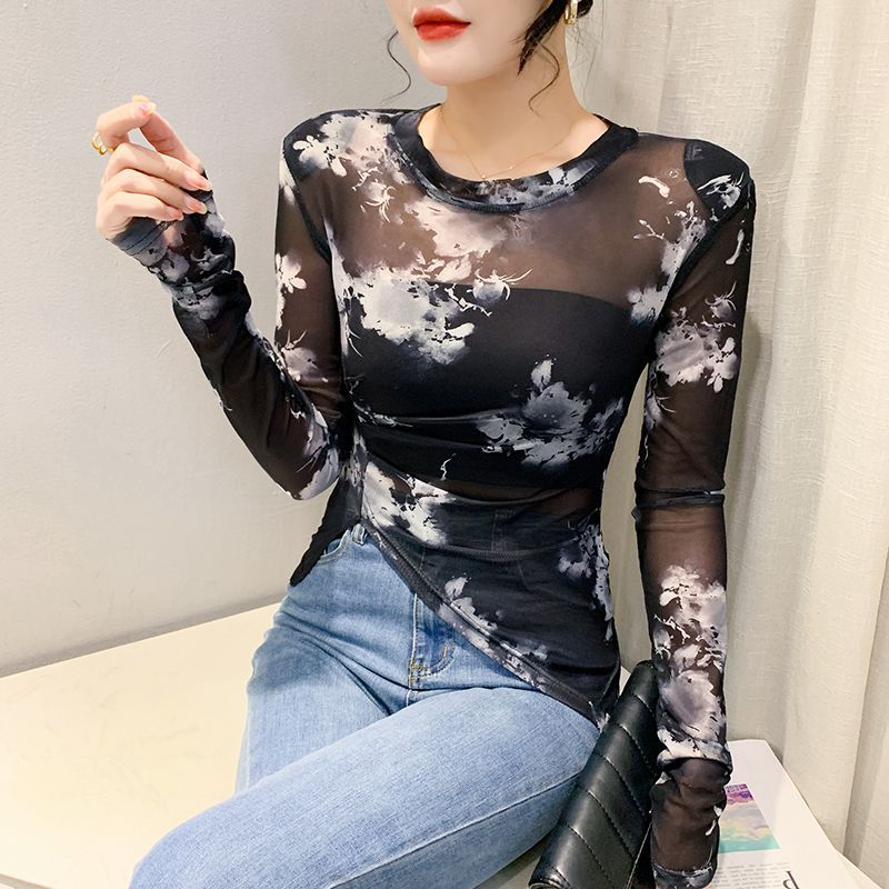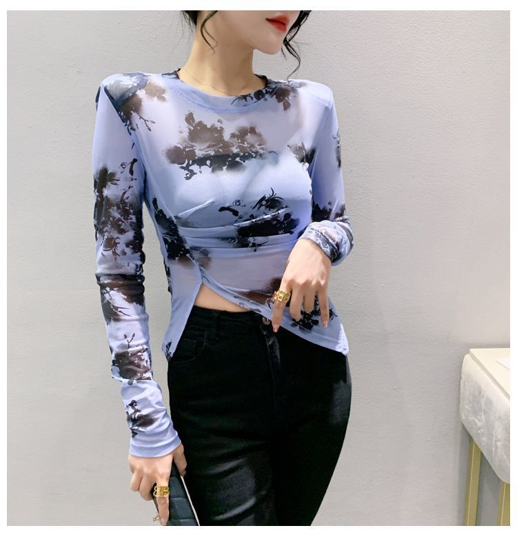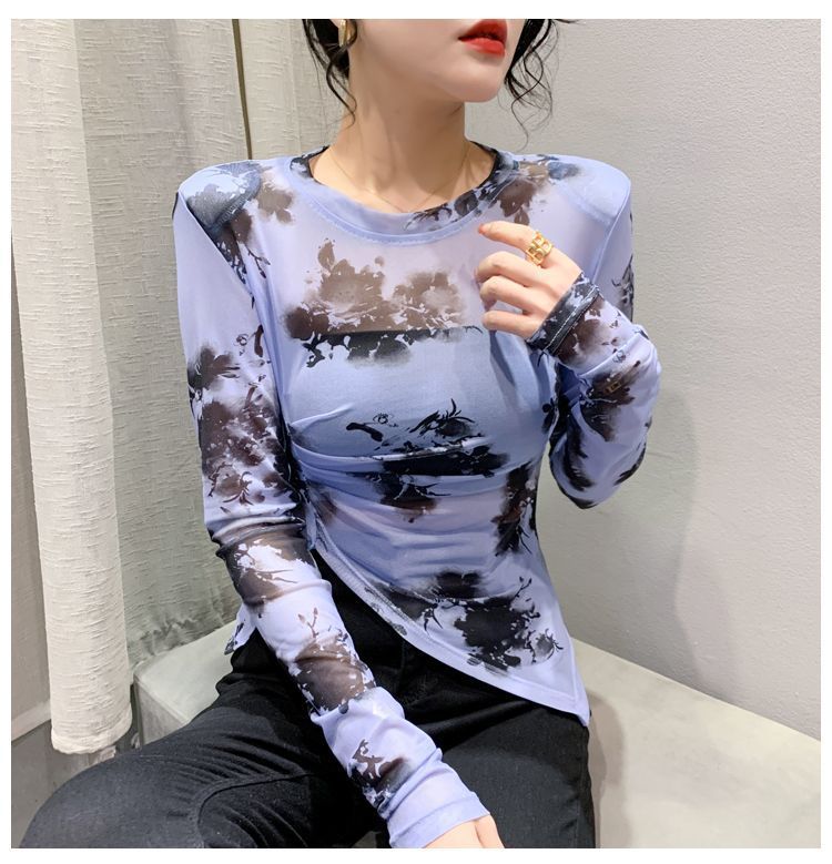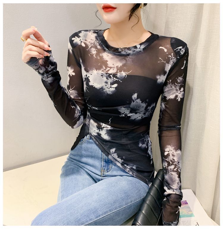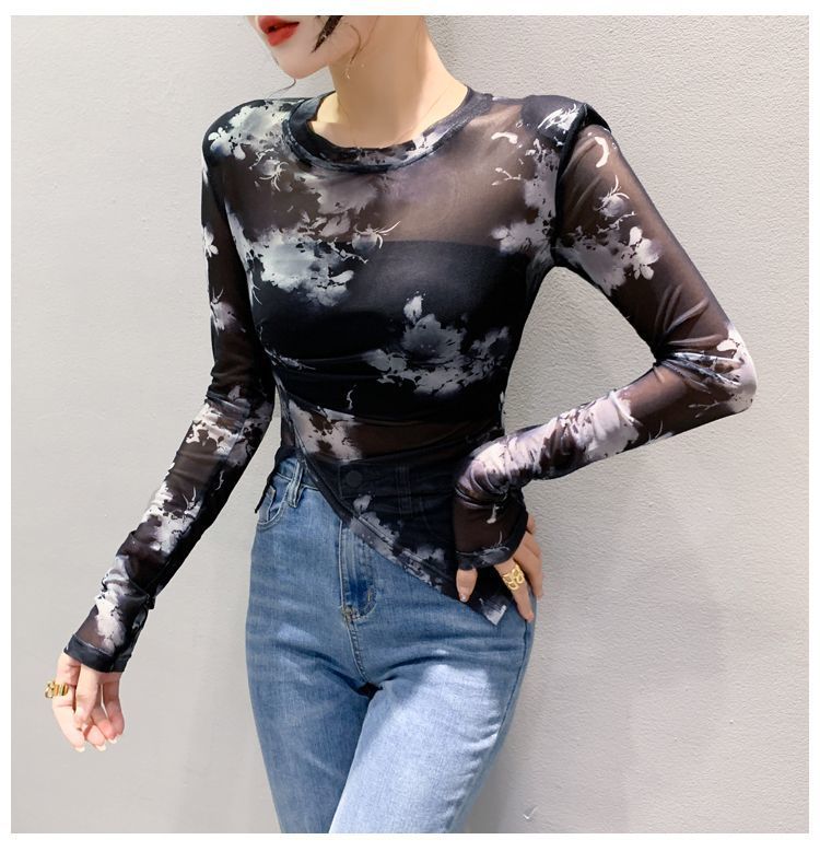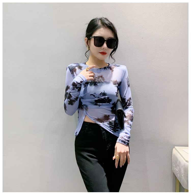 여름 2023 세련된 얇은 넥타이 염색 메쉬 긴팔 태양 보호 셔츠 우아한 다재다능한 불규칙한 분할 짧은 상단