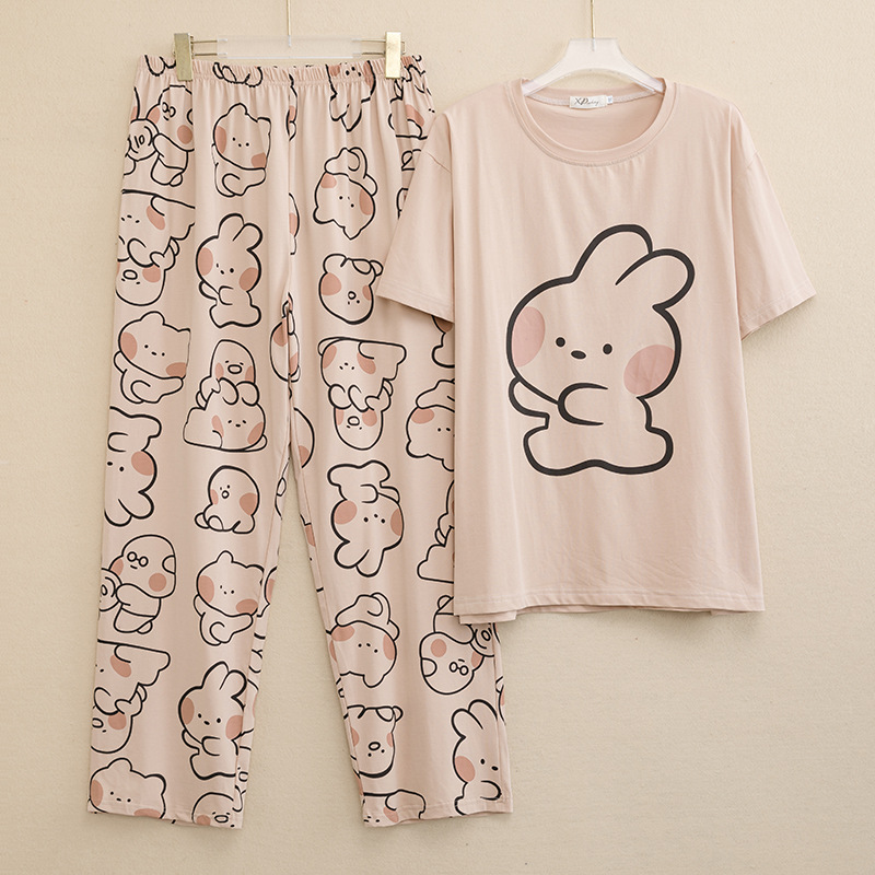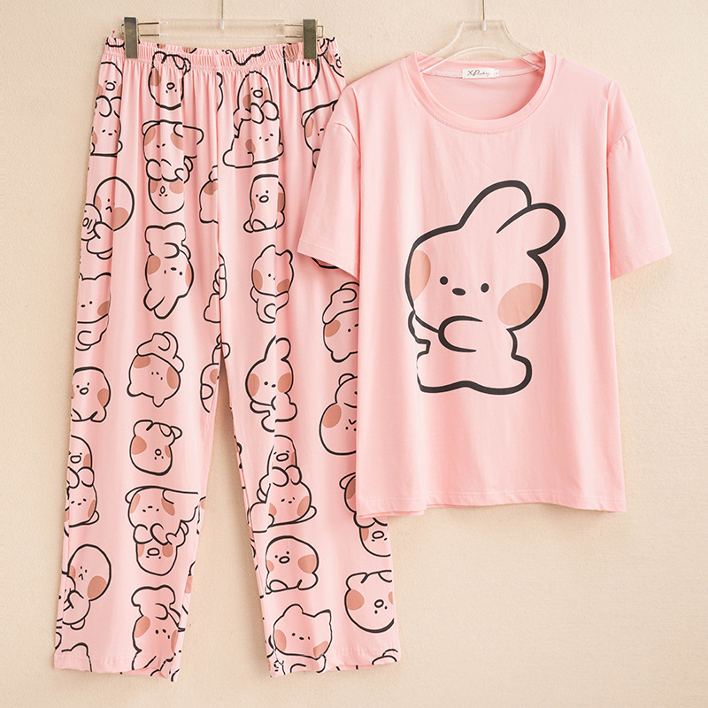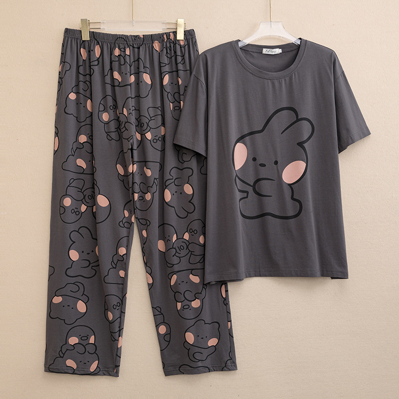 여성 봄과 여름 새로운 도착 파자마 라운드 넥 짧은 소매 바지 캐주얼 느슨한 플러스 사이즈 외부 착용 커플 홈 의류 세트