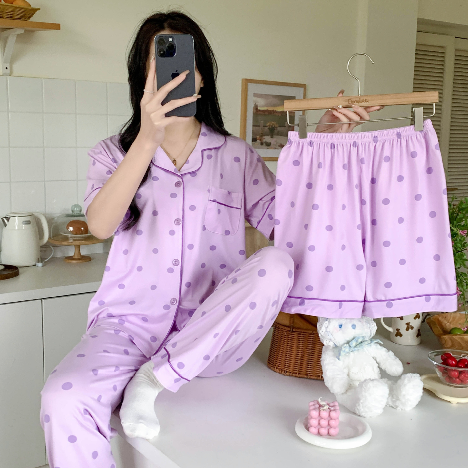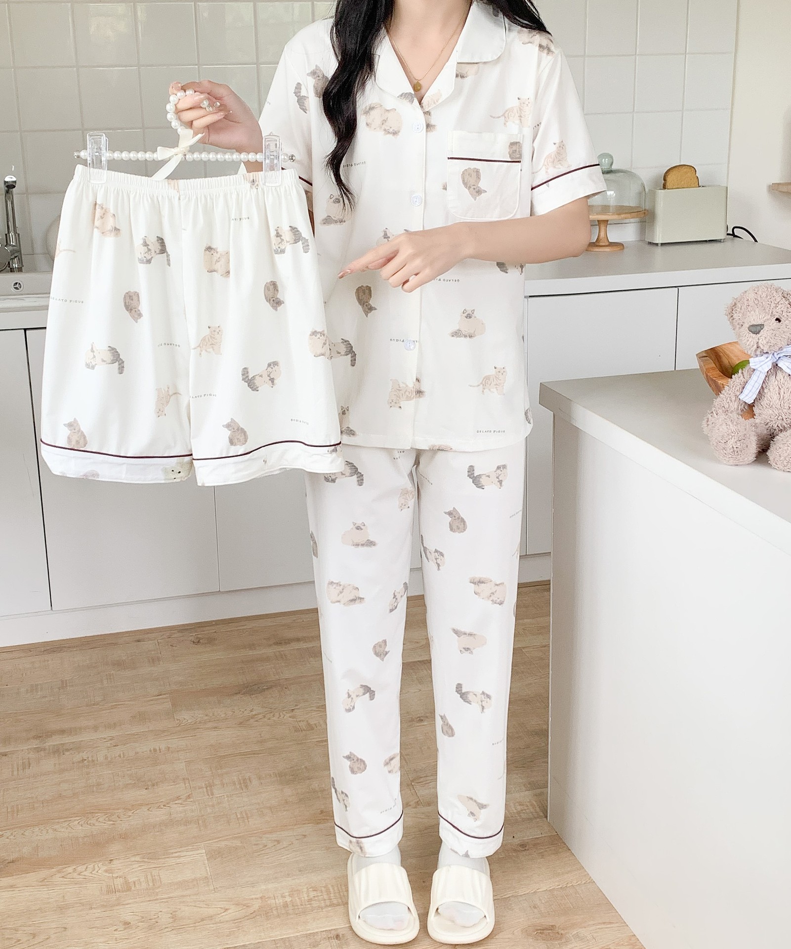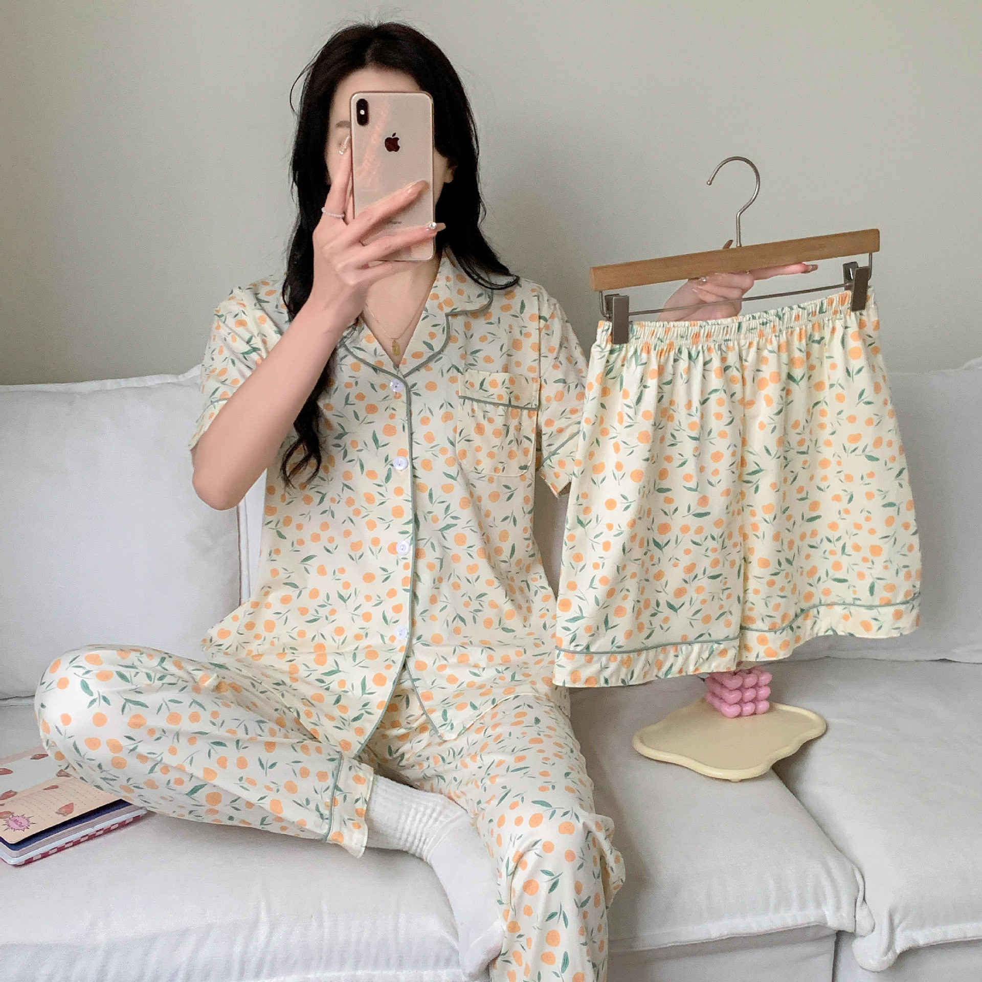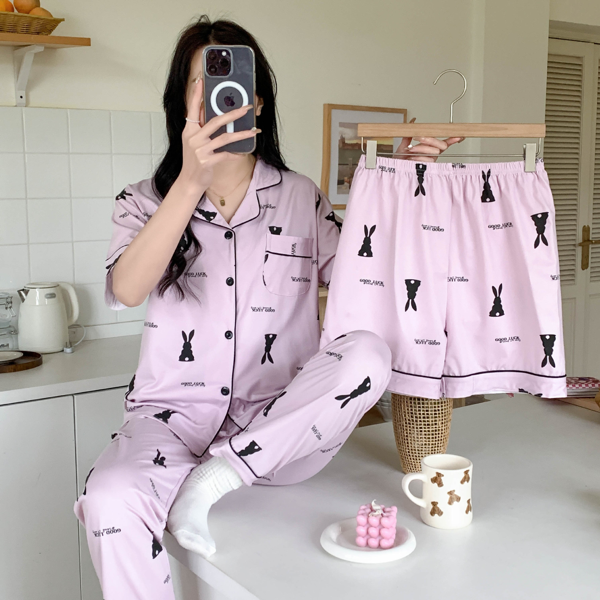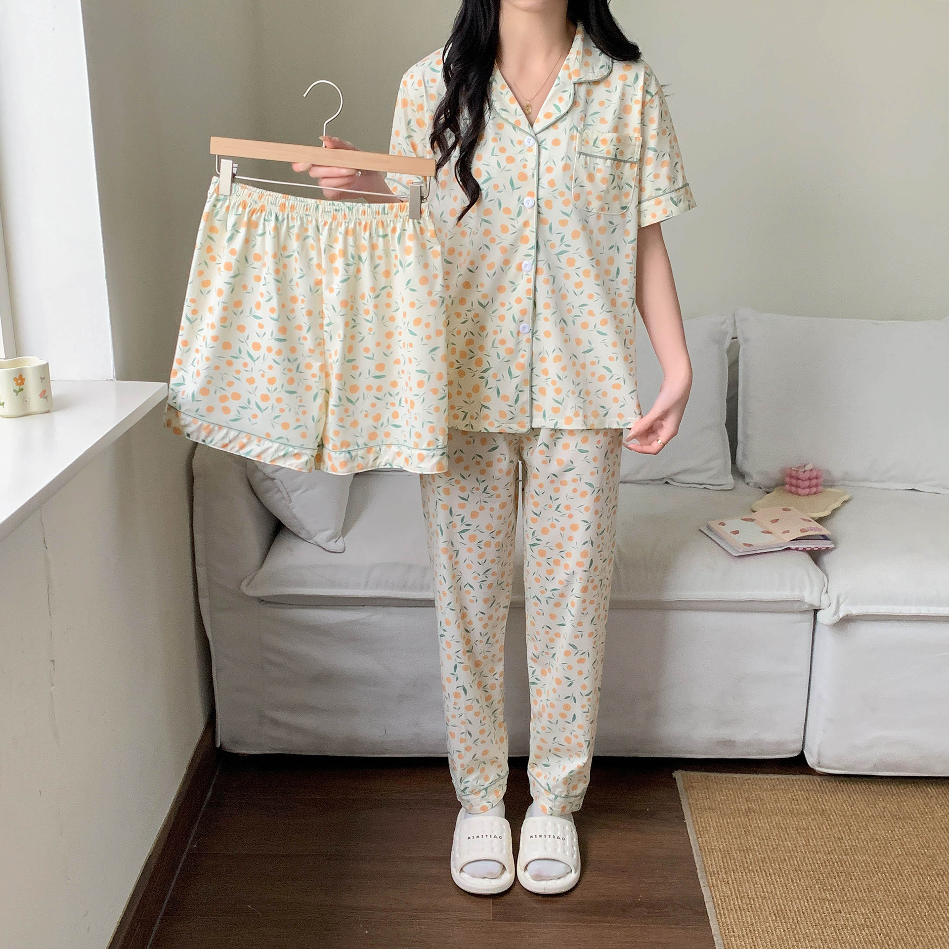 한국 잠자는 이순은 2024 개 이상의 옵션 3 피스 작은 신선한 잠옷 여성용 반팔 바지 홈웨어는 외부에서 입을 수 있습니다.