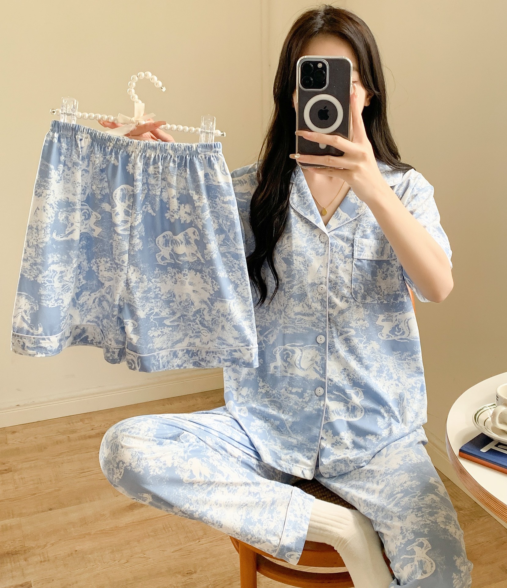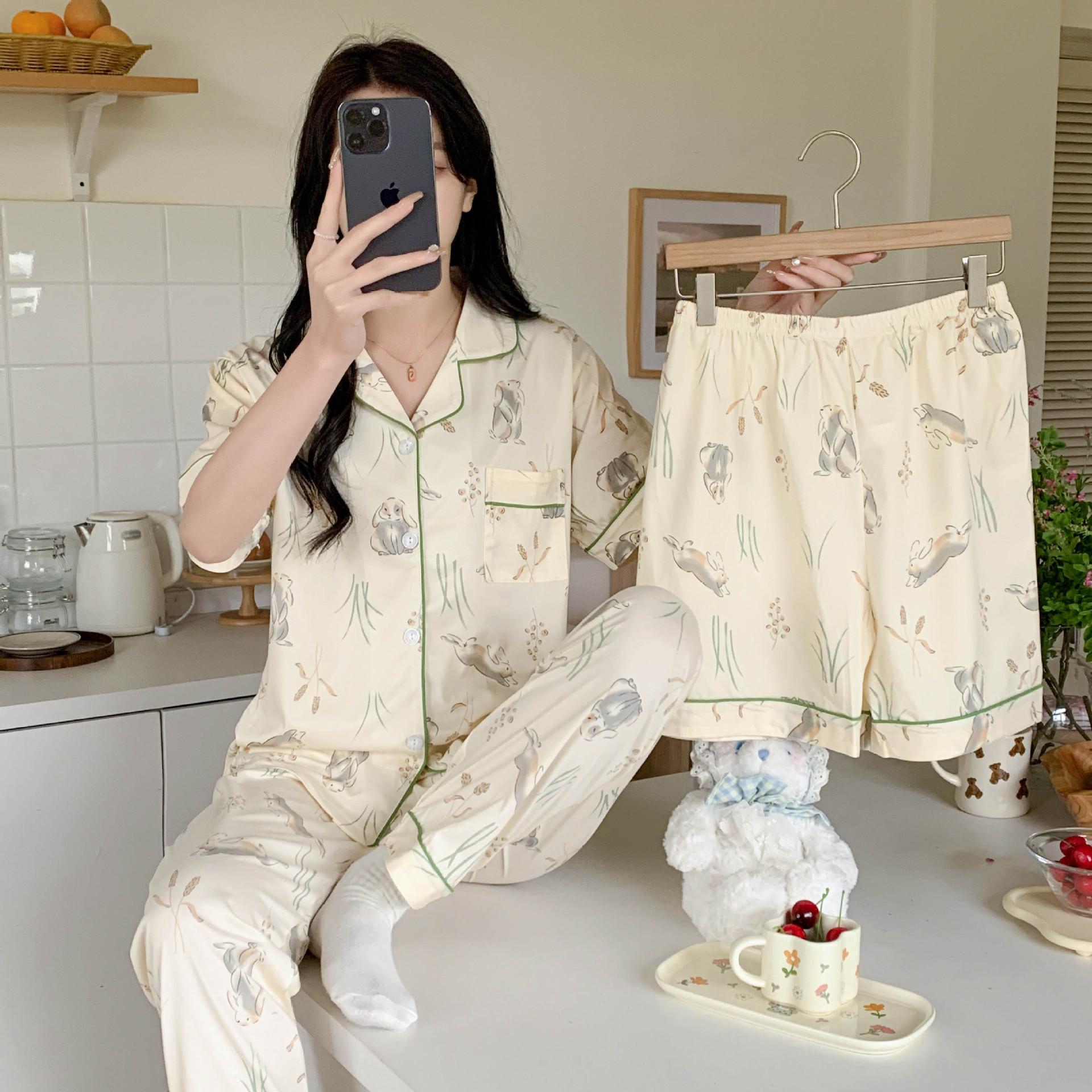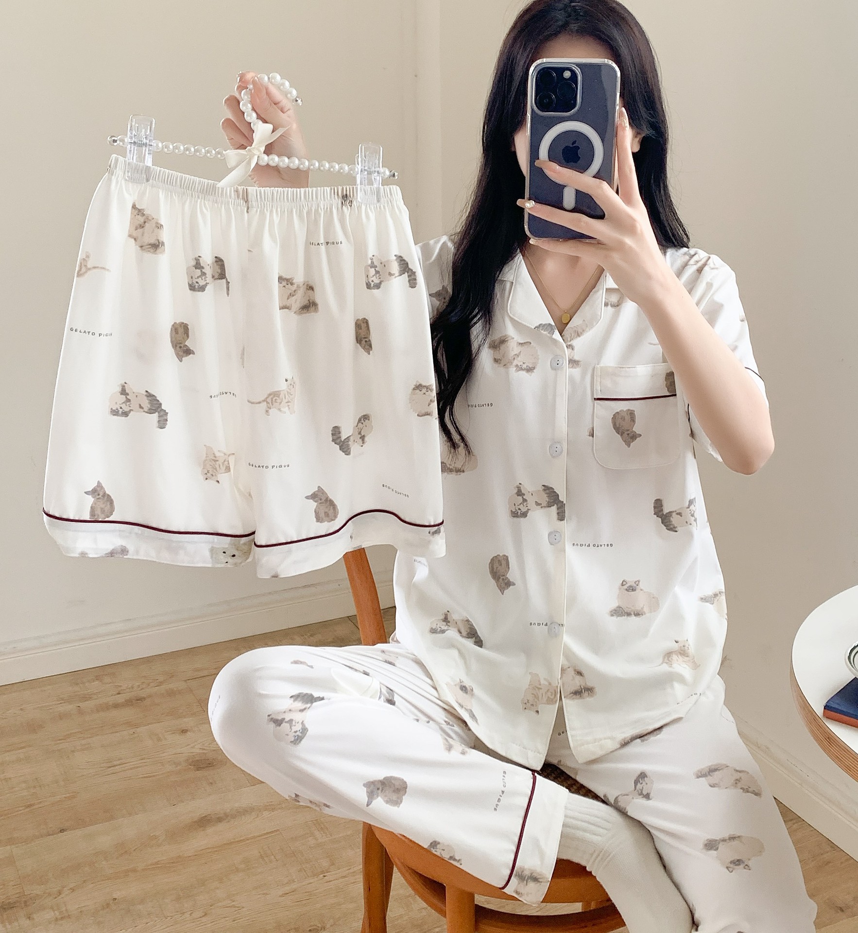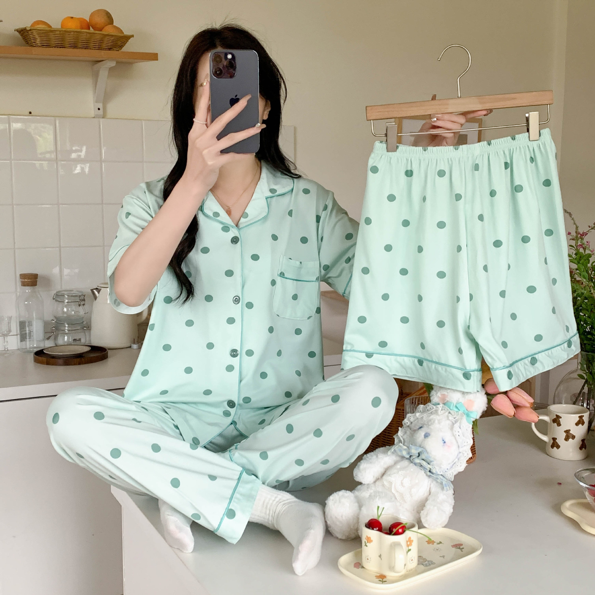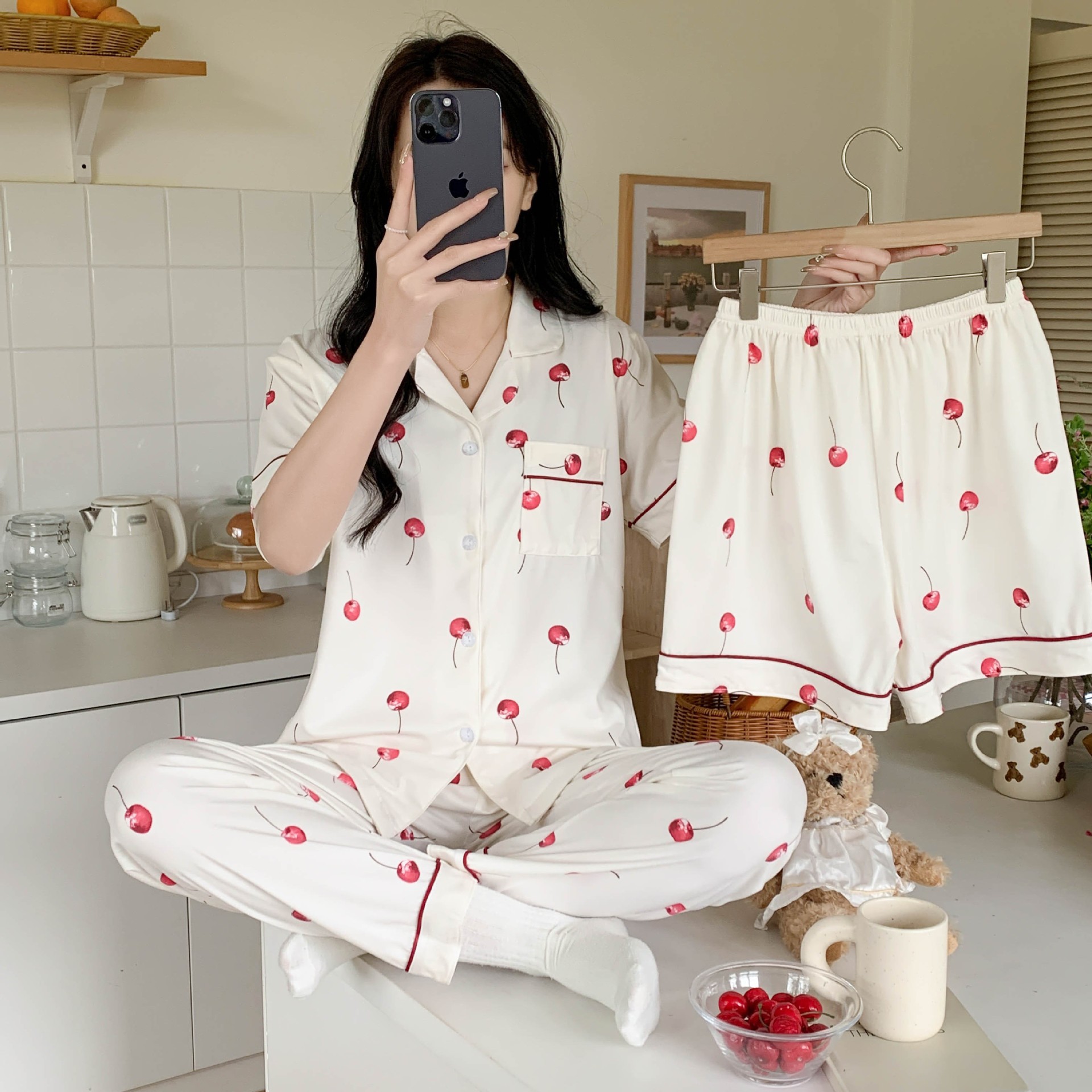 한국 잠자는 이순은 2024 개 이상의 옵션 3 피스 작은 신선한 잠옷 여성용 반팔 바지 홈웨어는 외부에서 입을 수 있습니다.