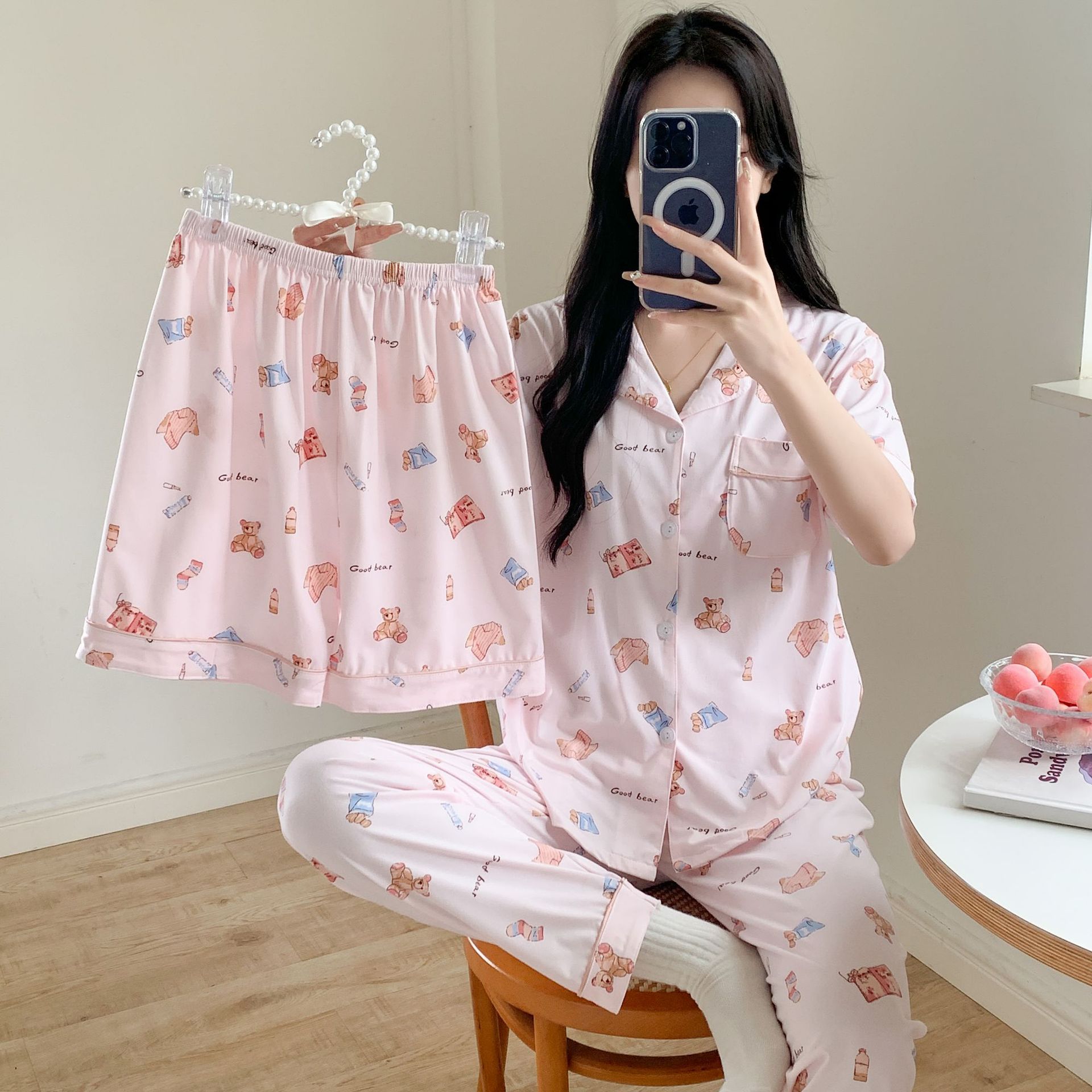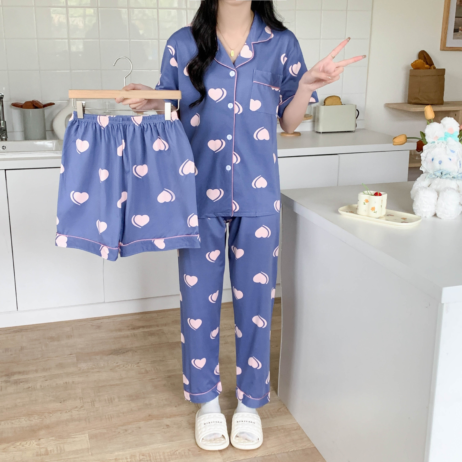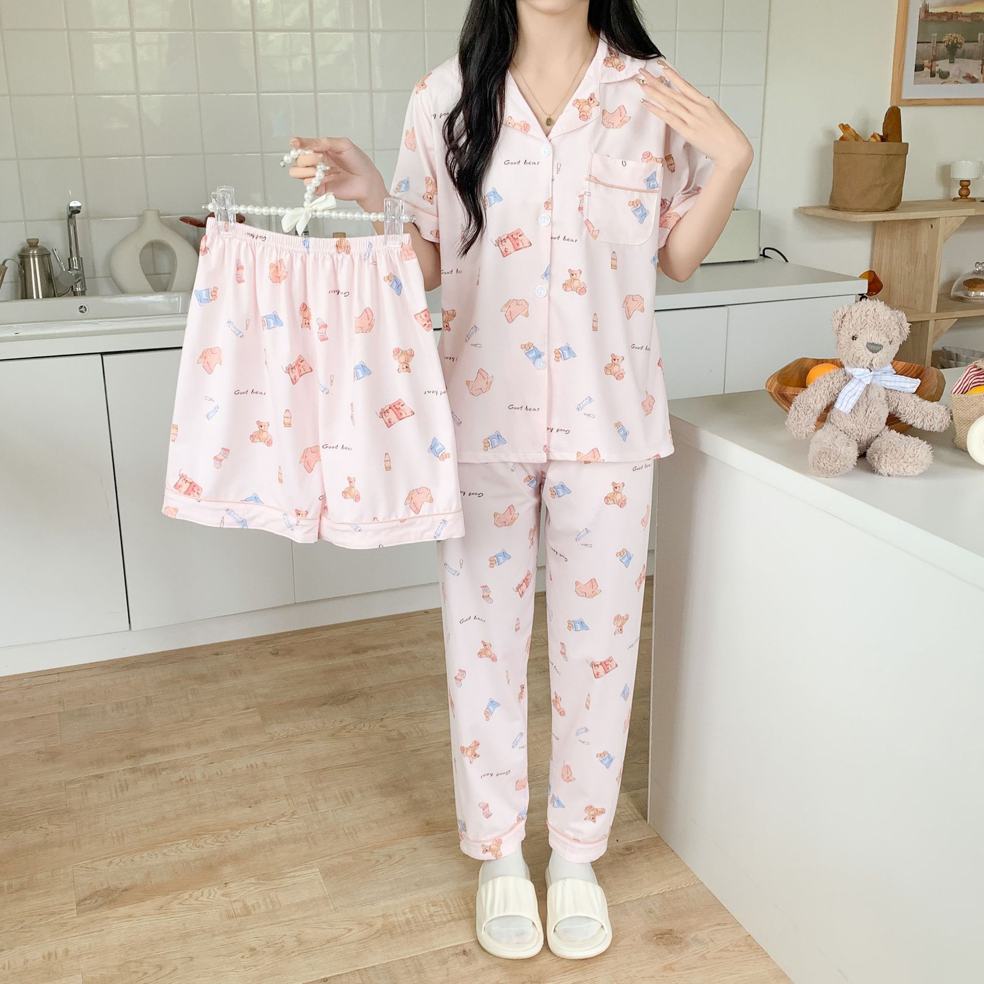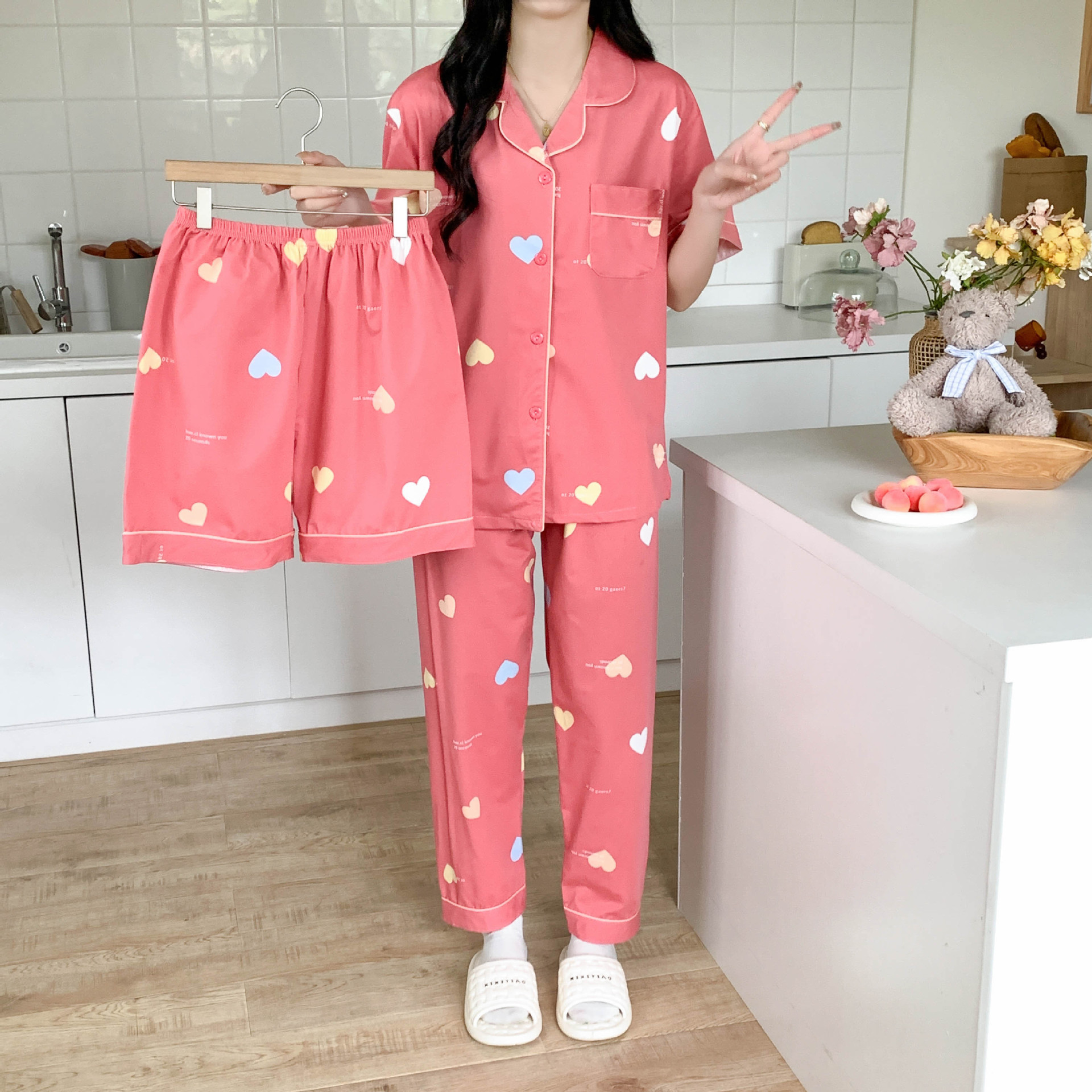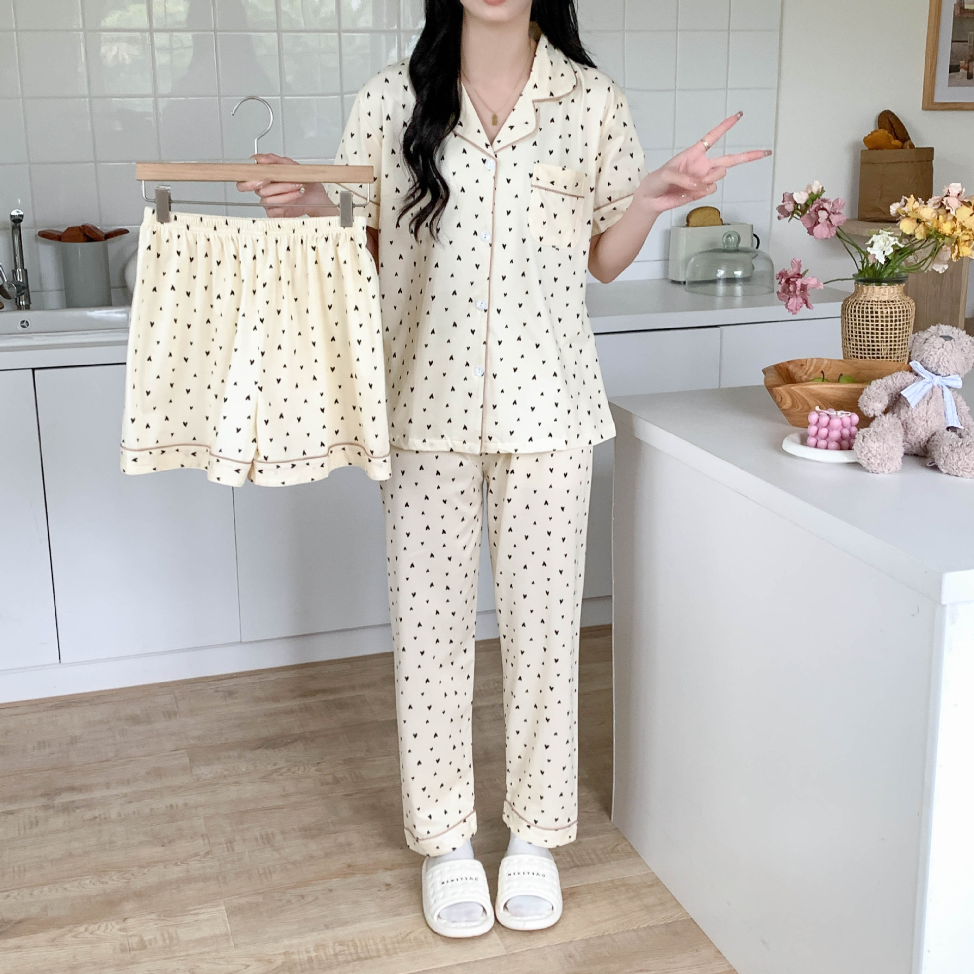 한국 잠자는 이순은 2024 개 이상의 옵션 3 피스 작은 신선한 잠옷 여성용 반팔 바지 홈웨어는 외부에서 입을 수 있습니다.스토어 가기