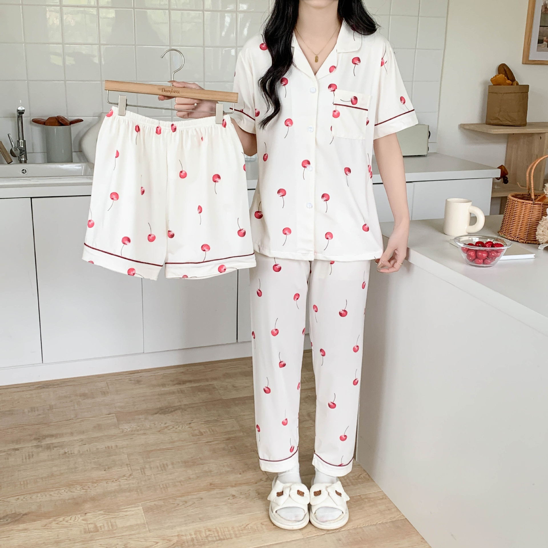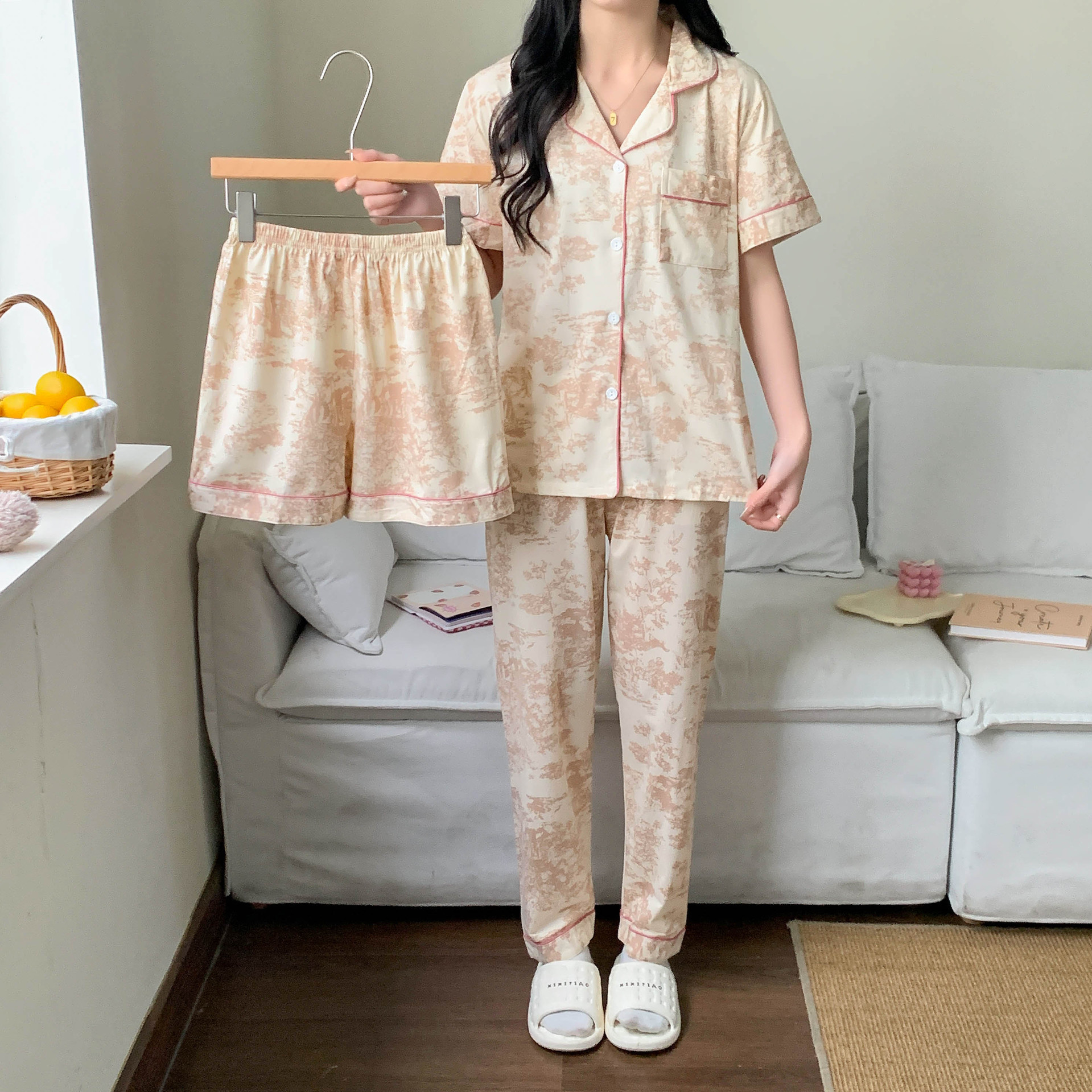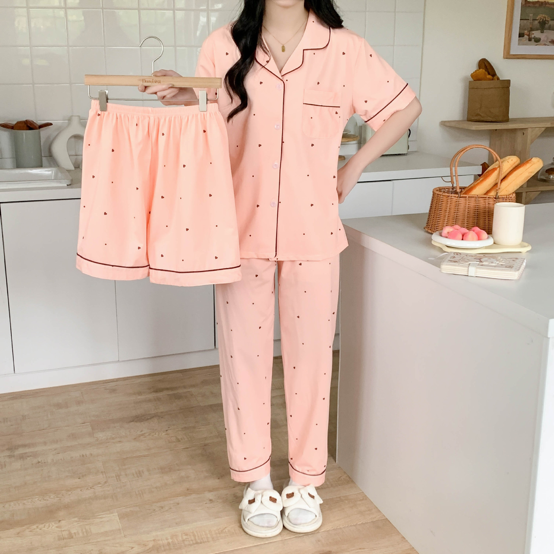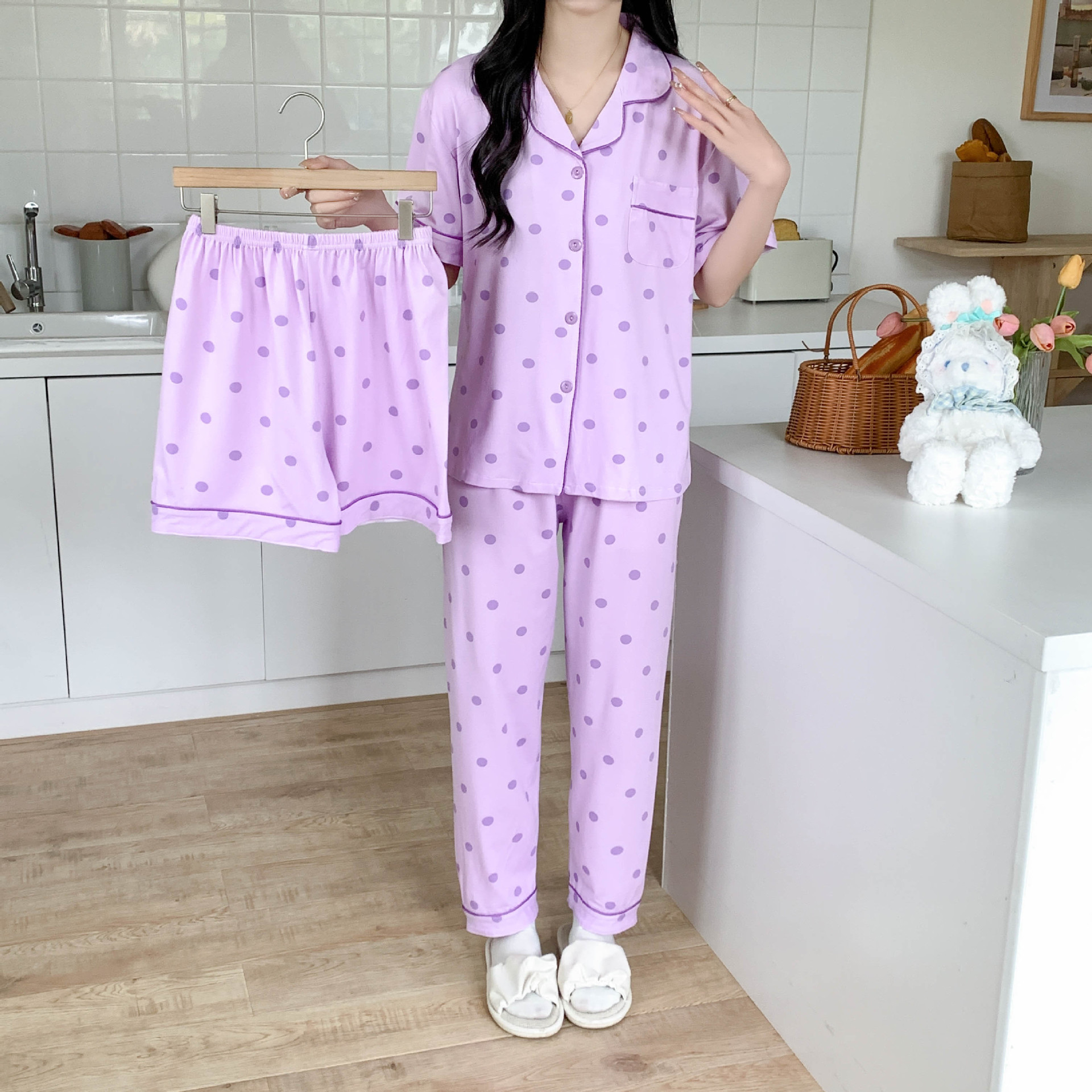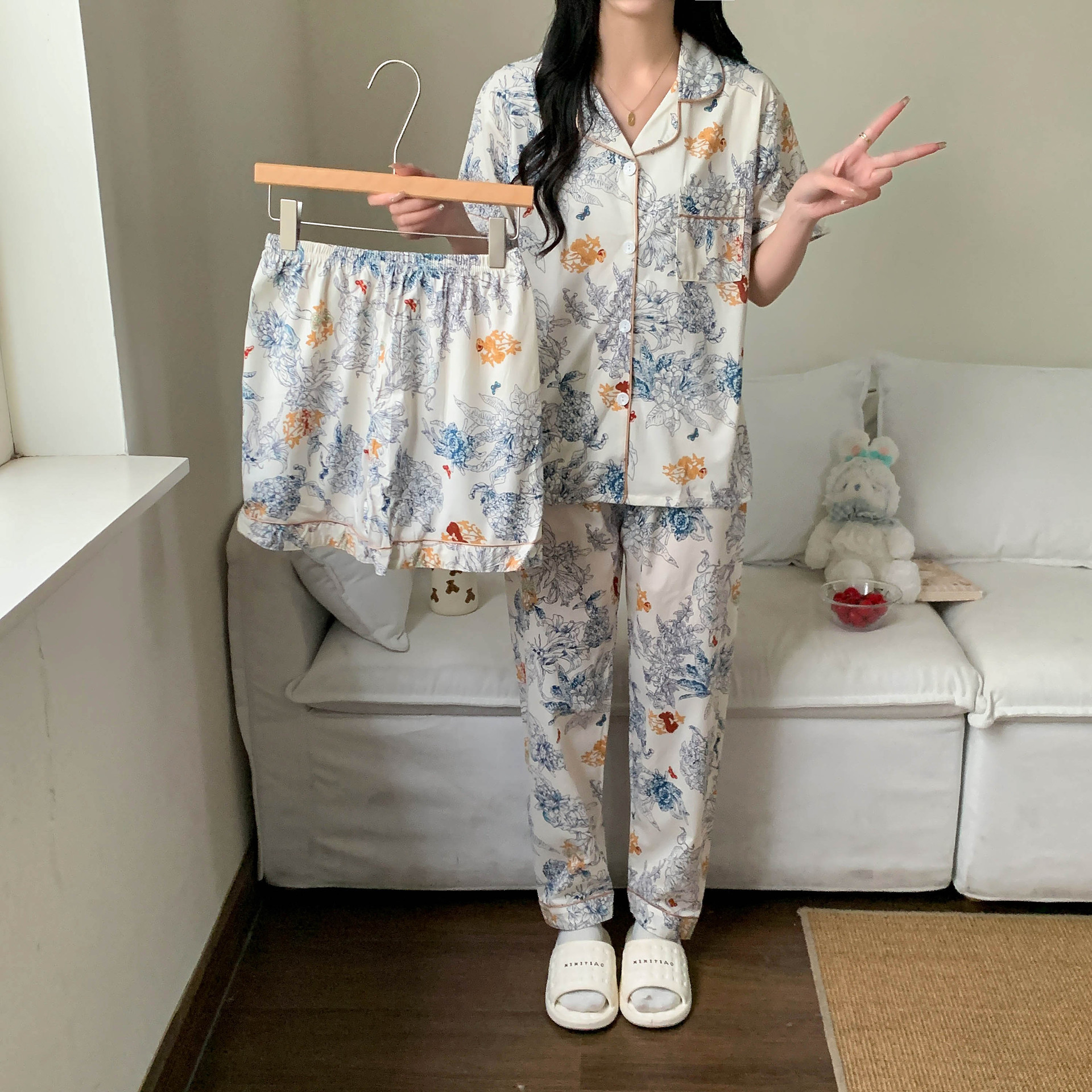 한국 잠자는 이순은 2024 개 이상의 옵션 3 피스 작은 신선한 잠옷 여성용 반팔 바지 홈웨어는 외부에서 입을 수 있습니다.스토어 가기