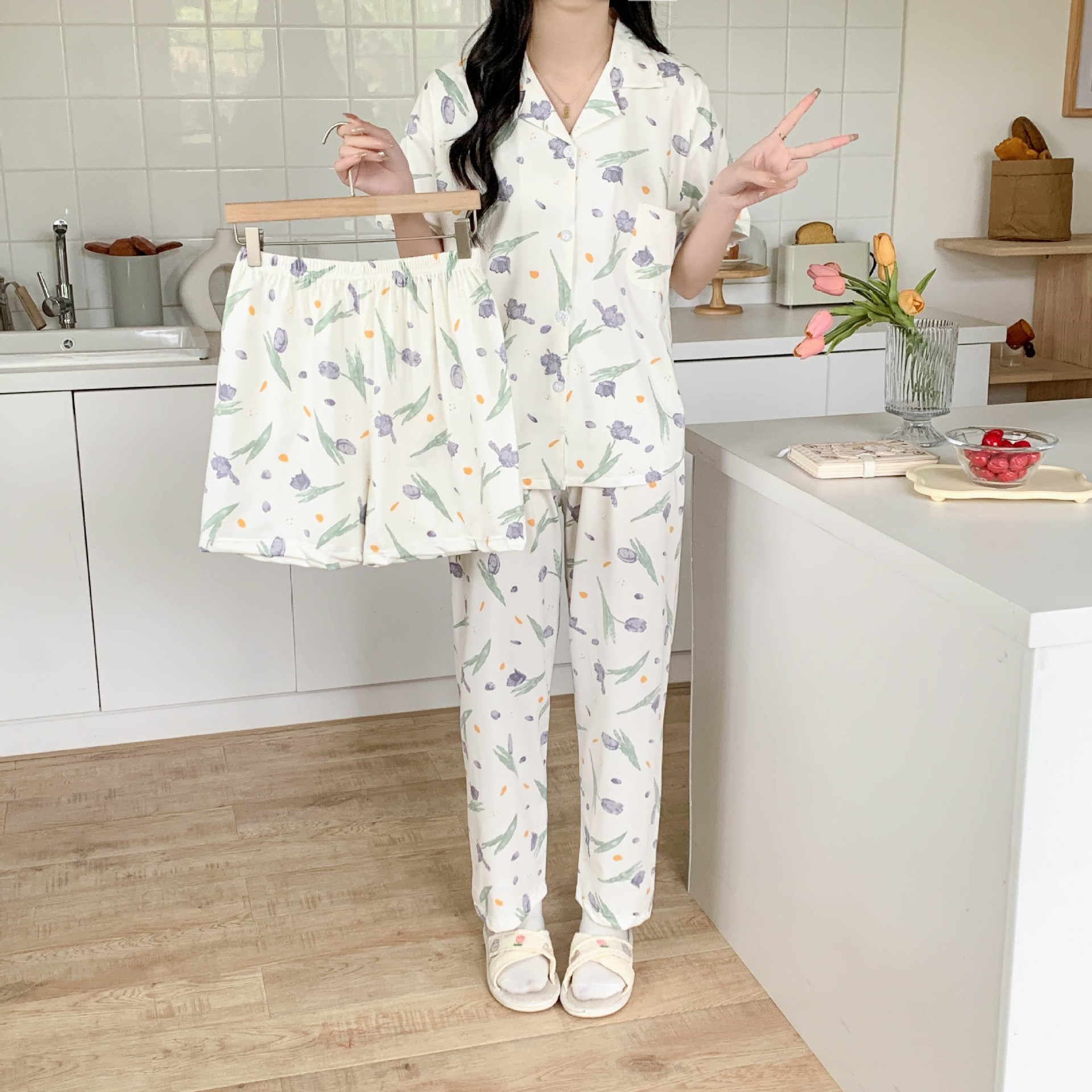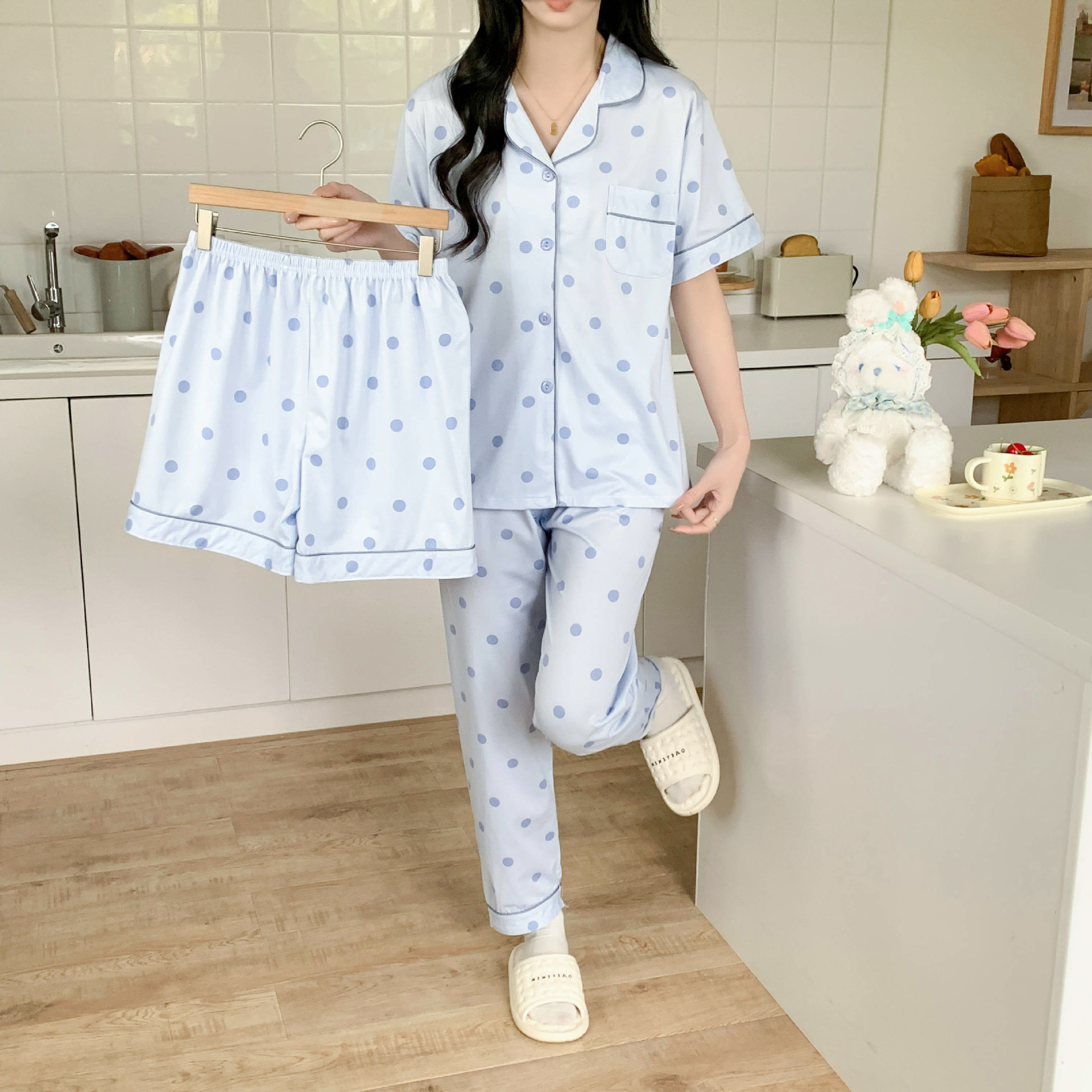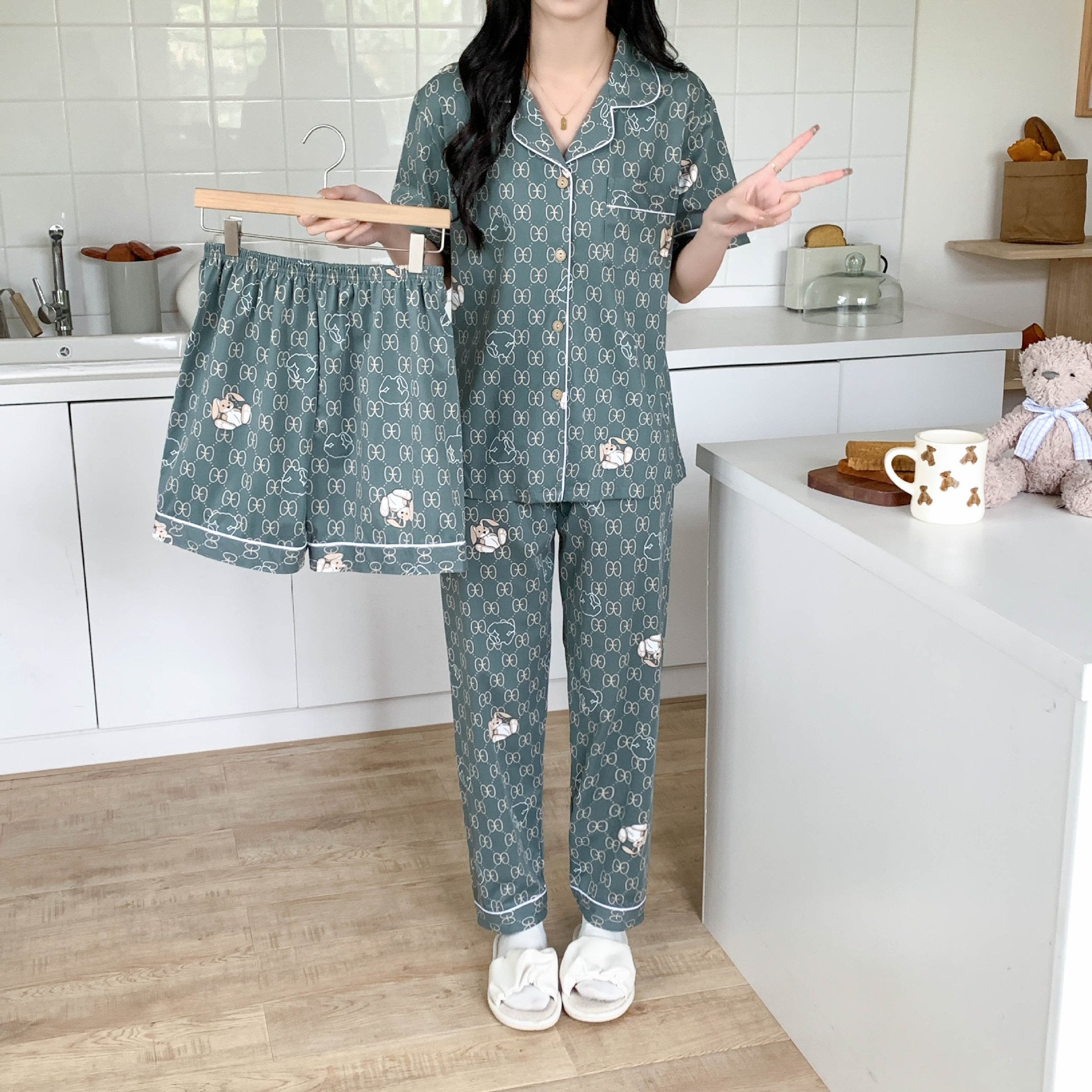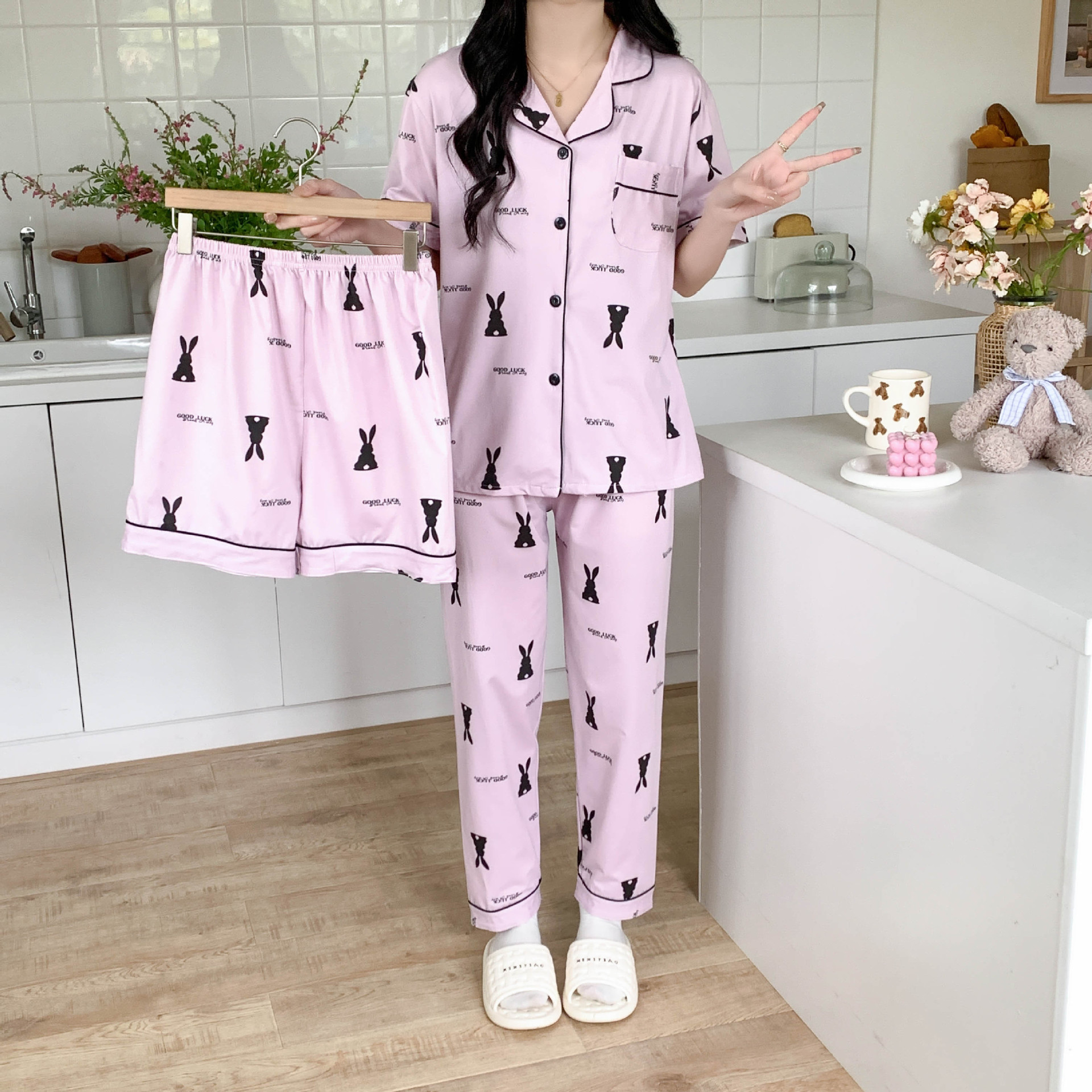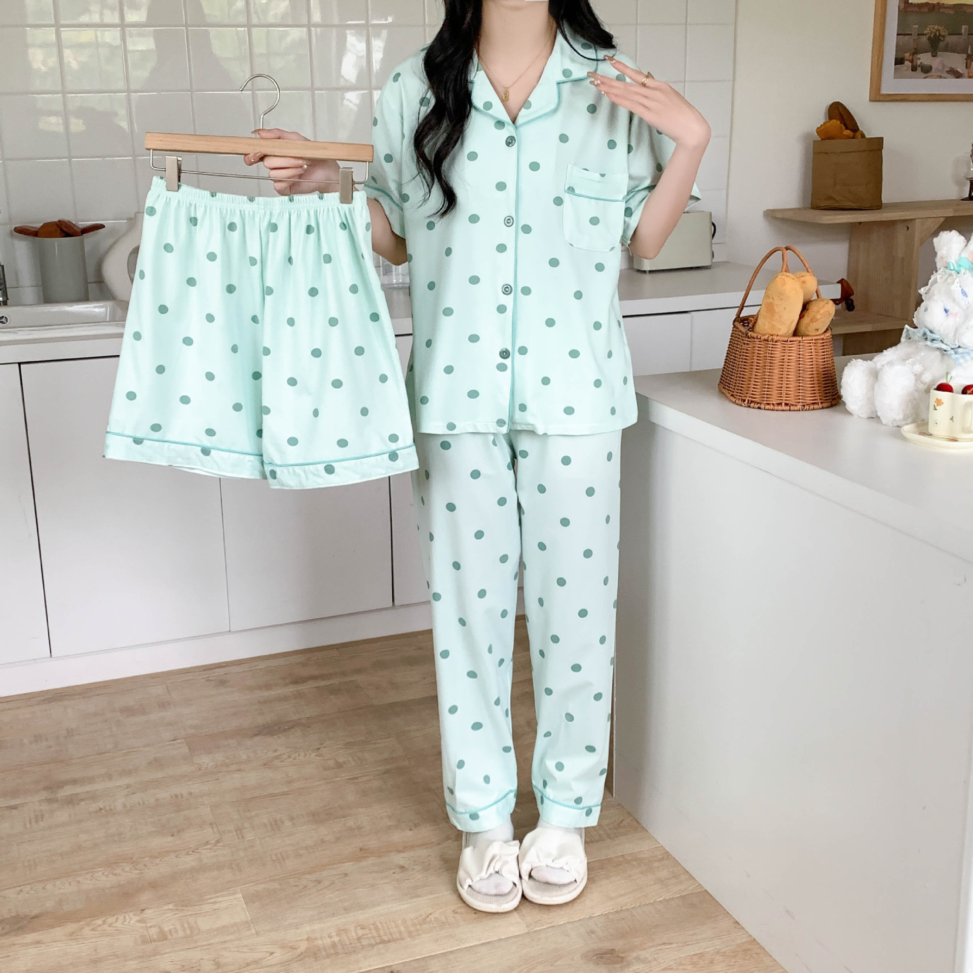 한국 잠자는 이순은 2024 개 이상의 옵션 3 피스 작은 신선한 잠옷 여성용 반팔 바지 홈웨어는 외부에서 입을 수 있습니다.스토어 가기