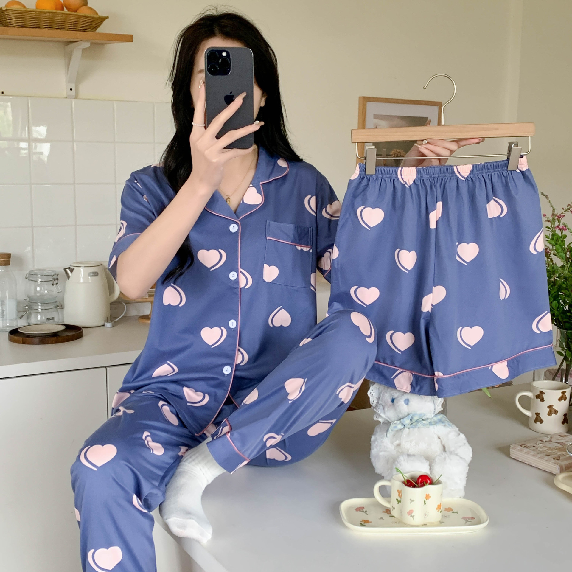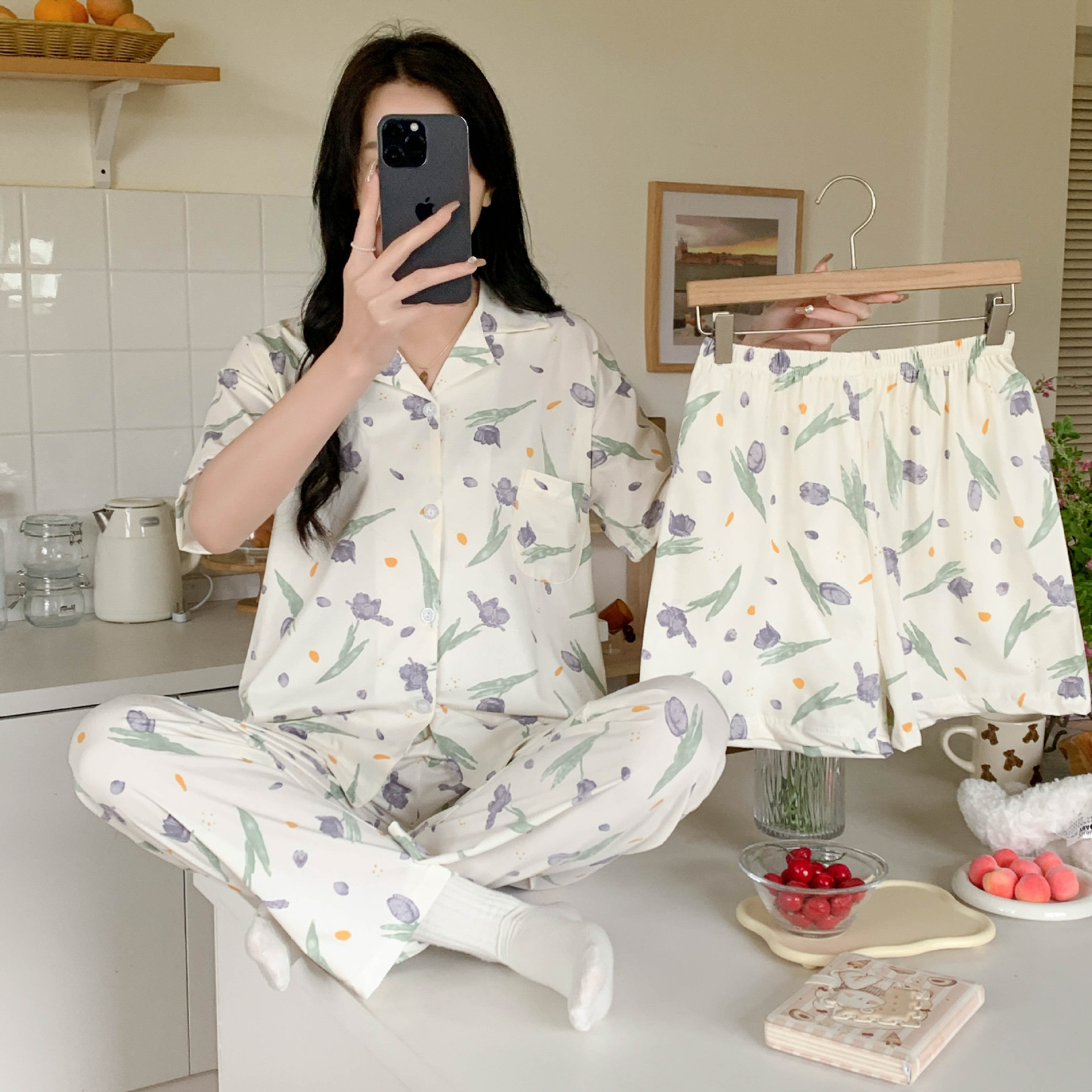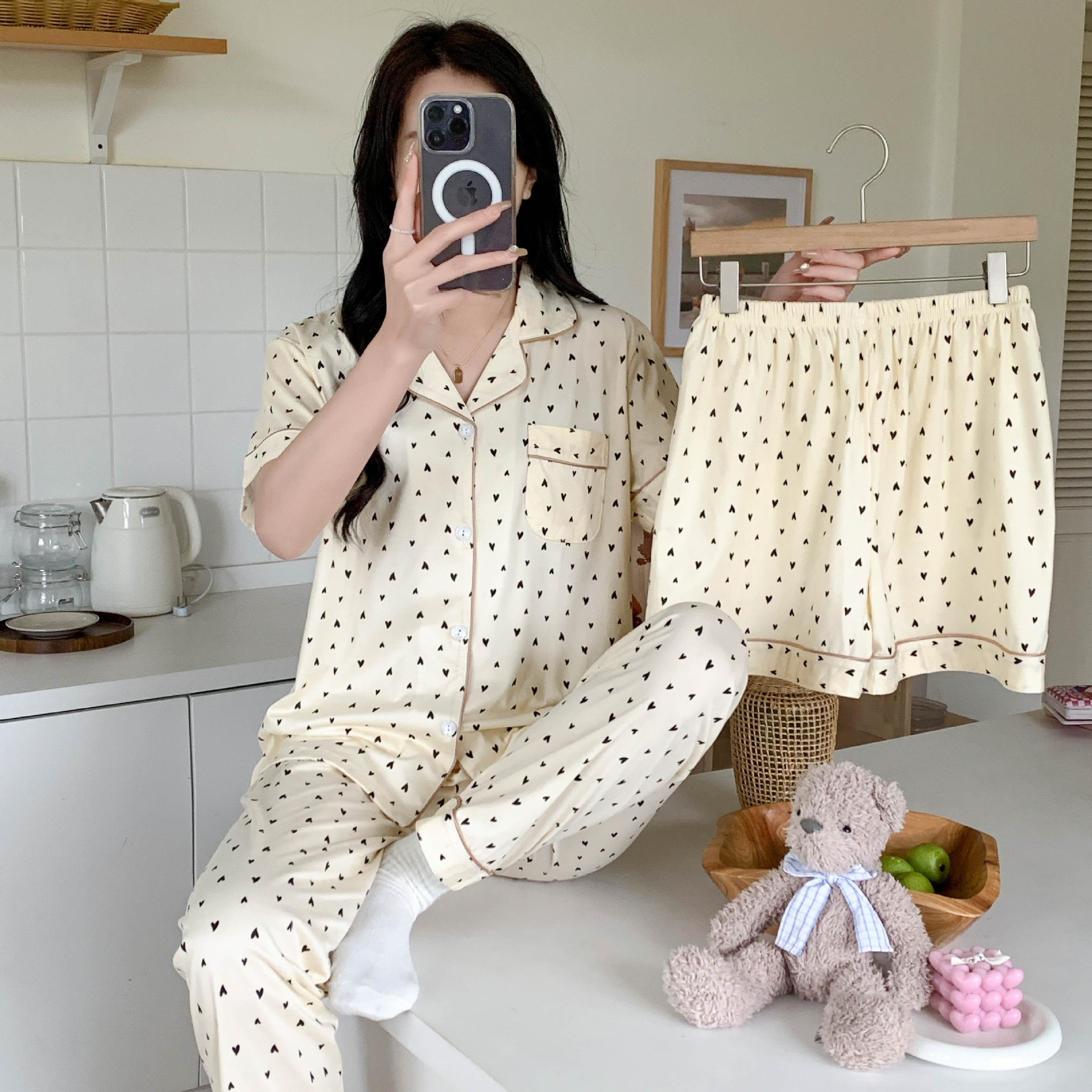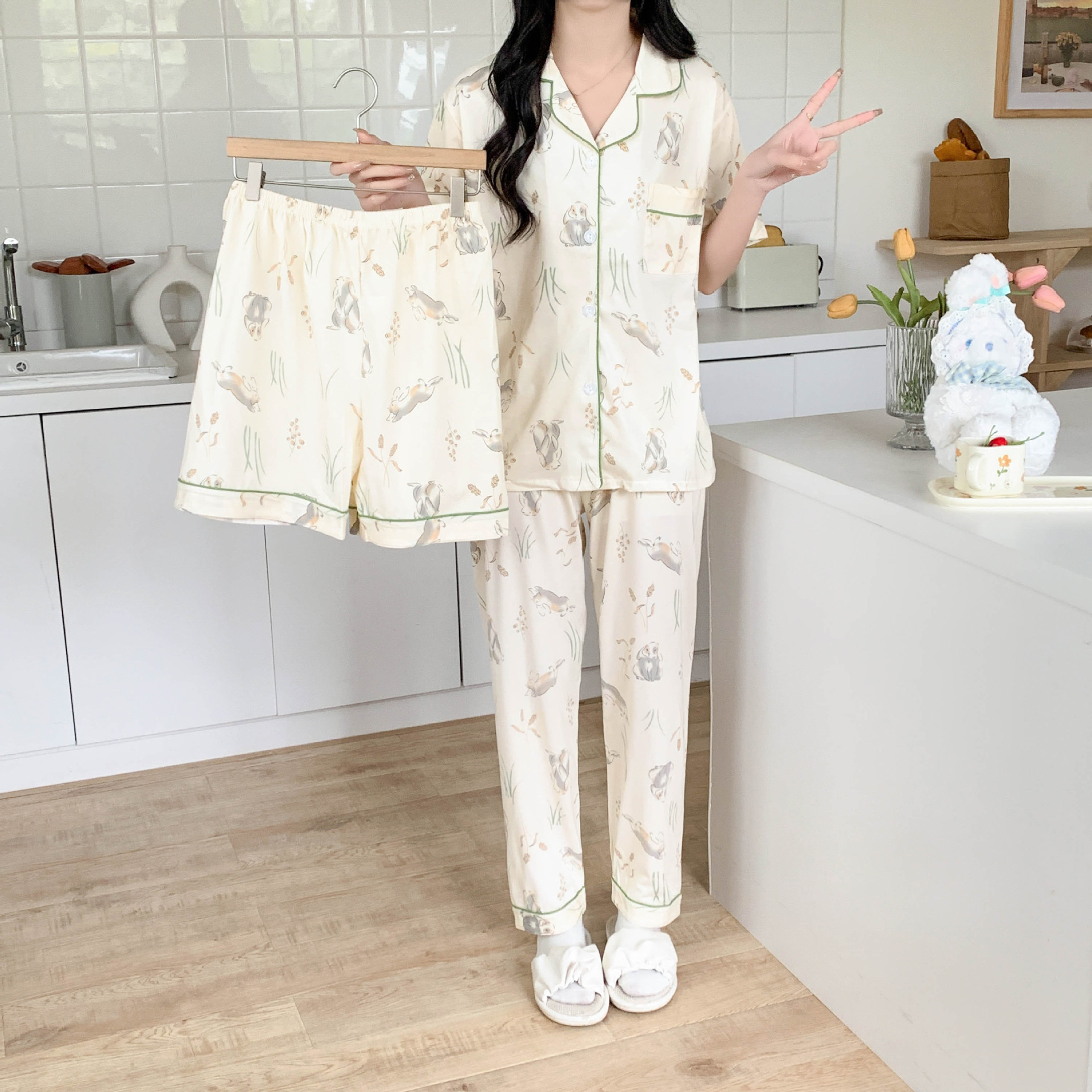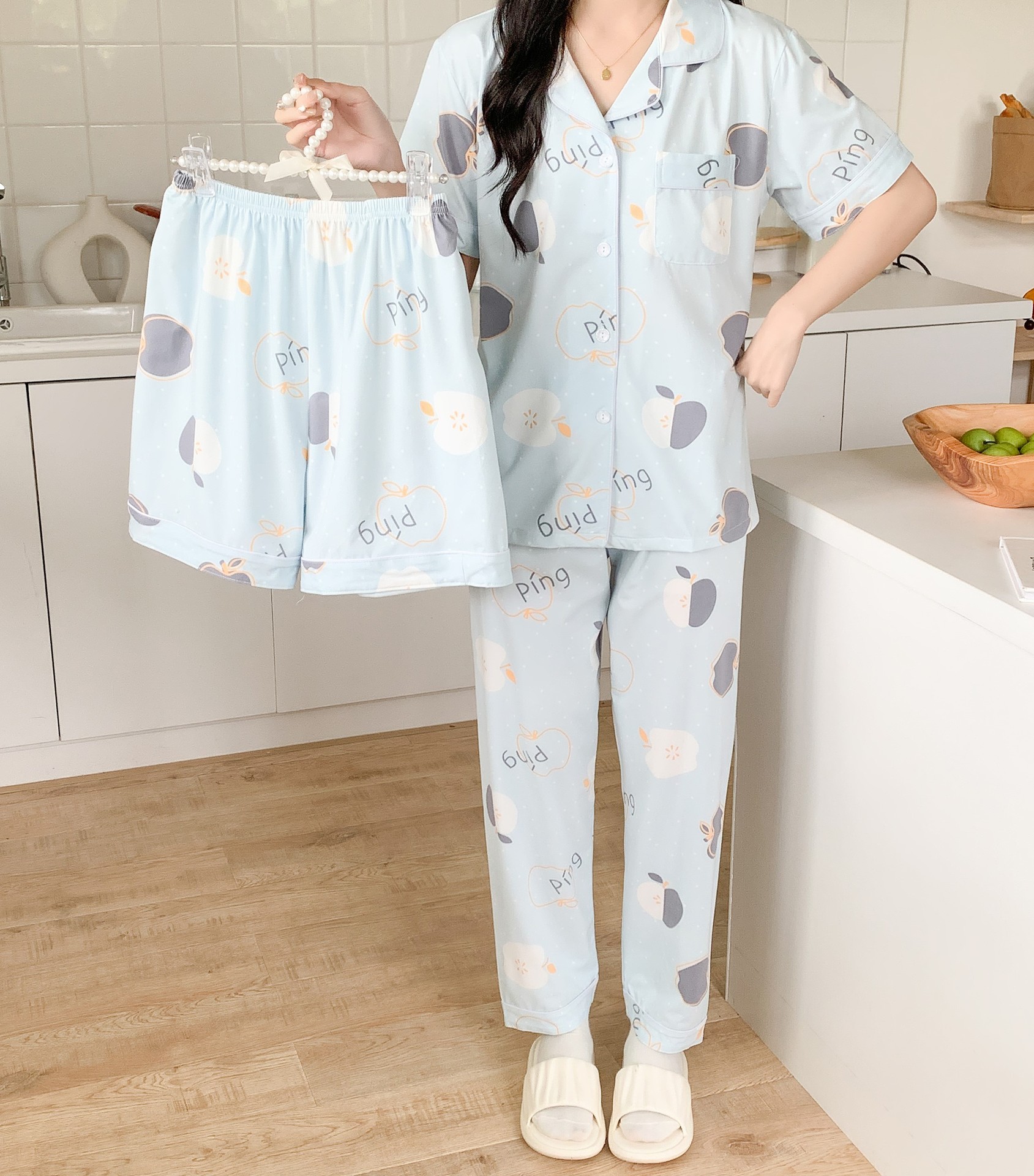 한국 잠자는 이순은 2024 개 이상의 옵션 3 피스 작은 신선한 잠옷 여성용 반팔 바지 홈웨어는 외부에서 입을 수 있습니다.스토어 가기