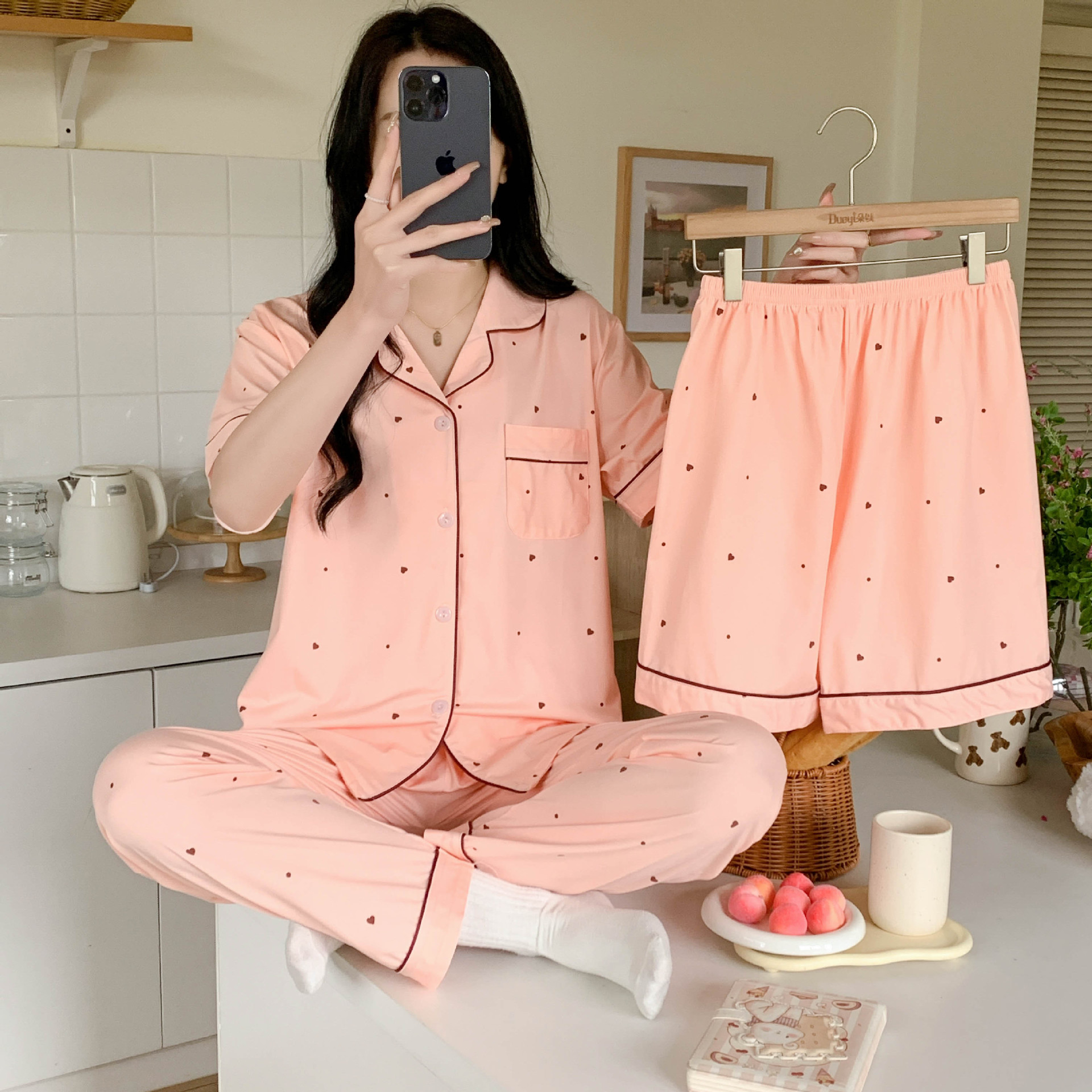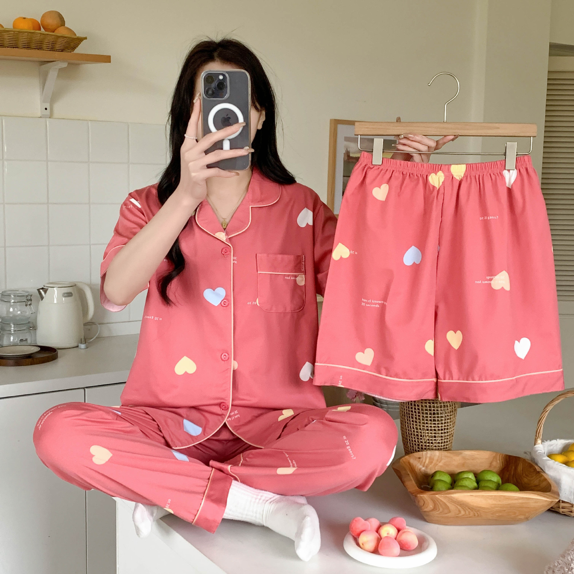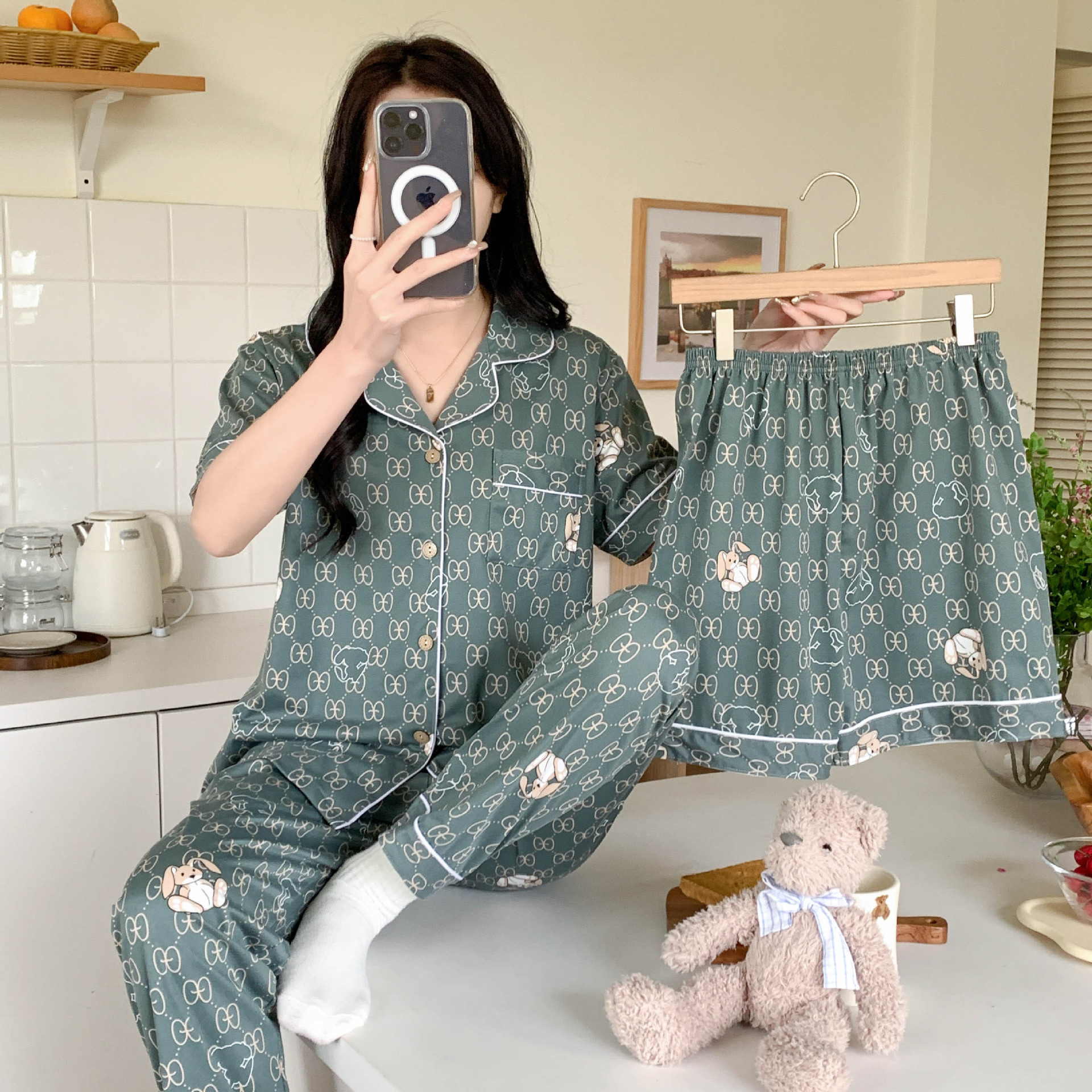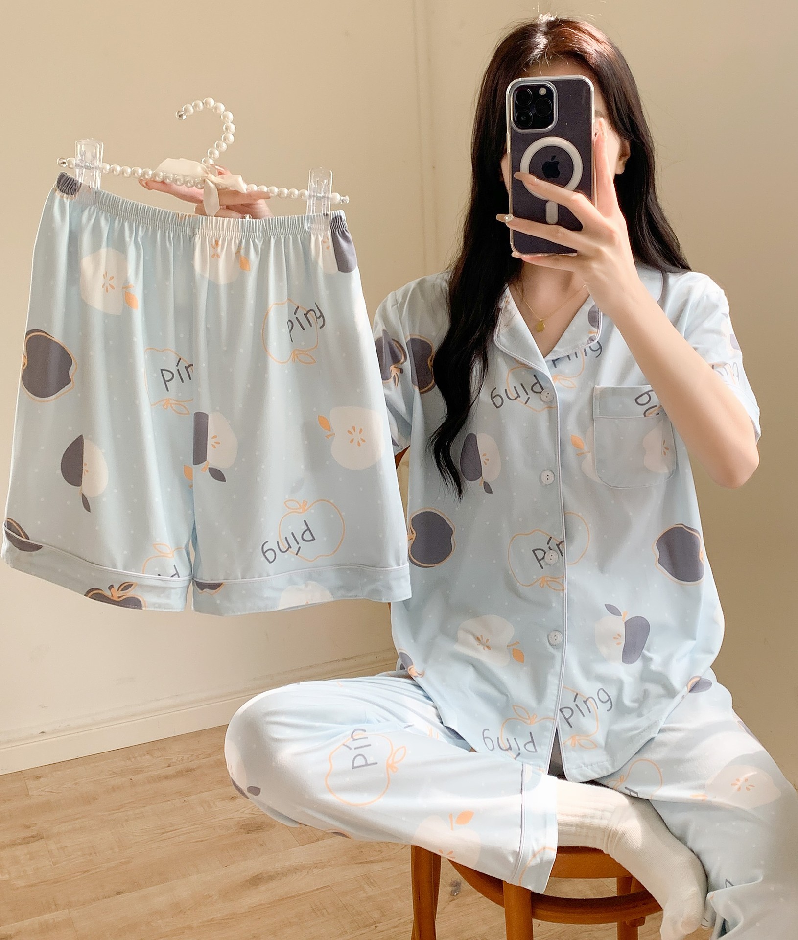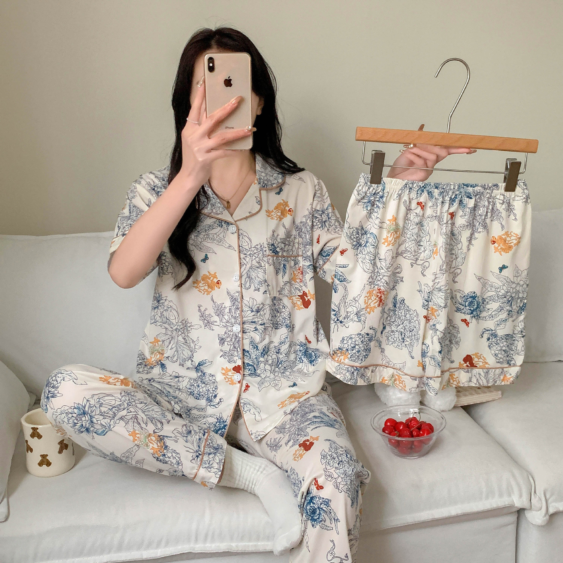 한국 잠자는 이순은 2024 개 이상의 옵션 3 피스 작은 신선한 잠옷 여성용 반팔 바지 홈웨어는 외부에서 입을 수 있습니다.스토어 가기
