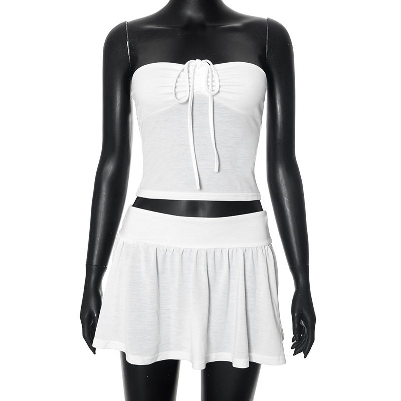 D24ST006 유럽과 미국 여성의 여름 새로운 교수형 목 튜브 탑 백리스 플리츠 러플 스커트 캐주얼 세트 여성스토어 가기
