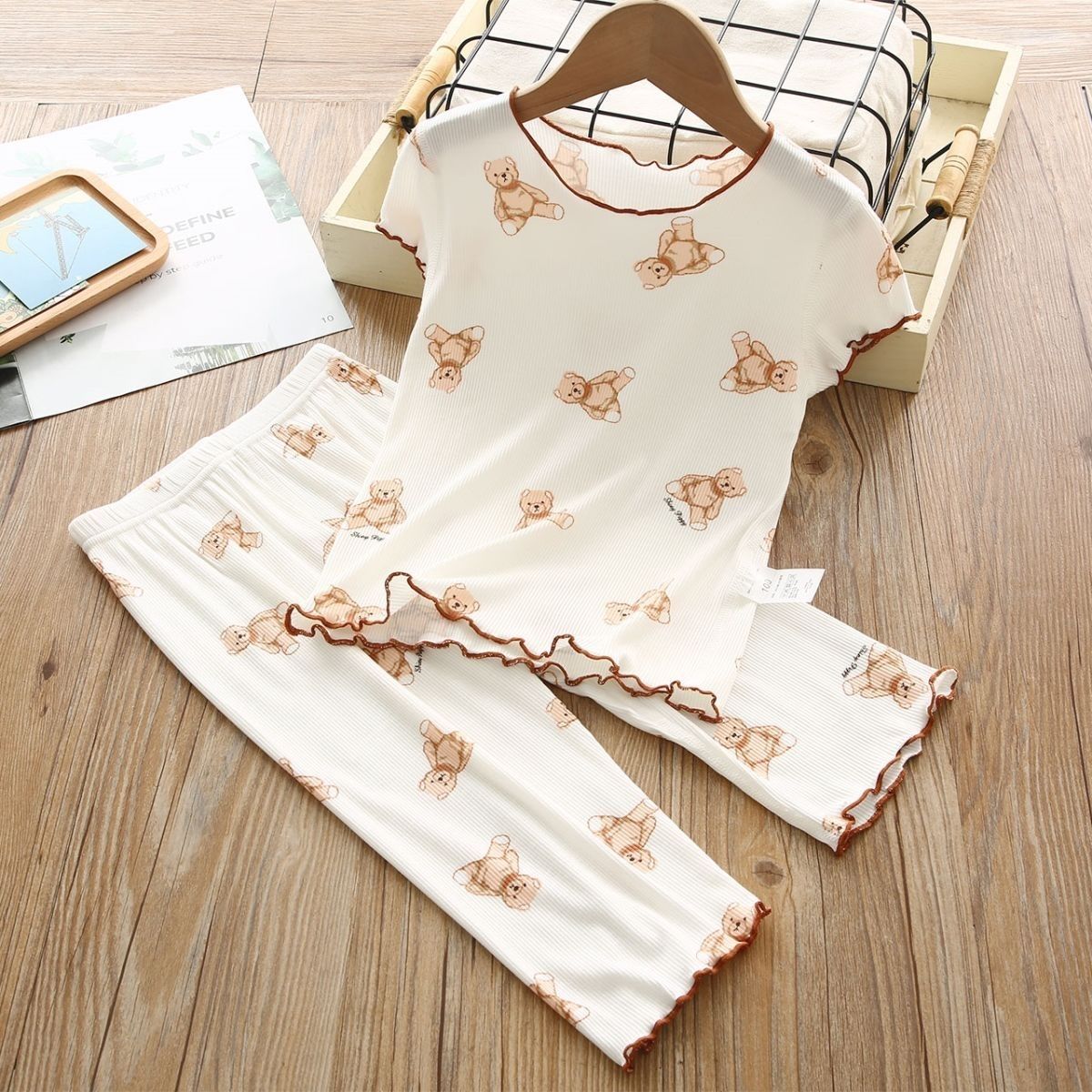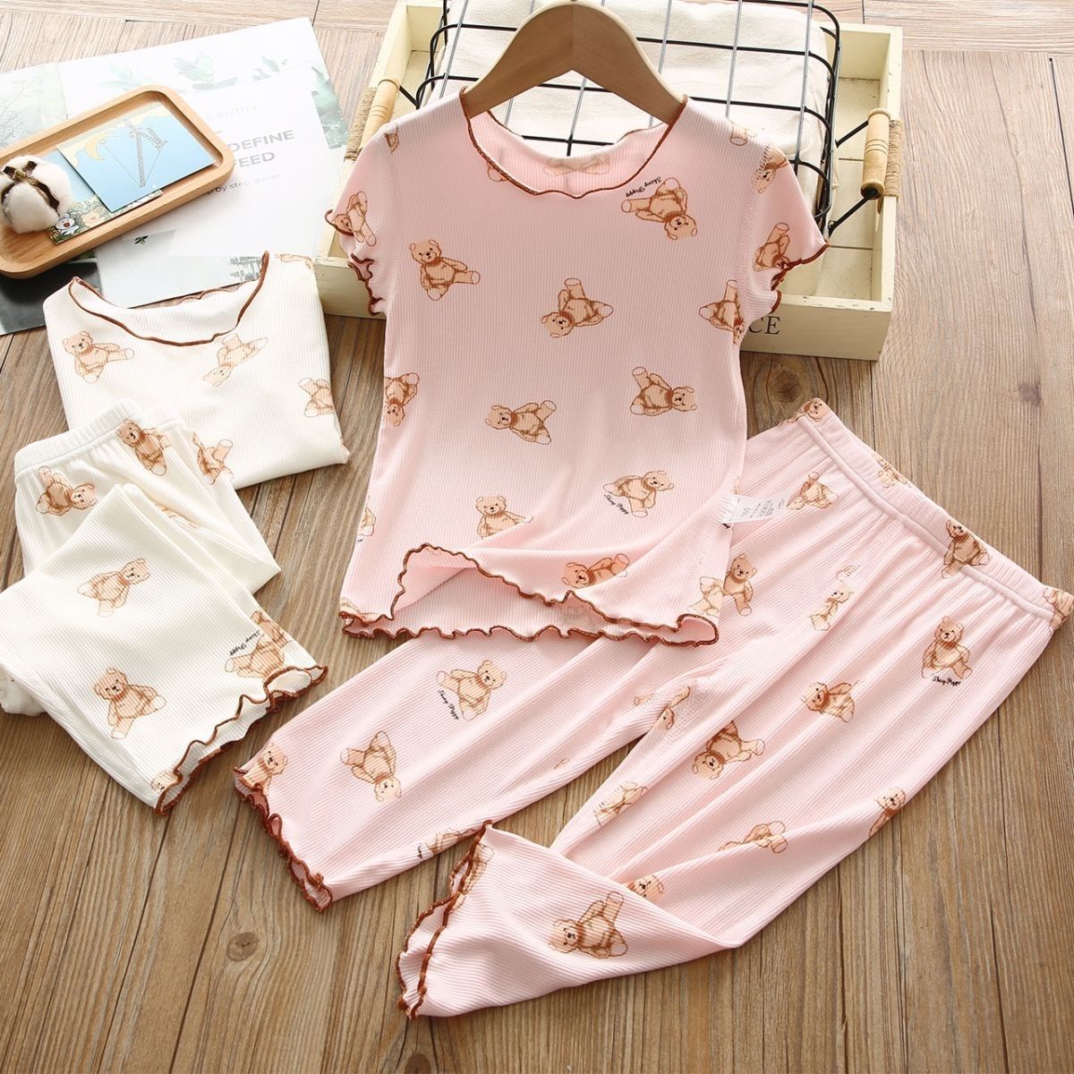소녀 여름 잠옷 투피스 홈 착용 에어컨 아이스 실크 곰 얇은 짧은 소매 어린이 세트 공장 도매스토어 가기