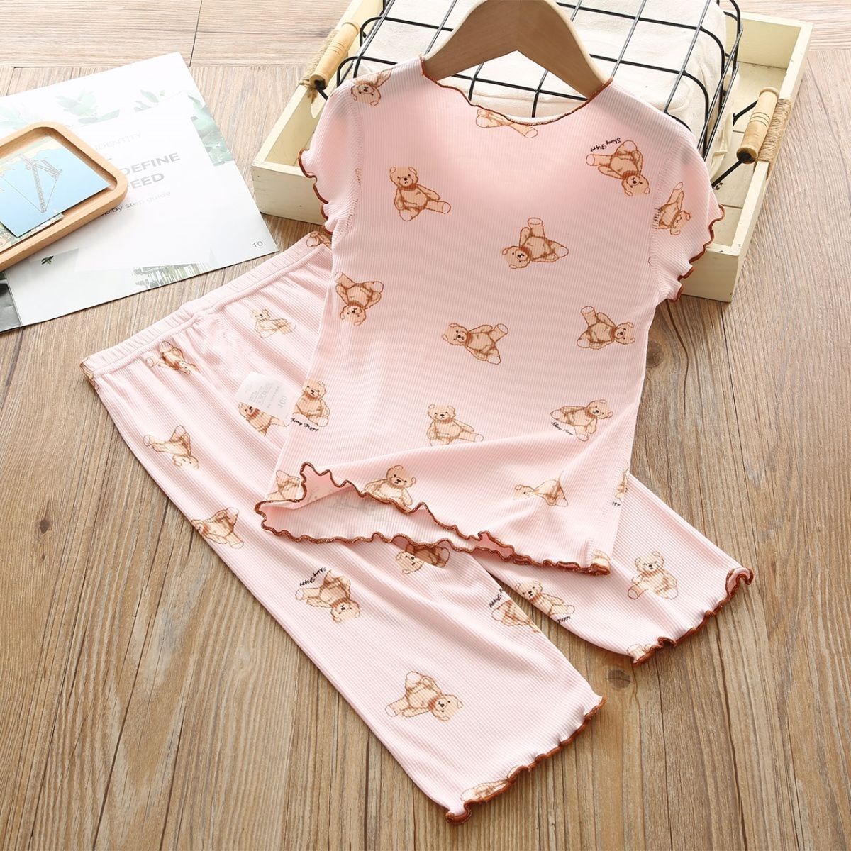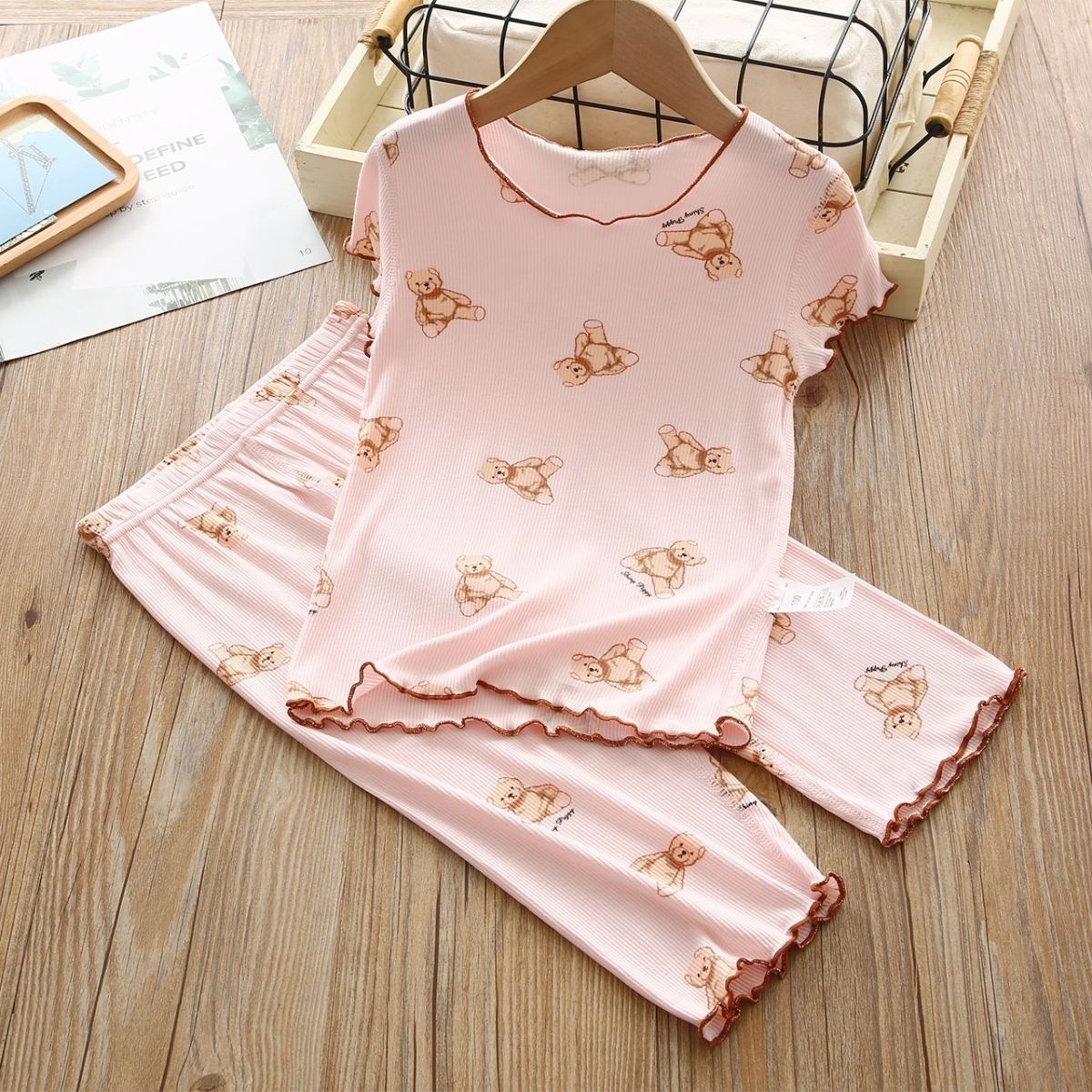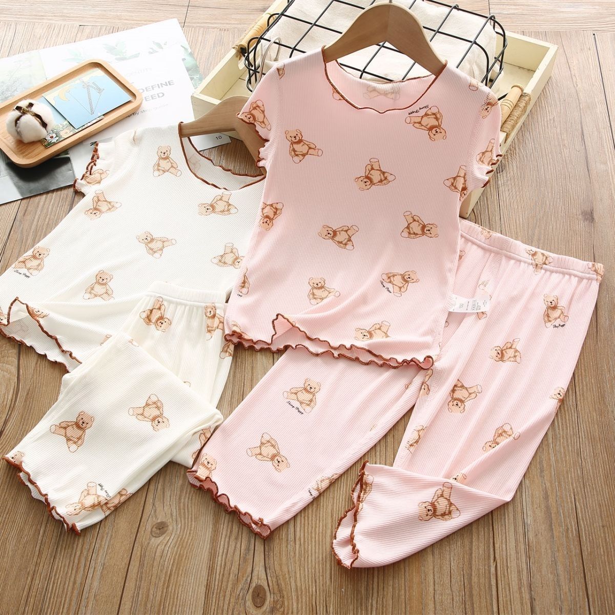 소녀 여름 잠옷 투피스 홈 착용 에어컨 아이스 실크 곰 얇은 짧은 소매 어린이 세트 공장 도매