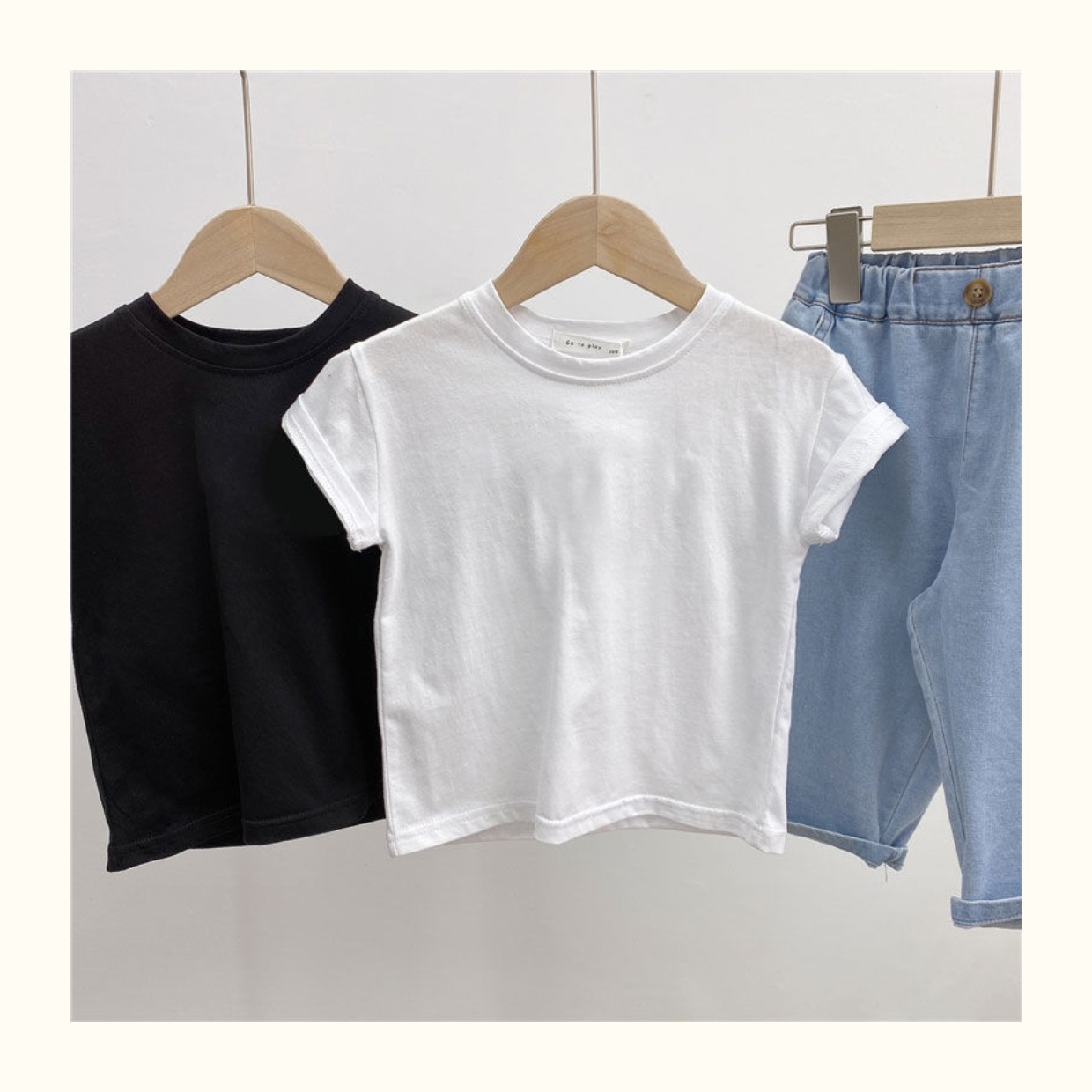 소년 소녀 100% 반팔 티셔츠 여름 둥근 목 흑백 단색 어린이 반소매 아기 바닥 셔츠스토어 가기