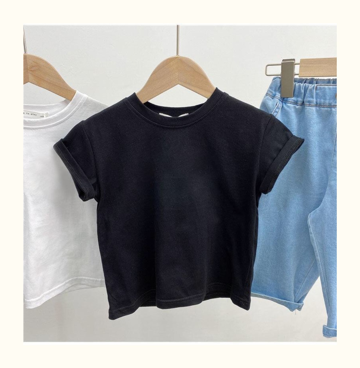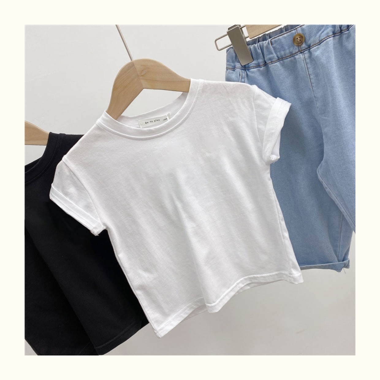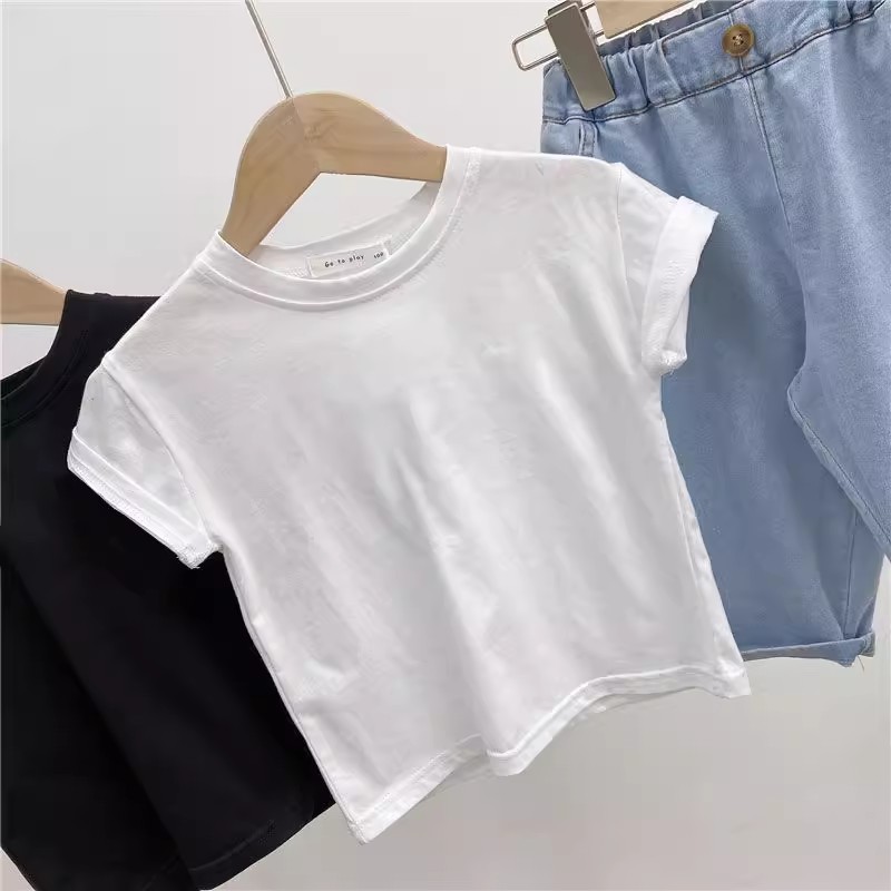 소년 소녀 100% 반팔 티셔츠 여름 둥근 목 흑백 단색 어린이 반소매 아기 바닥 셔츠