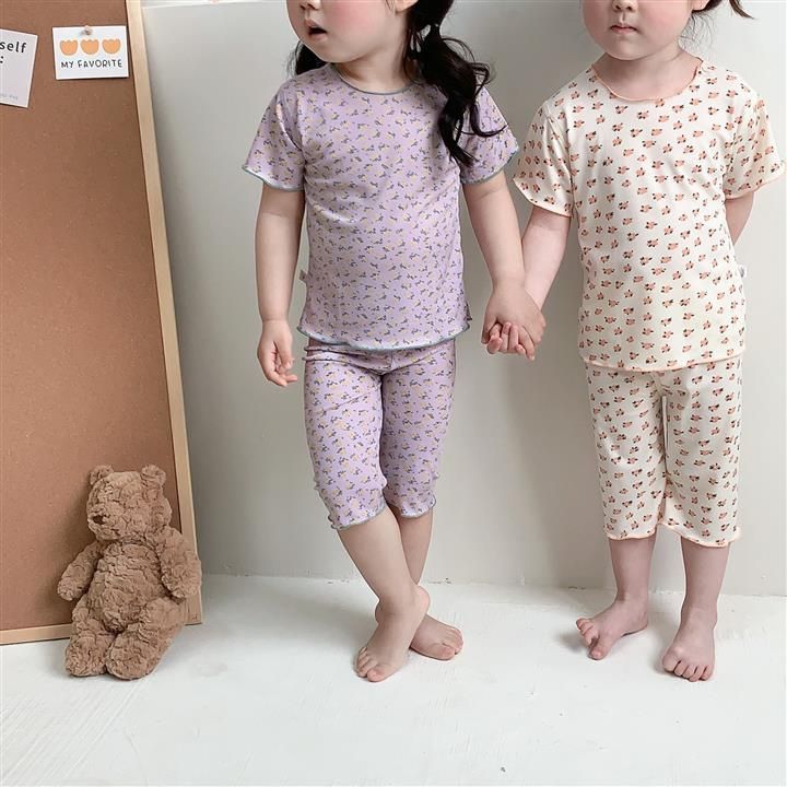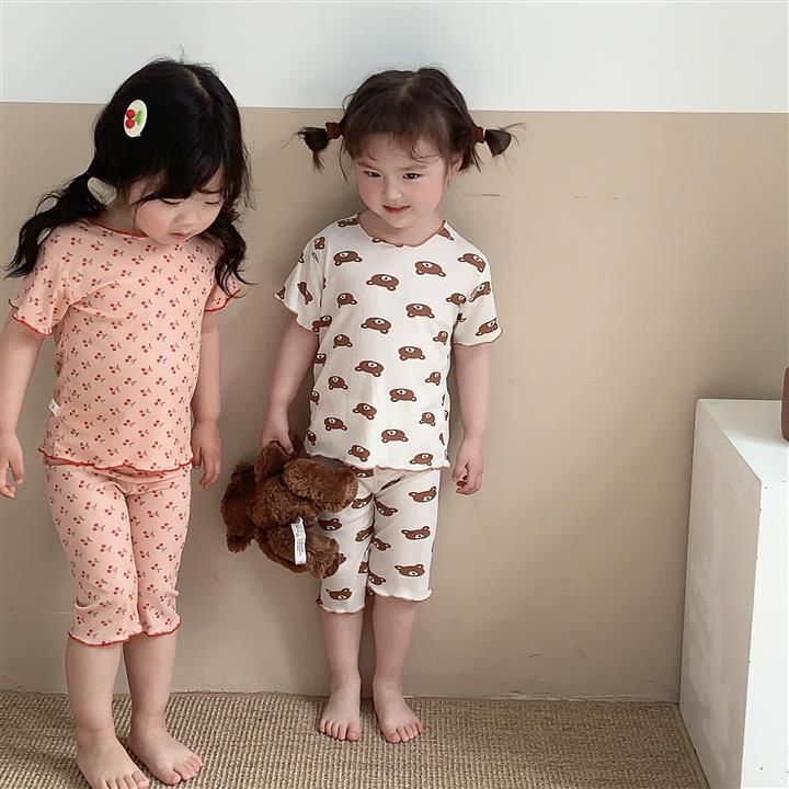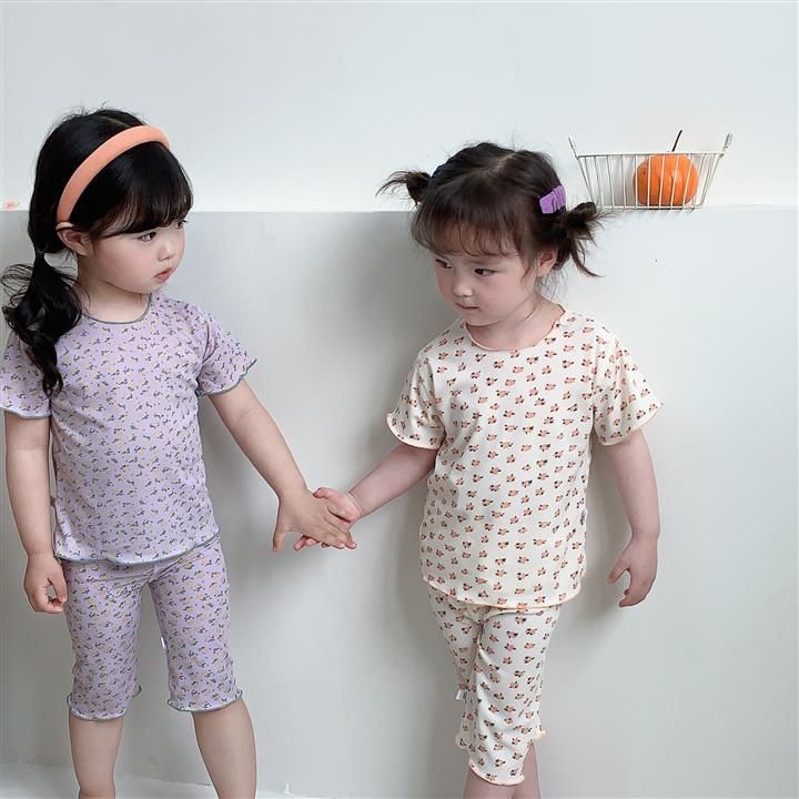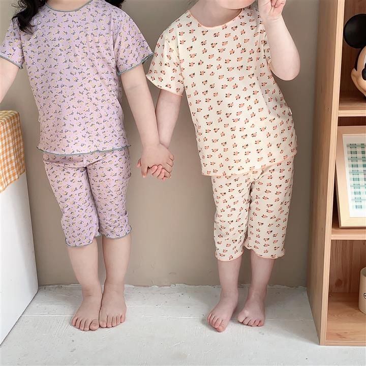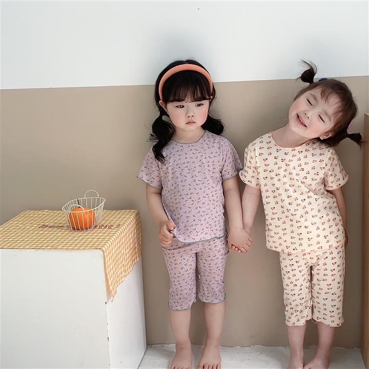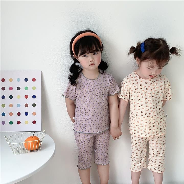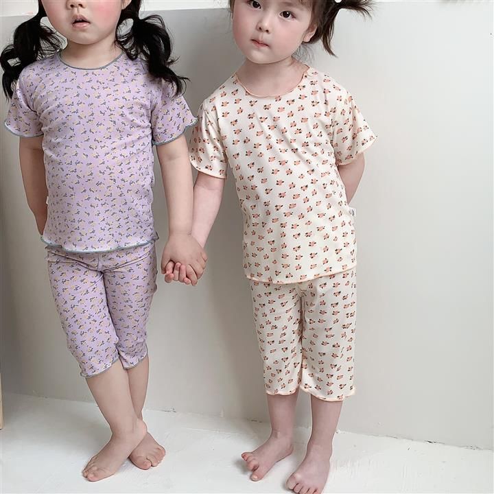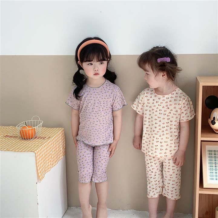 어린이 잠옷 여름 아이스 실크 얇은 세트 소녀 홈 옷 꽃 달콤한 짧은 소매 2 피스 공장 도매스토어 가기