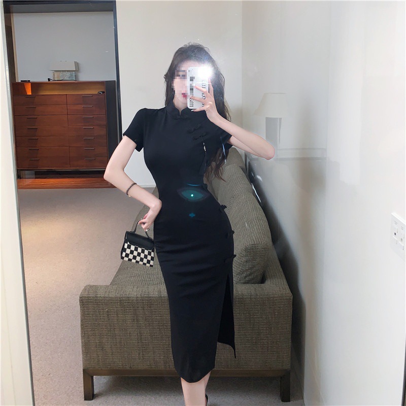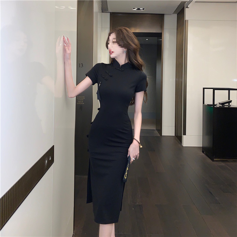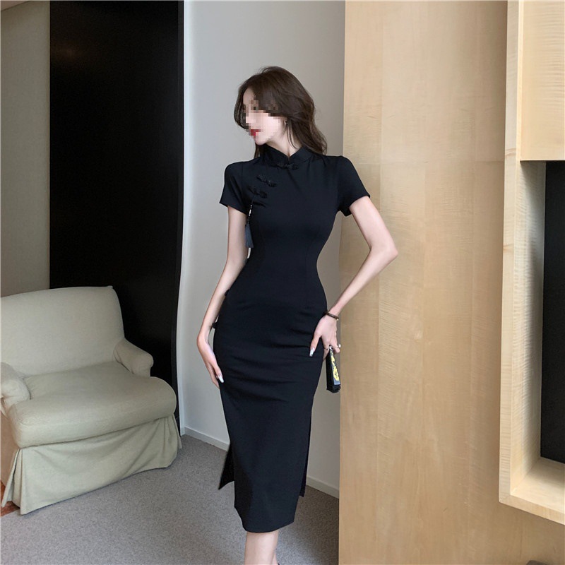 대외 무역 도매 여름 중국 복고풍 버클 cheongsam 원피스 여성 블랙 원피스 허리 스플릿 시스 원피스스토어 가기