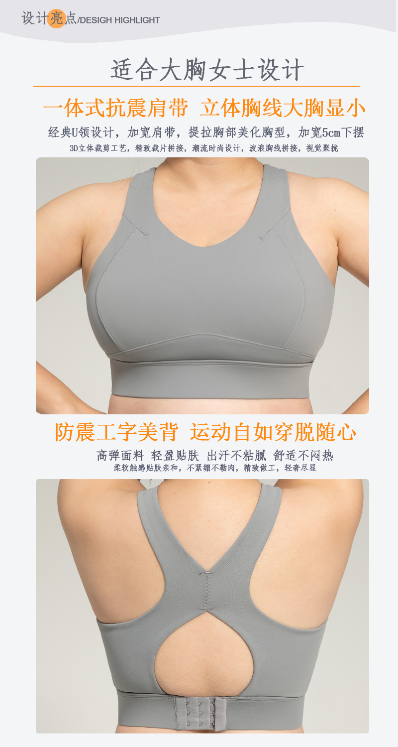 새로운 스타일의 큰 가슴을 작아 보이게 하는 스포츠 브라, 고강도 충격 방지 트레이닝 조끼, 일체형 I자형 등 라인이 아름다운 피트니스 브라