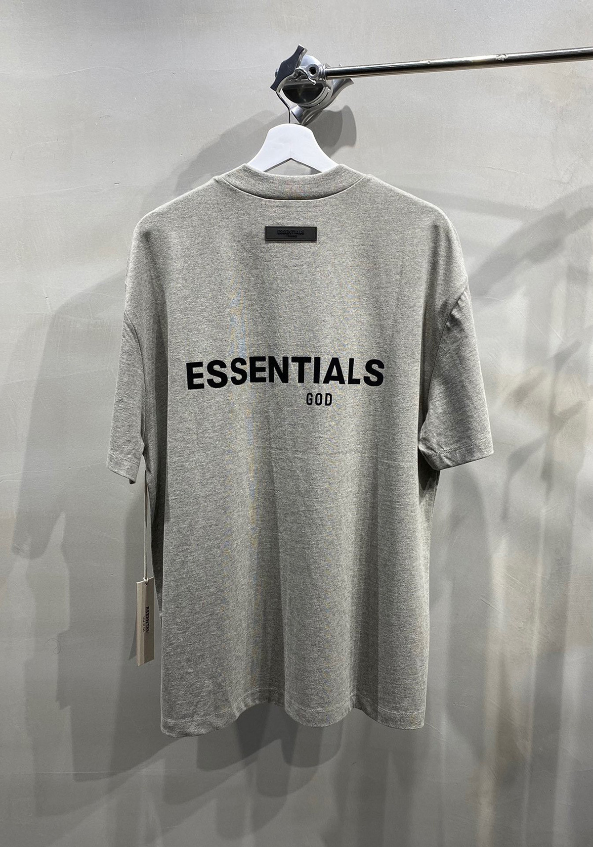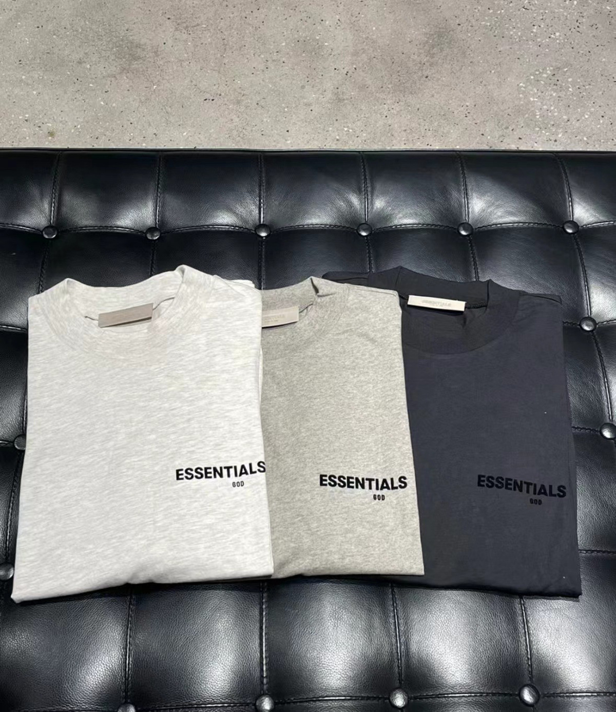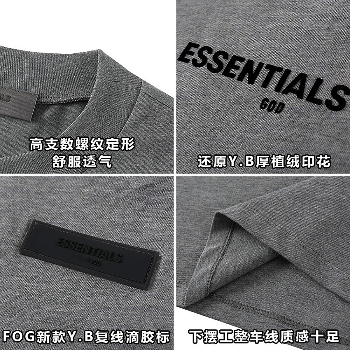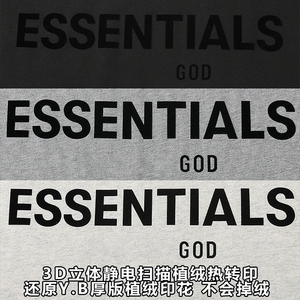 这一季新款摒弃沿用好几年的logo、改用植绒印花(静电植绒)在衣服版型设计上也做了些调整、比如更宽的领口,铁青色的配色等等。水洗和领标等辅料也更新换代、标全部是新的硅胶标、加上全新洗水唛、吊牌、特别是后背的硅胶ESSENTIALS加宽、全新的黑色外包装!面料克重240g ,原厂面料,洗水处理,不缩水不变形、螺纹单独定制调纱定染、 燕麦色不是染色工艺,花织工艺单独定制,重点印花是进口霓虹国静电植绒 底面先定位涂上特制背胶静电冲压下再覆盖植绒手感牢固度绒感、细节上的设计处理充满诚意