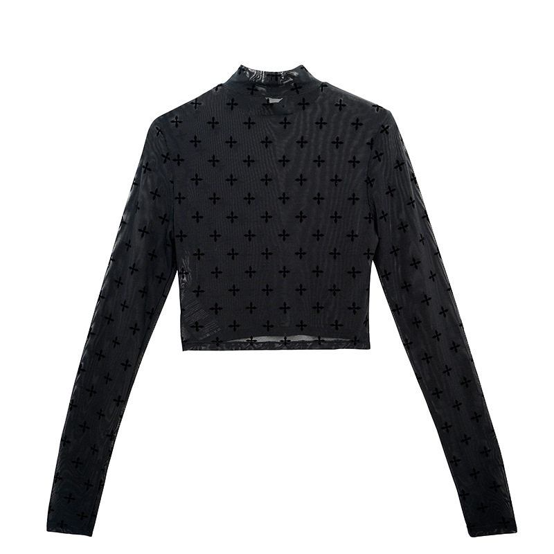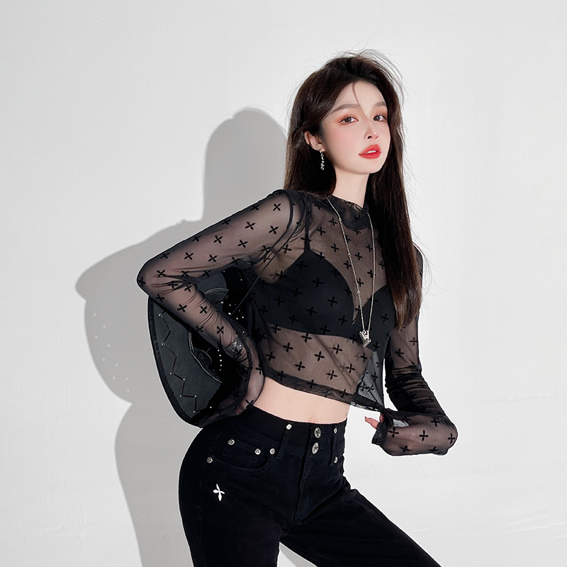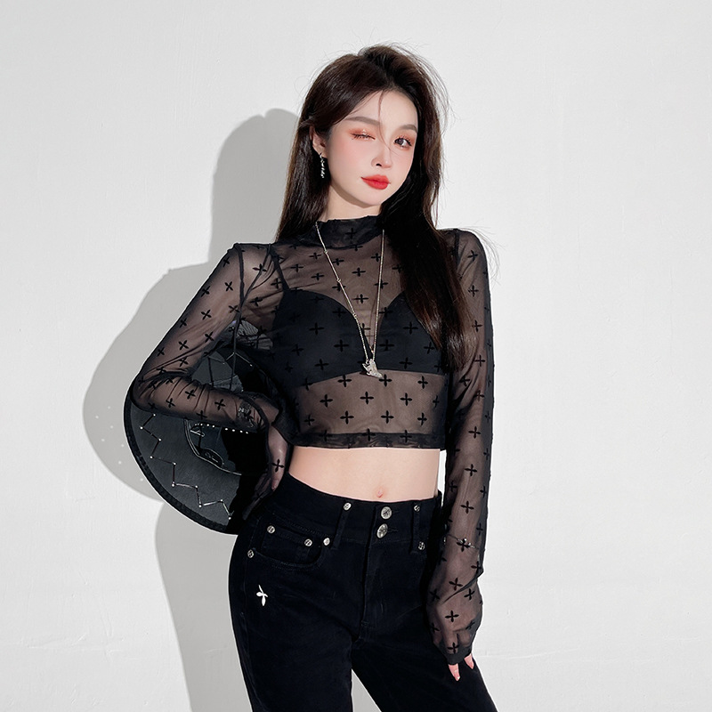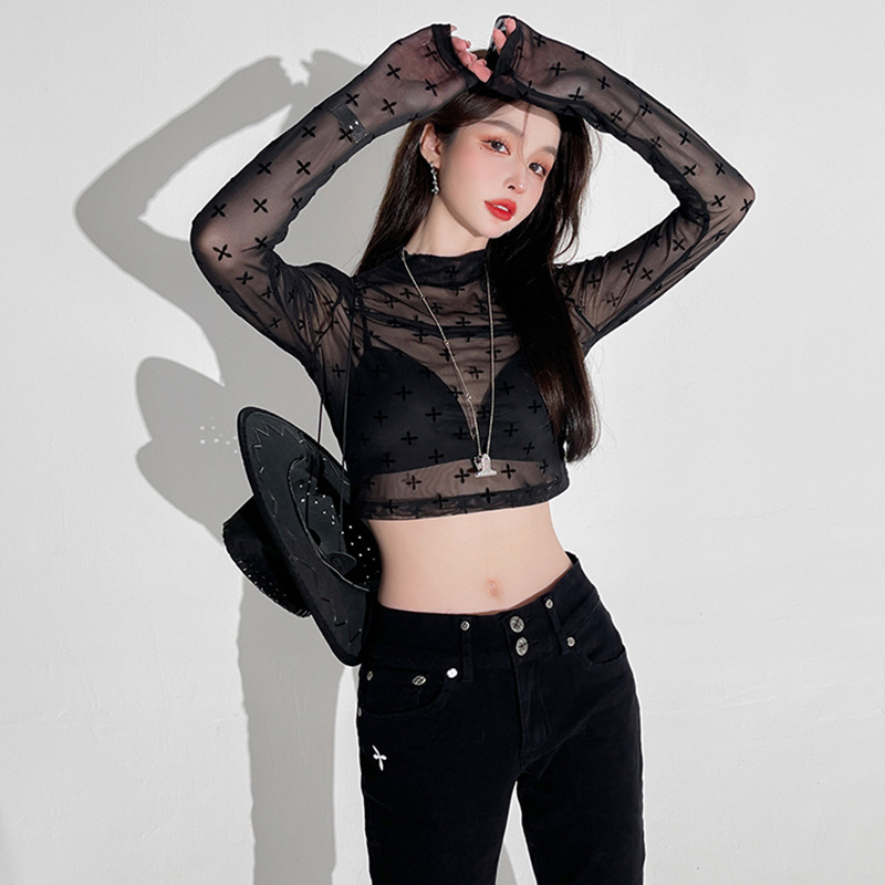 누출 따기 특별 제안 컷 다트 대외 무역 할인 여성 메쉬 프린트 티셔츠 여성용 긴 소매 내부 디자인, 태양 보호 의류스토어 가기
