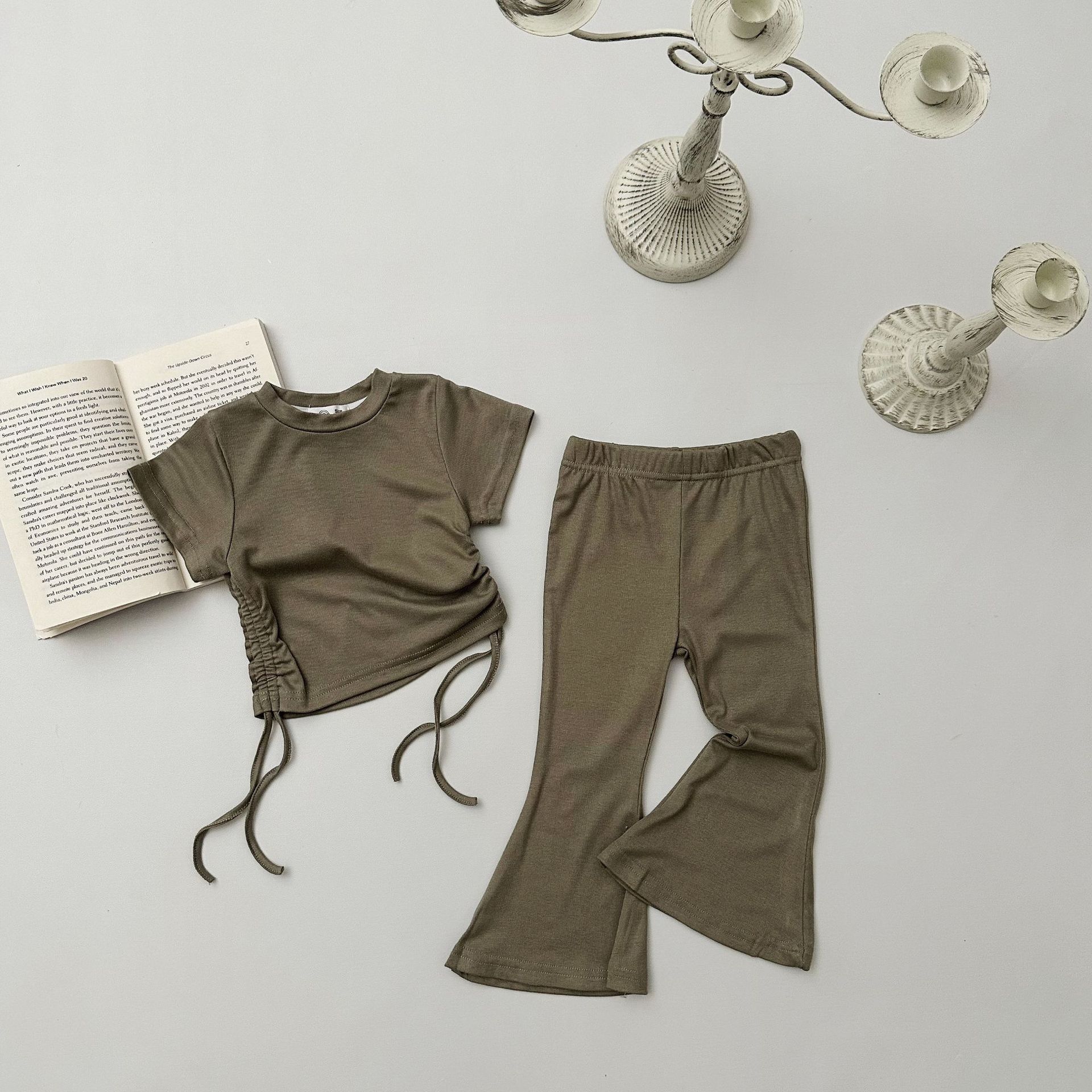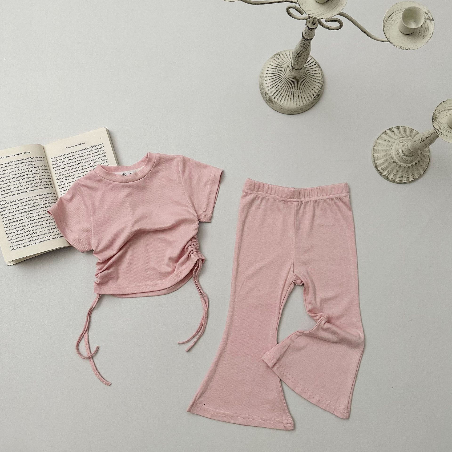 소녀 여름 세트 한국식 반팔 티셔츠 여름 서양식 drawstring 라운드 넥 탑 아기 여름 새로운 플레어 바지스토어 가기