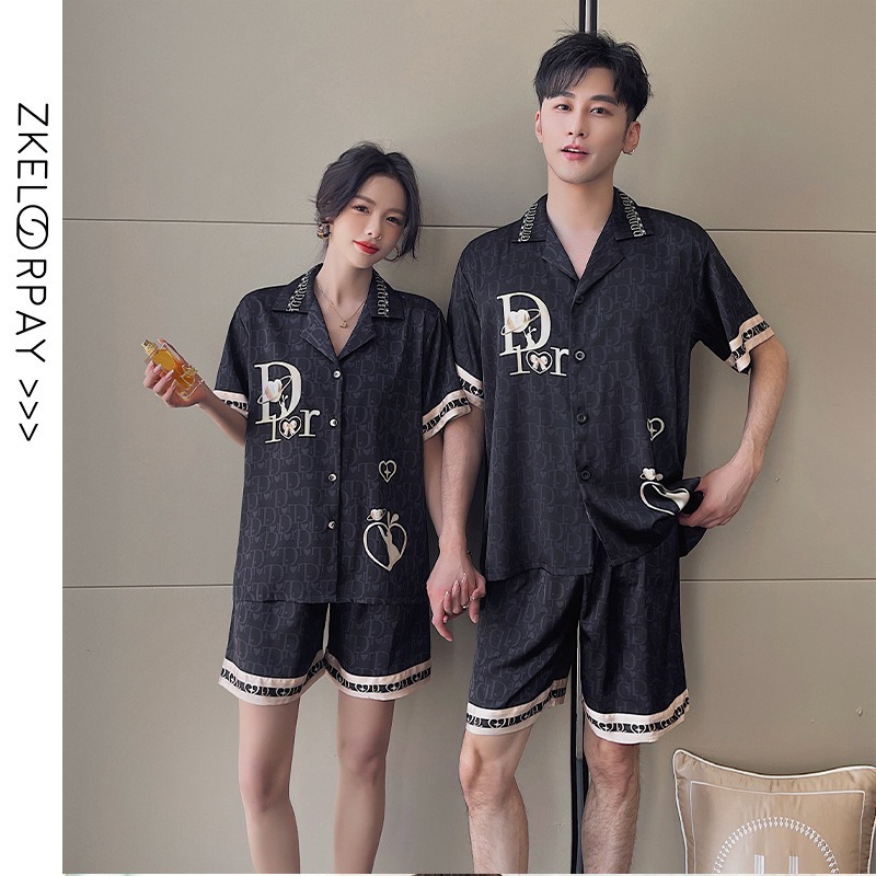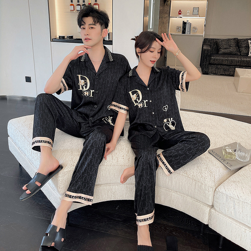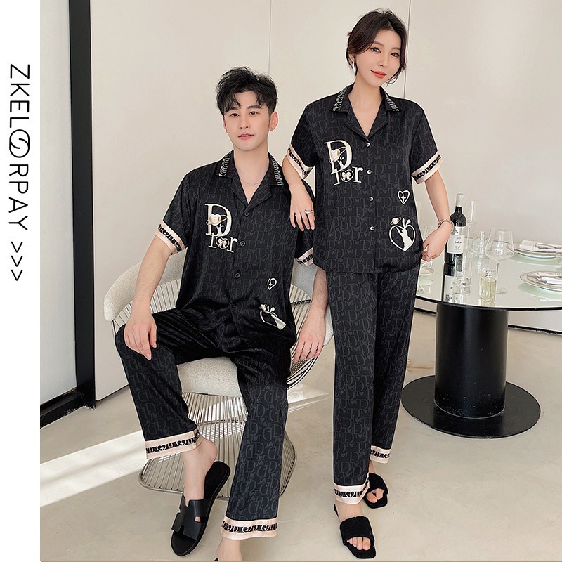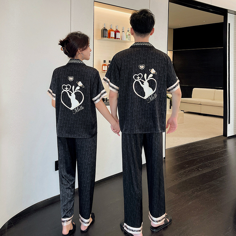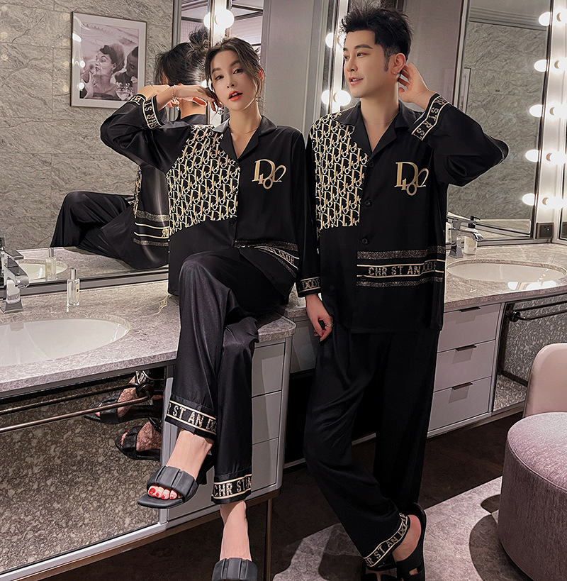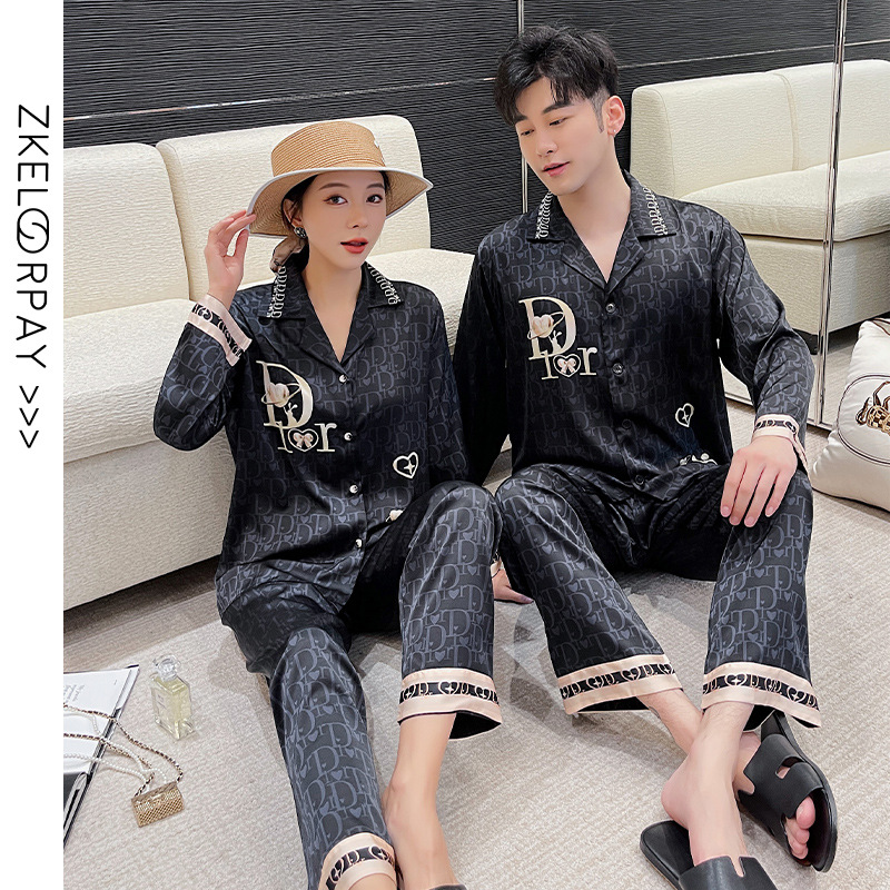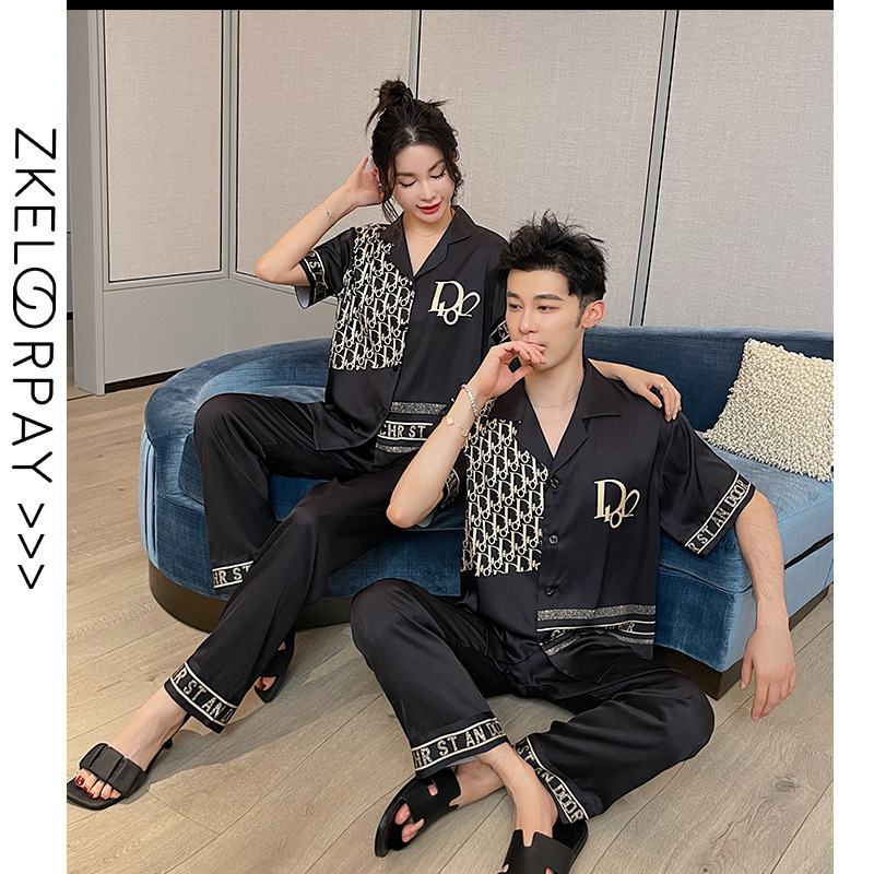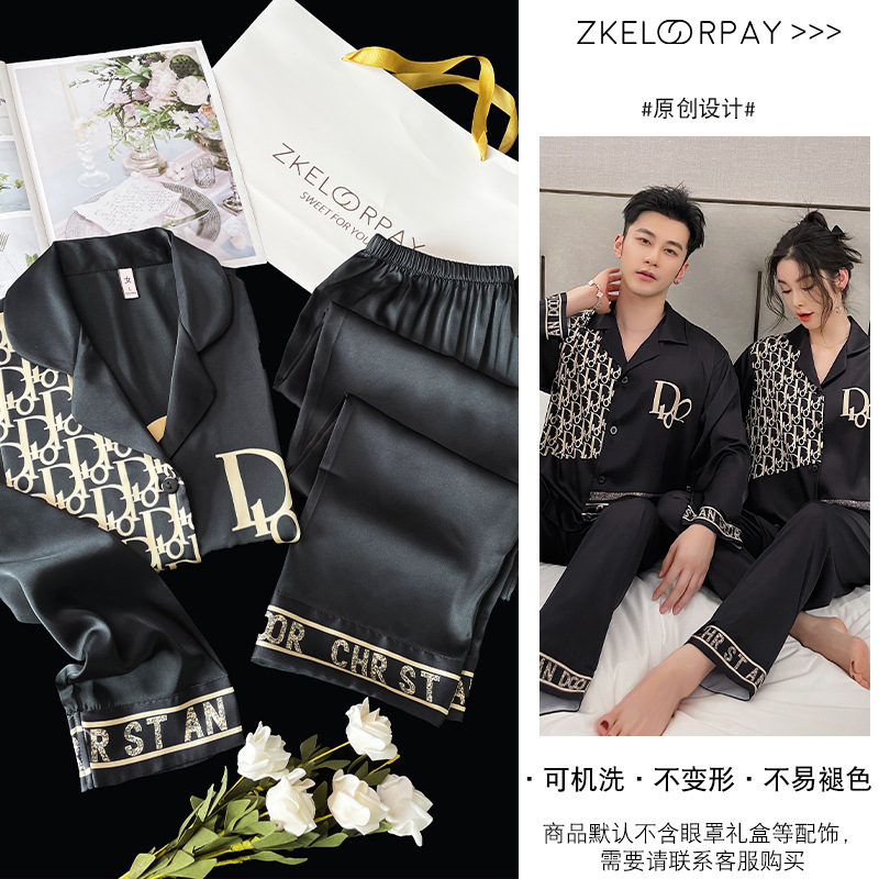 2025년 봄과 가을 신상 커플용 아이스 실크 잠옷 여성 인터넷 스타 스타일 모조 실크 대형 사이즈 홈웨어 남성용 여름