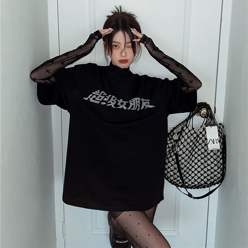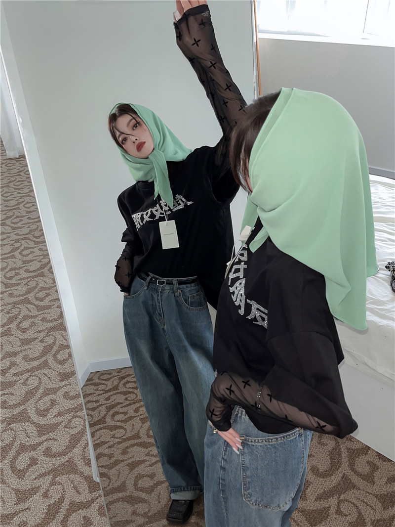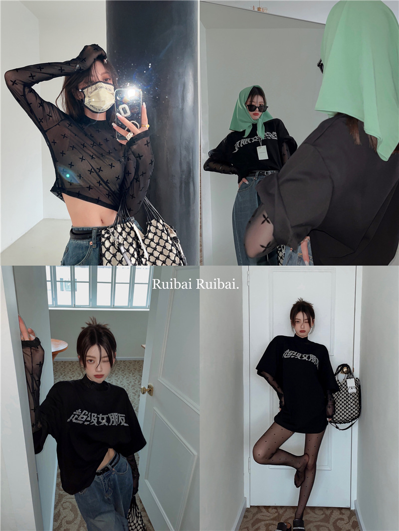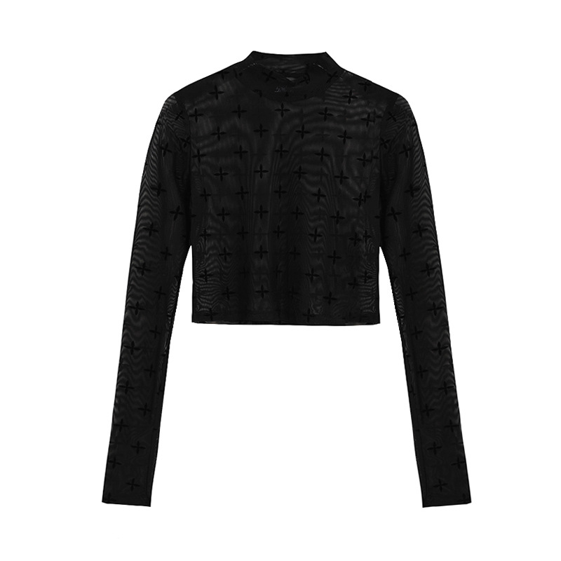 누수 따기 특별 제공 봄과 여름 여성 크로스 메쉬 긴팔 티셔츠 여성용 타이트한 짧은 바닥 셔츠 내부 핫 걸 탑스토어 가기