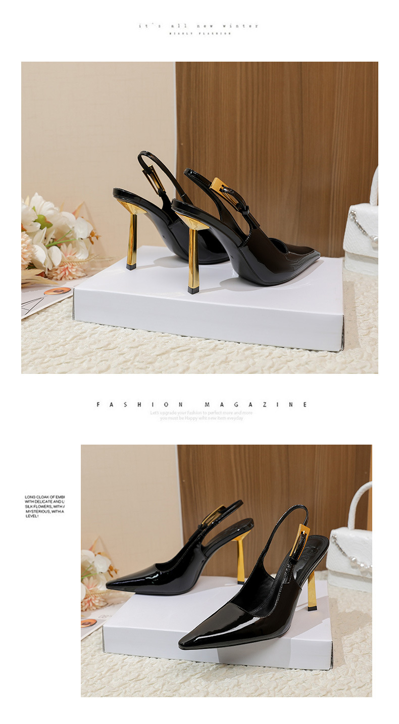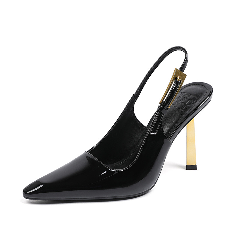 여성용 블랙 페이턴트 가죽 포인티드 토 하이힐, 슬림 힐, 2025년 신상 스타일, 작은 골드 스트립 섹시 싱글 슈즈, 프렌치 샌들