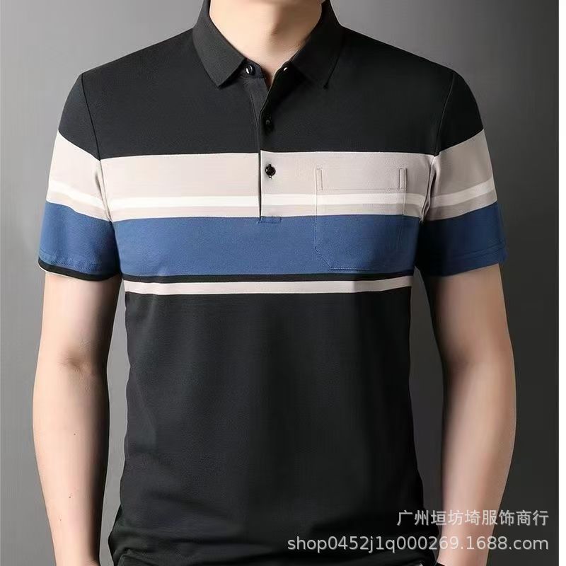 중년 및 노인 여름 순수 코튼 남성 반팔 폴로 스트라이프 티셔츠 리얼 포켓 라펠 캐주얼 아빠 폴로 셔츠