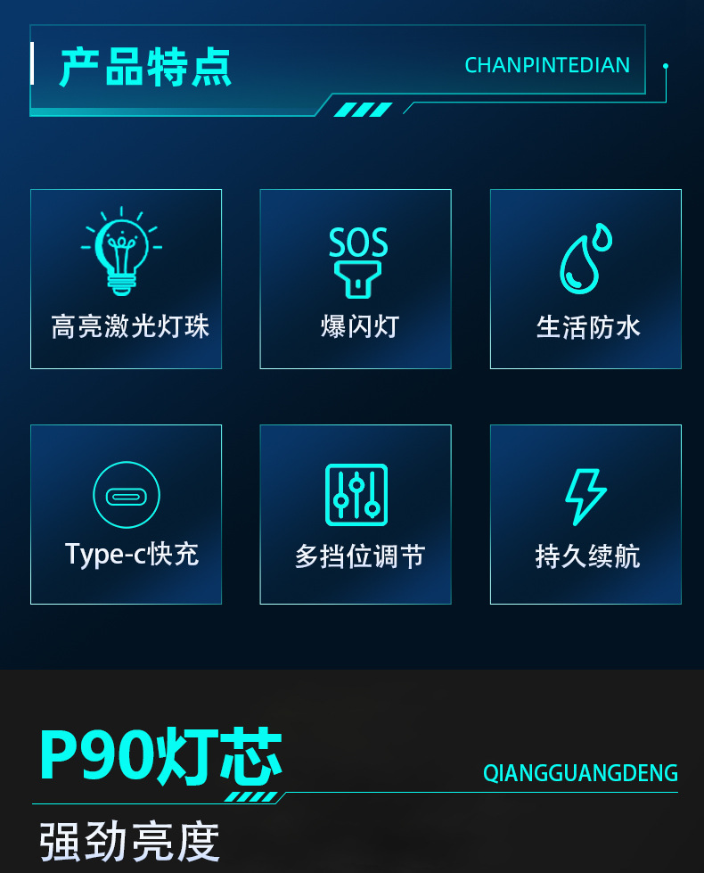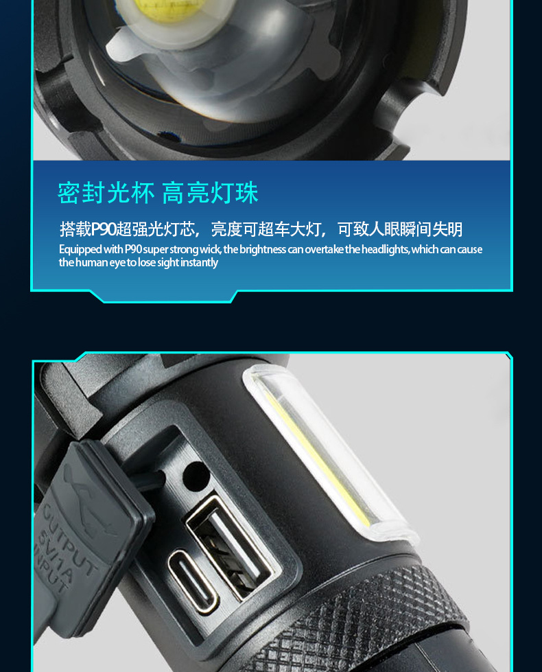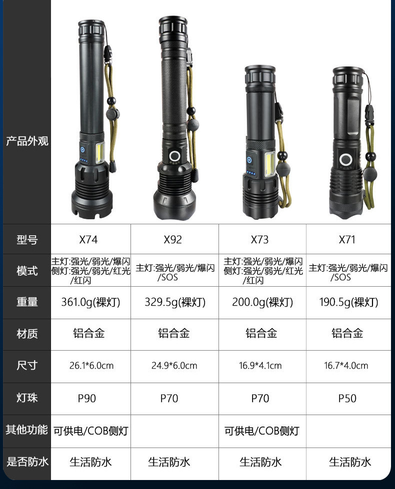 국경 간 P90 손전등 알루미늄 합금 텔레스코픽 줌 충전식 손전등 야외 장거리 조명 야간 낚시 조명스토어 가기