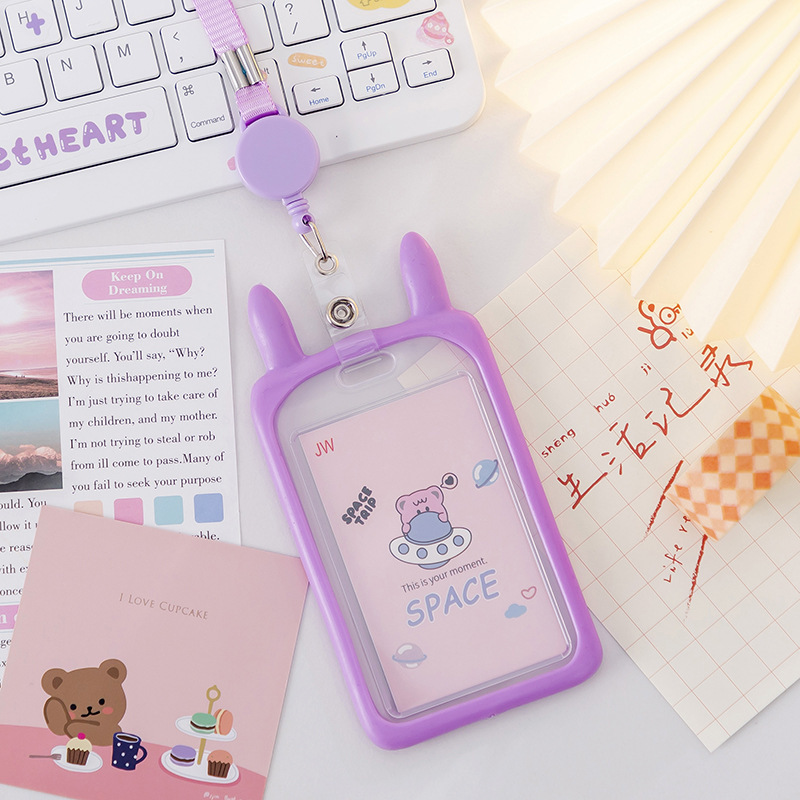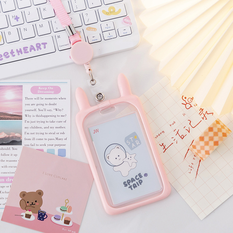 귀여운 만화 토끼 귀 어린이 범용 카드 홀더 소녀의 심장 개폐식 끈 학교 카드 식사 카드 ID 카드 홀더