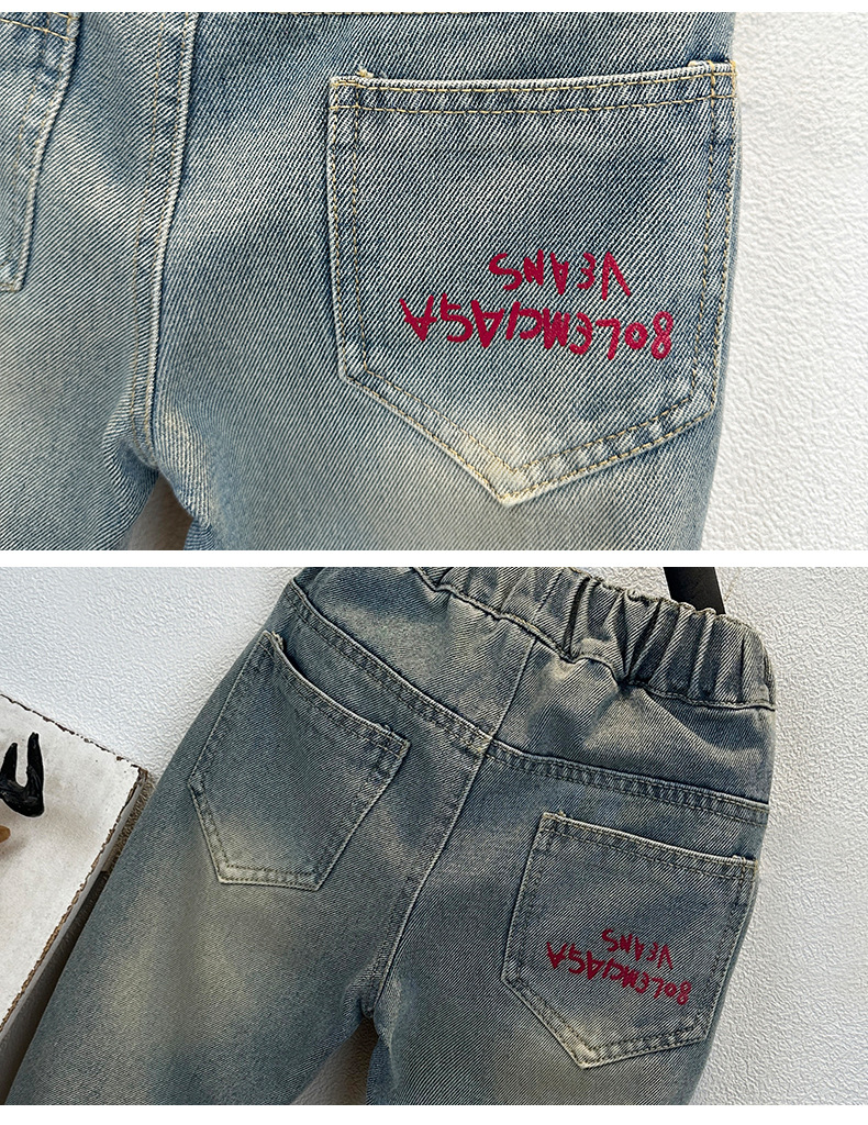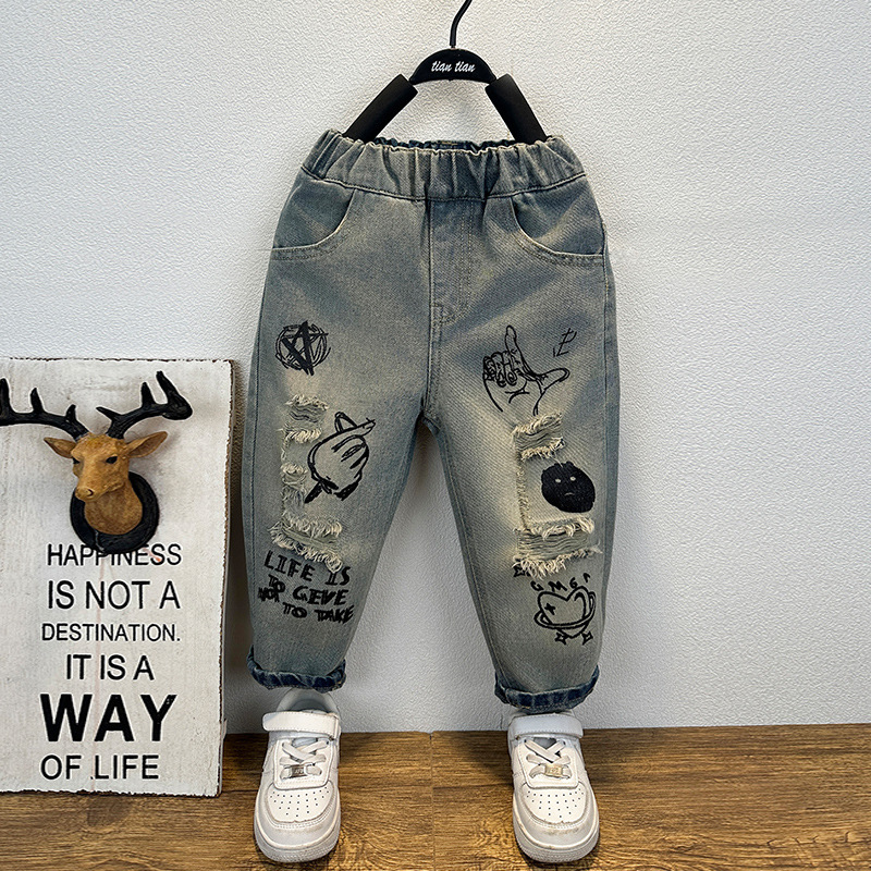 남아용 그래피티 데님 팬츠, 가을 스타일 아동복, 수출용 남아 바지, 한국 스타일 학생 캐주얼 데님 롱 팬츠