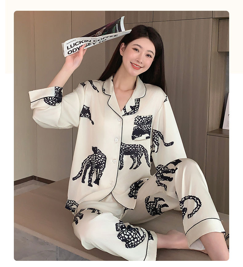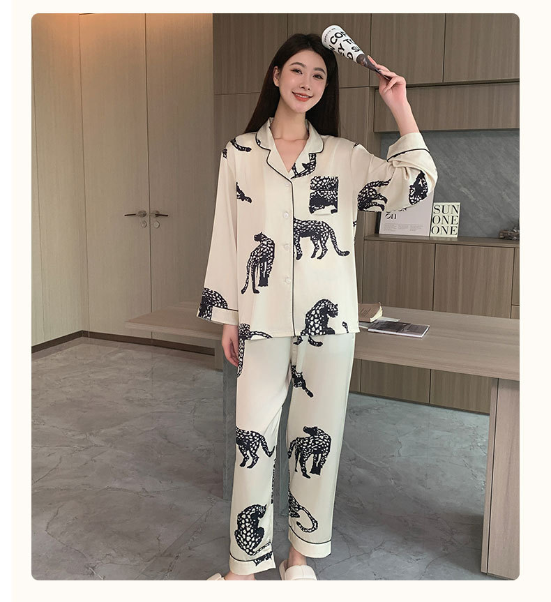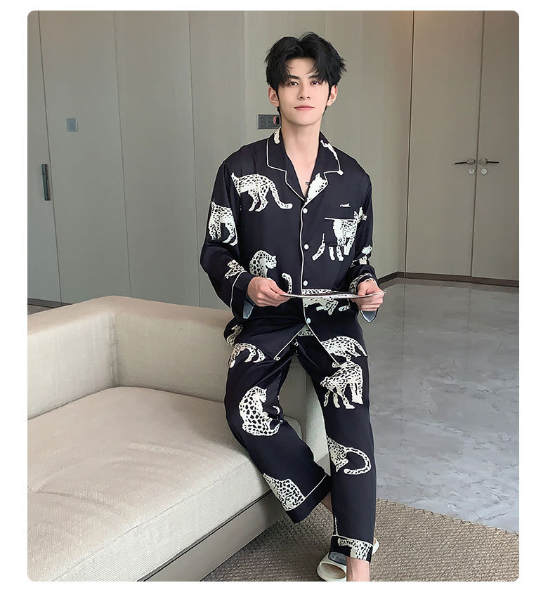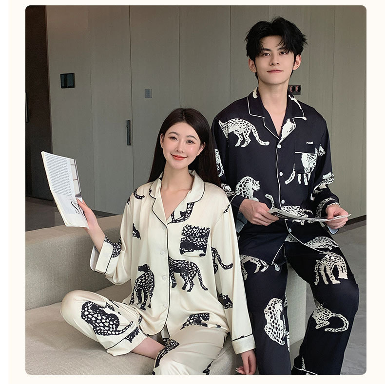[타이거 샤오 표범 그림자] 커플 잠옷 여성 봄과 가을 아이스 실크 긴소매 세트 남성 플러스 사이즈 인조 실크 홈웨어스토어 가기