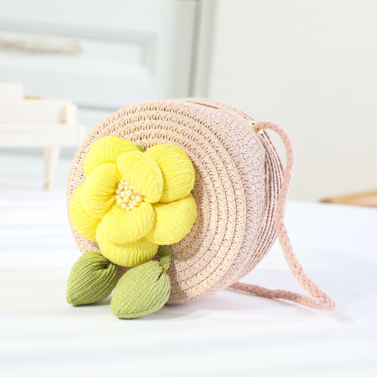 • 노란 꽃 작은 둥근 가방 핑크