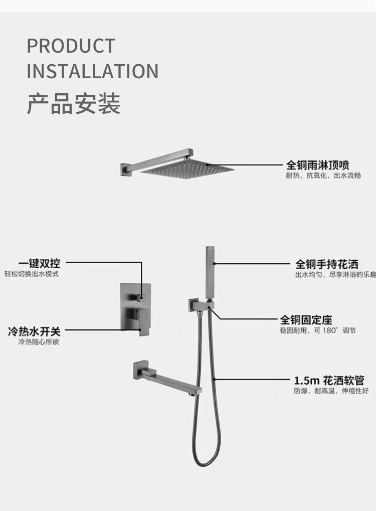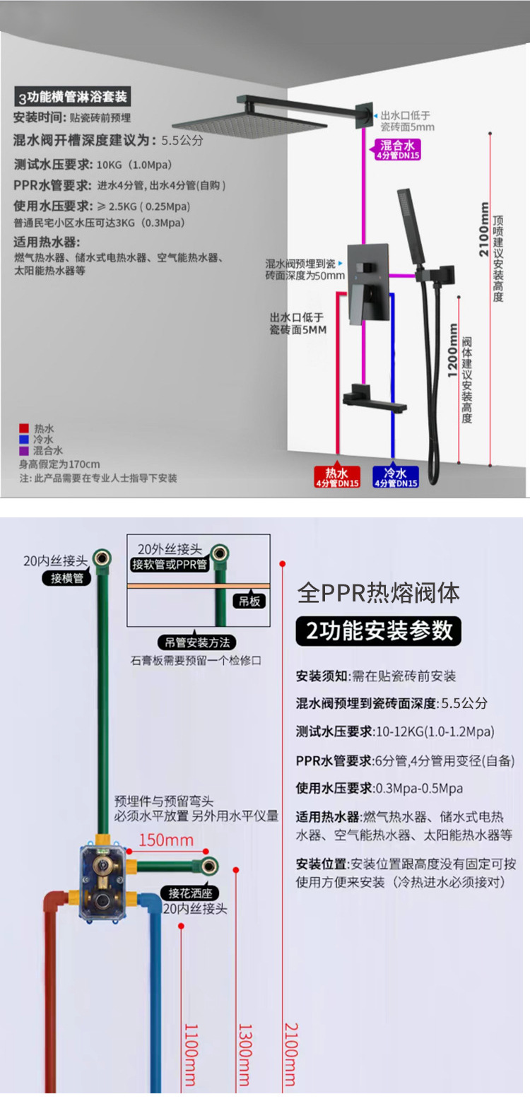 일체형 열융착 PPR 매립형 벽걸이 샤워기 세트, 사전 설치형 샤워기 노즐