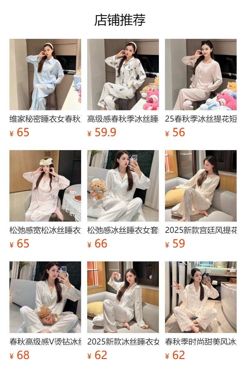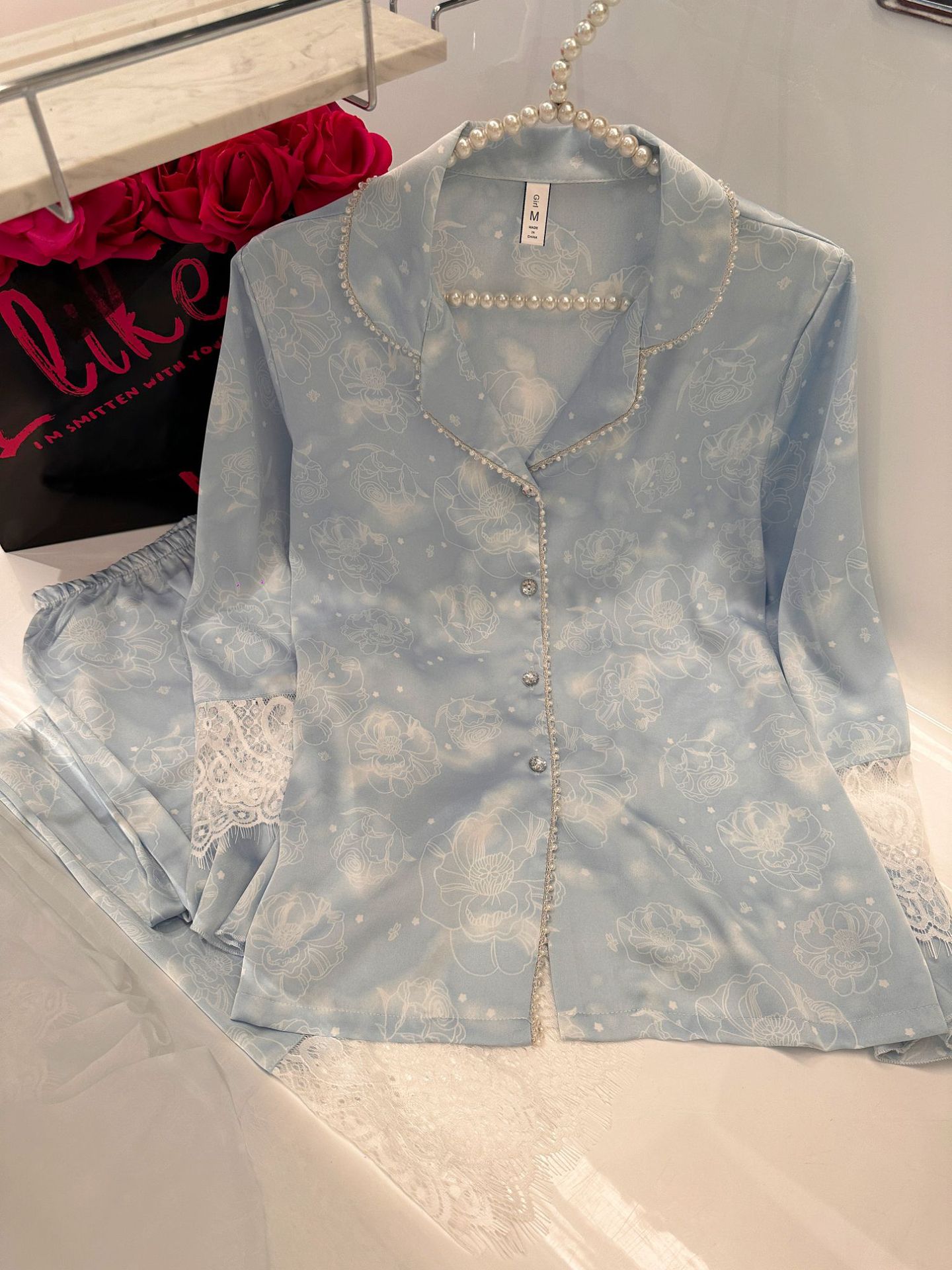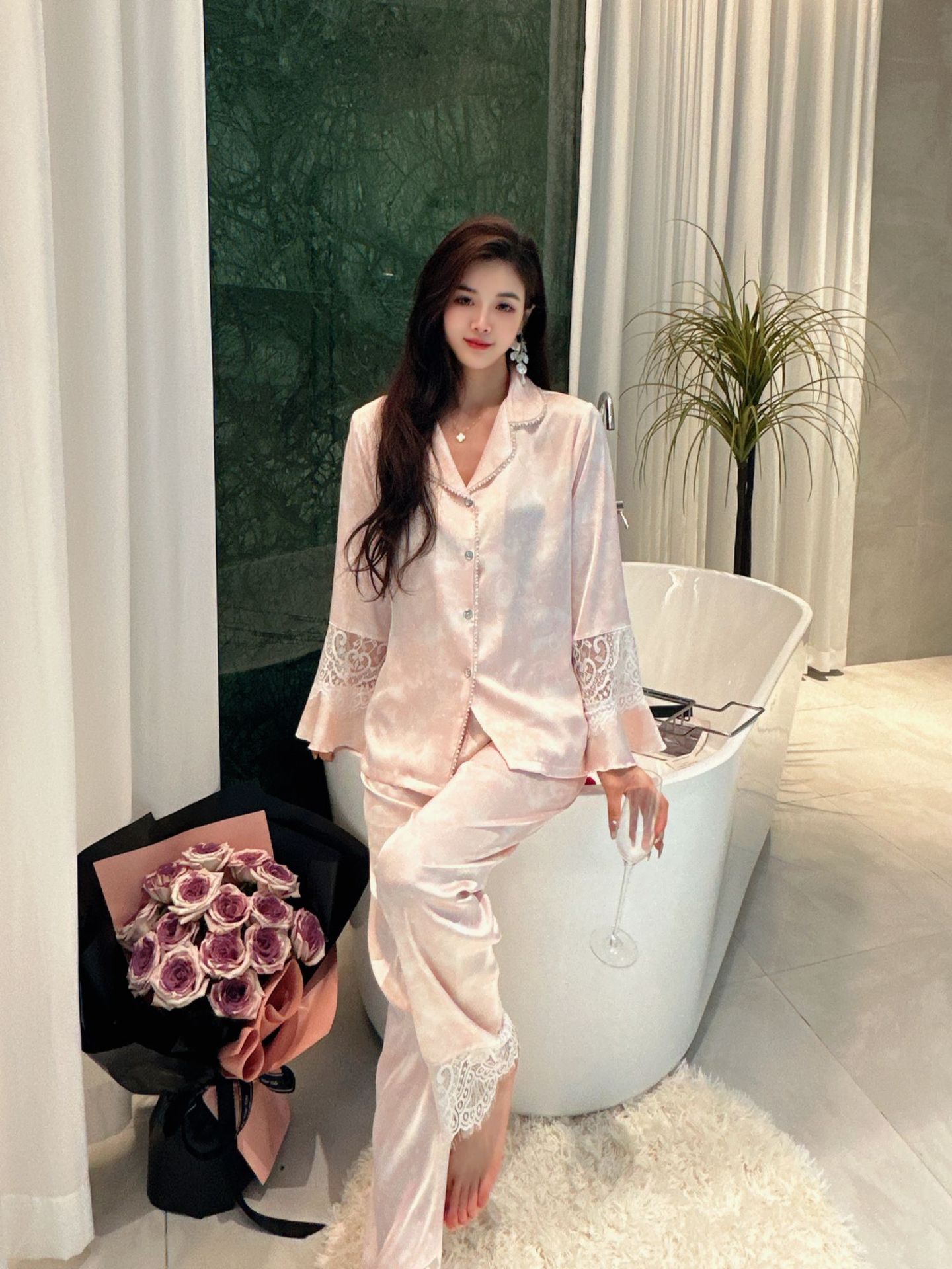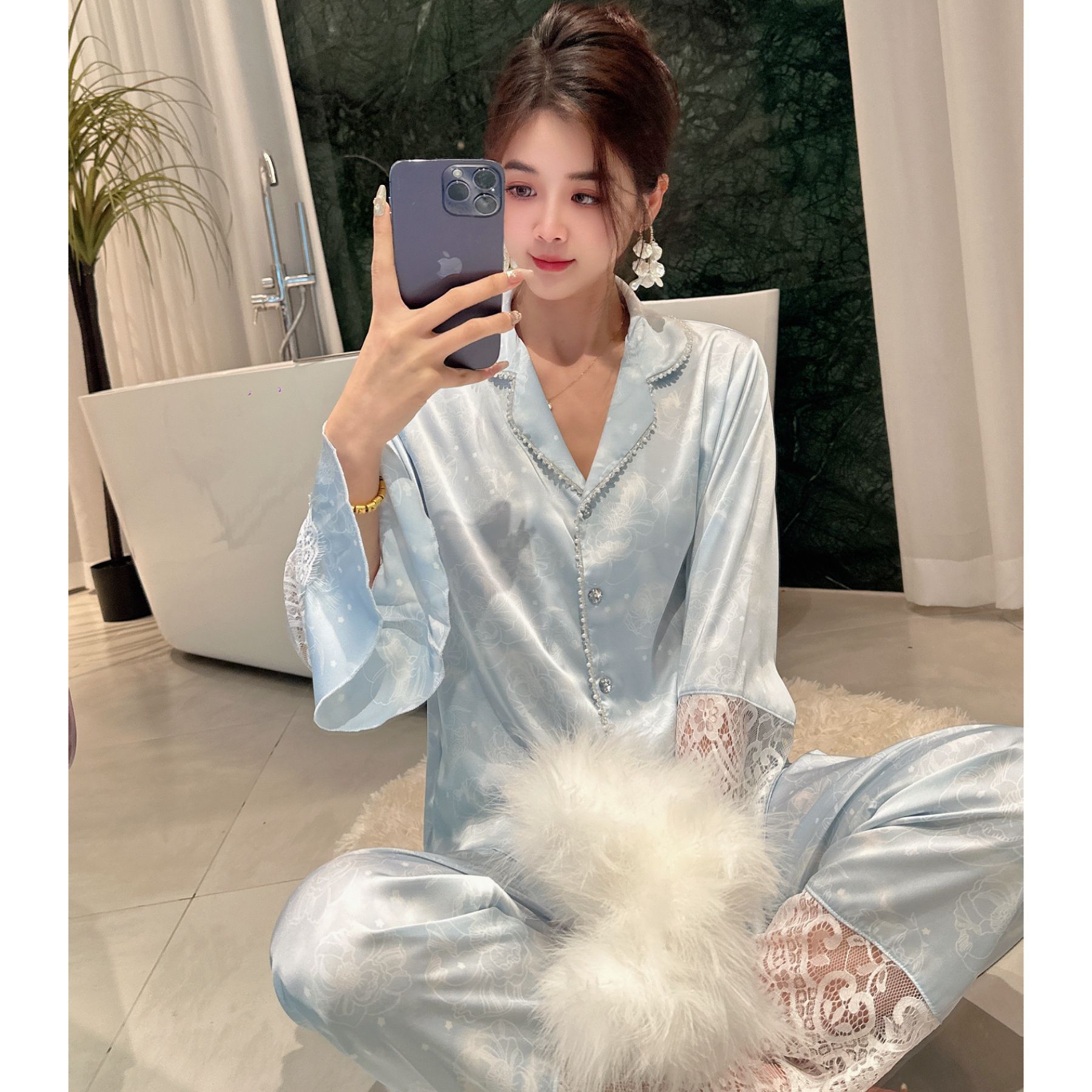 여성용 아이스 실크 잠옷 세트 봄 여름 비즈 레이스 홈웨어 긴팔 얇고 통기성 좋으며 외출 가능 편안함스토어 가기